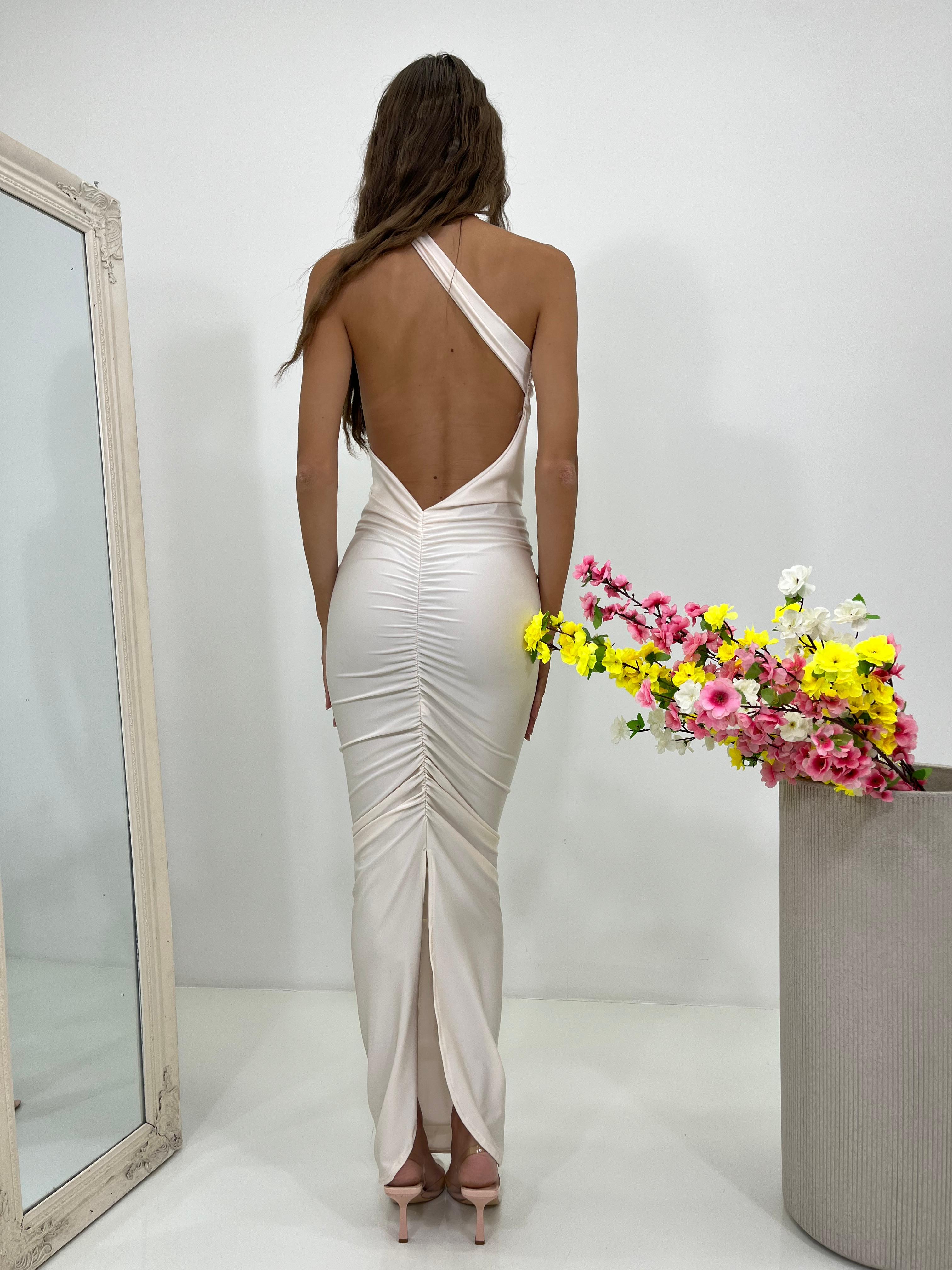 Vestito lungo in licra scollo schiena e aggrappatura posteriore