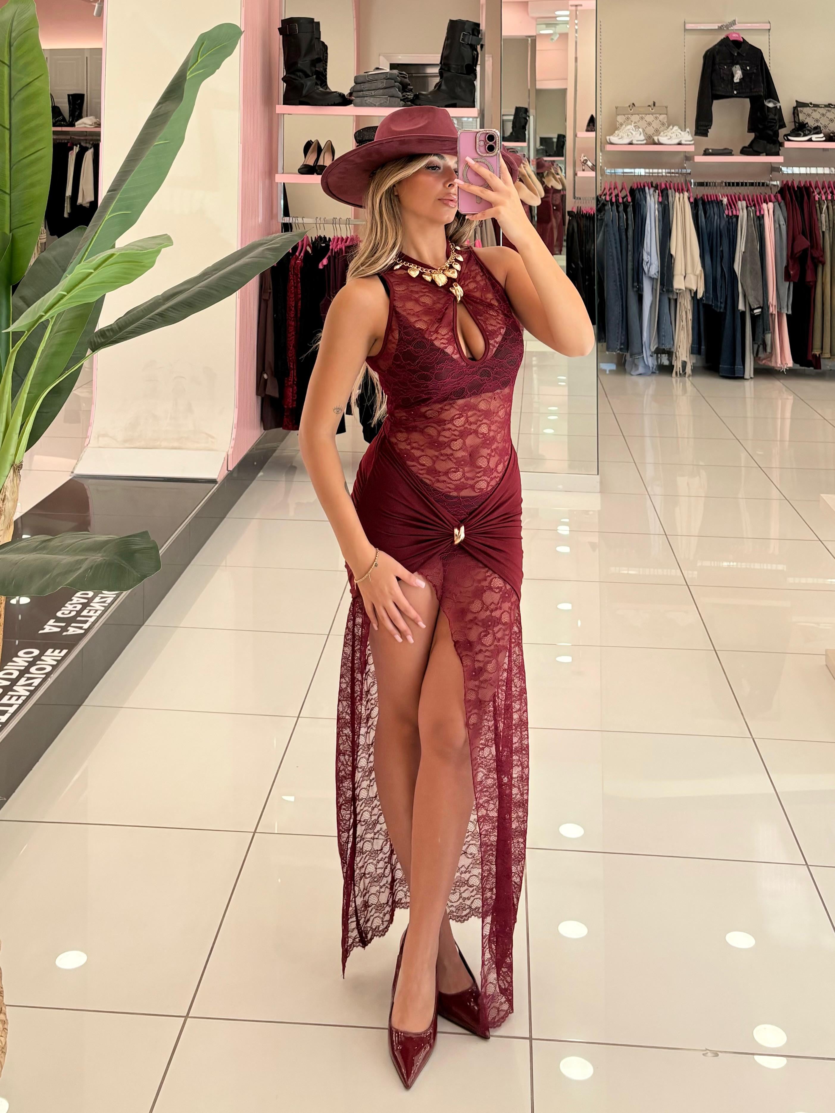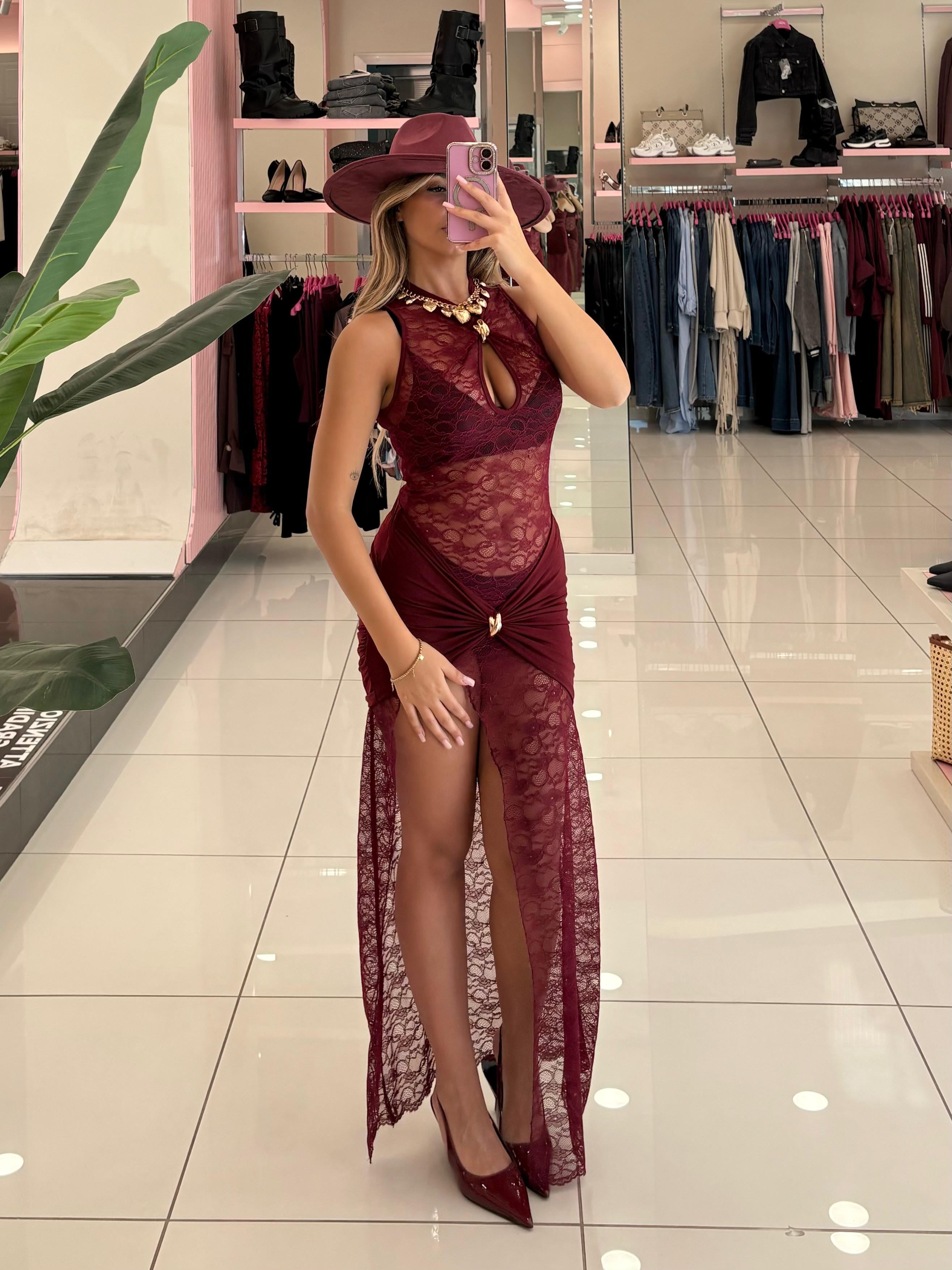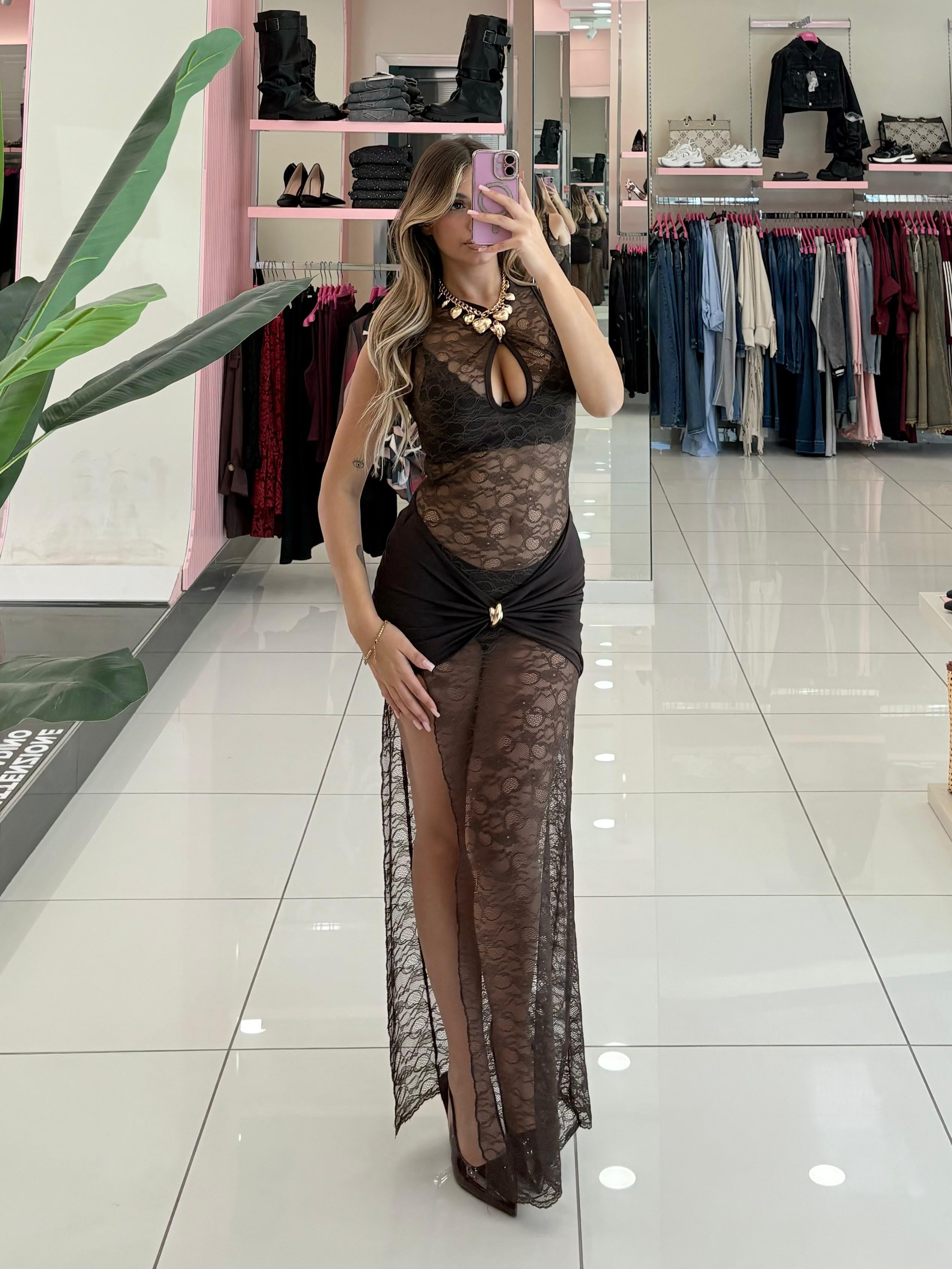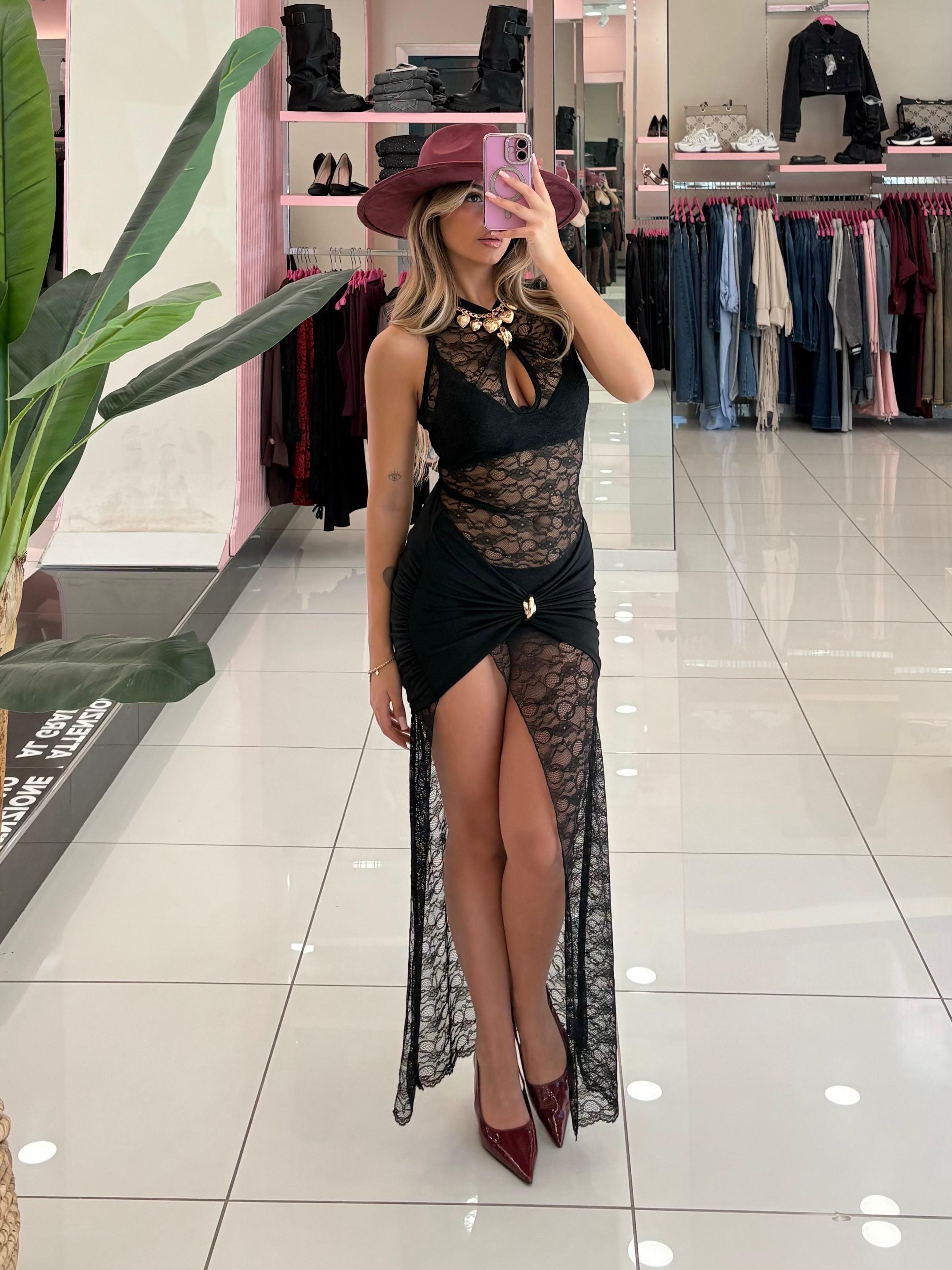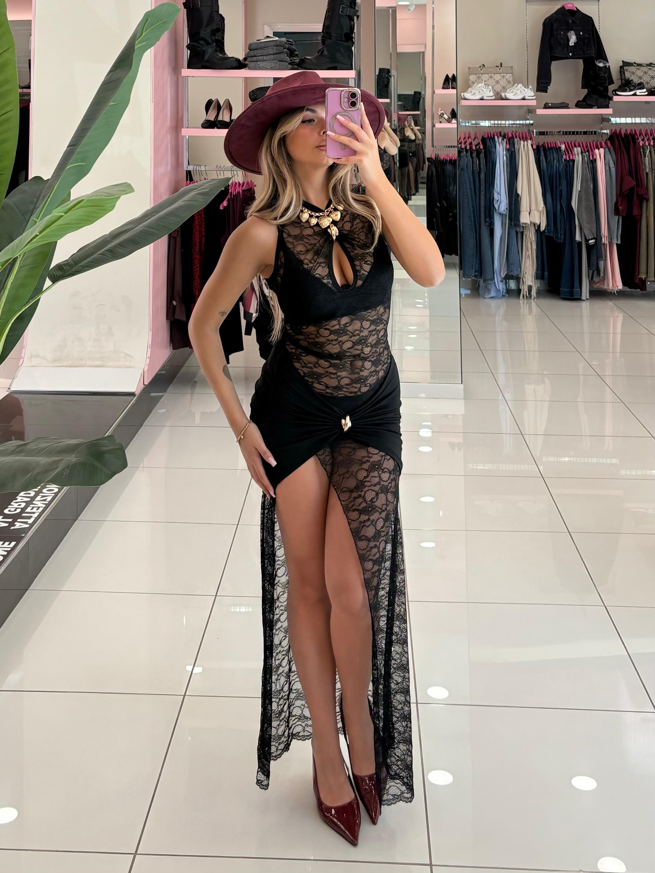 Vestito in pizzo traforato scollo goccia e dettaglio oro con gonna in licra coprente e spacco