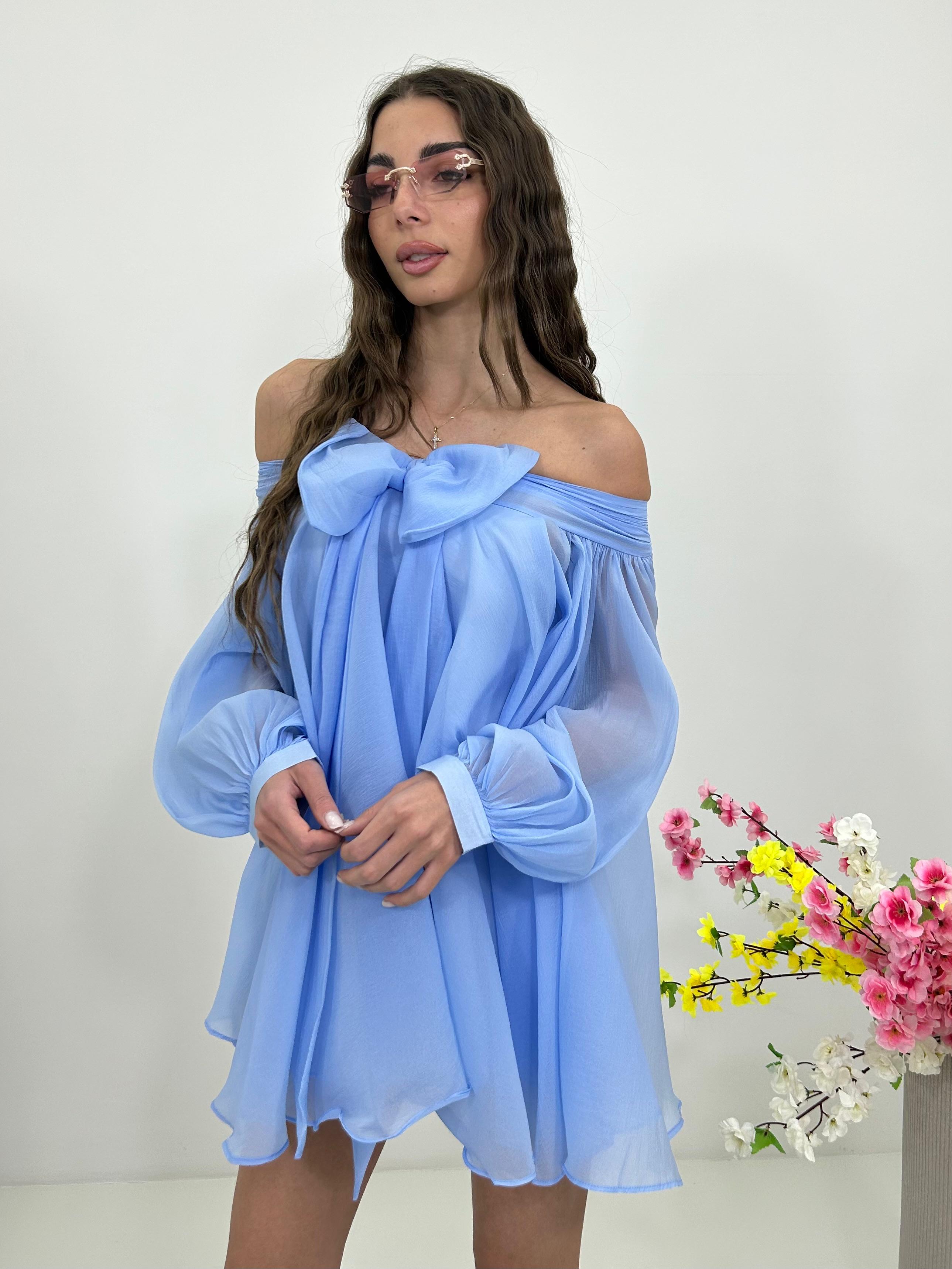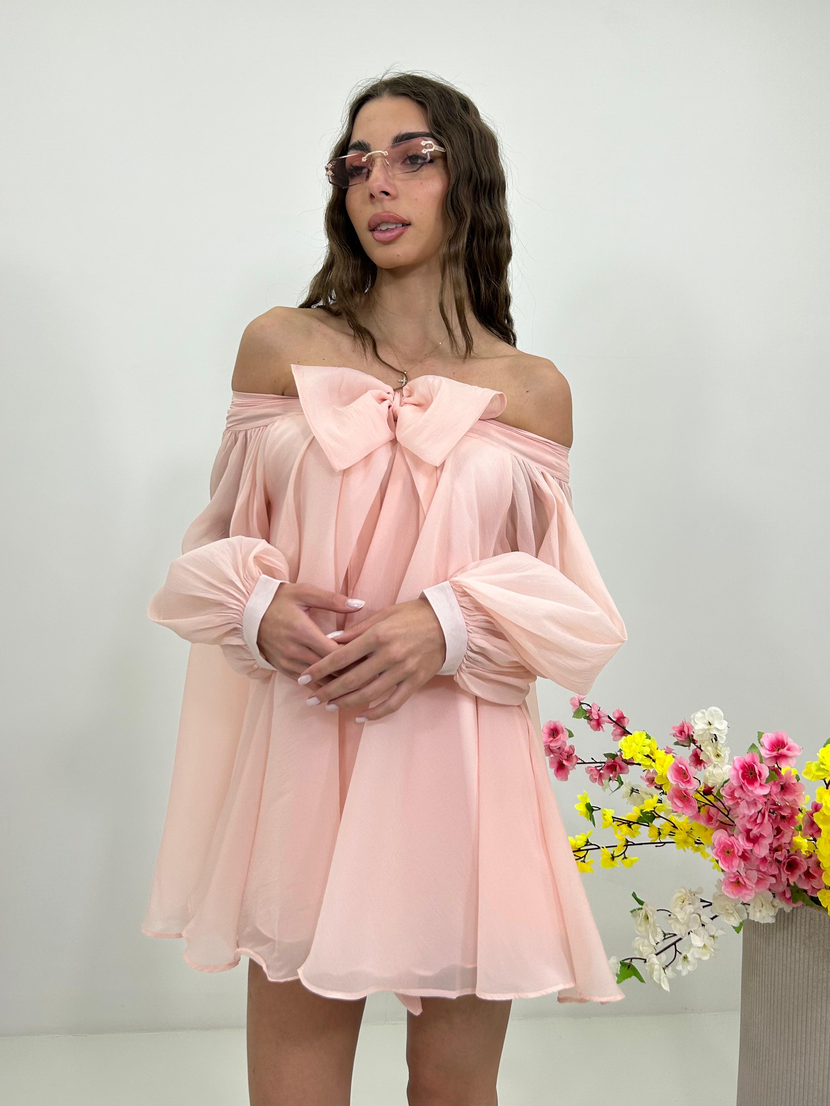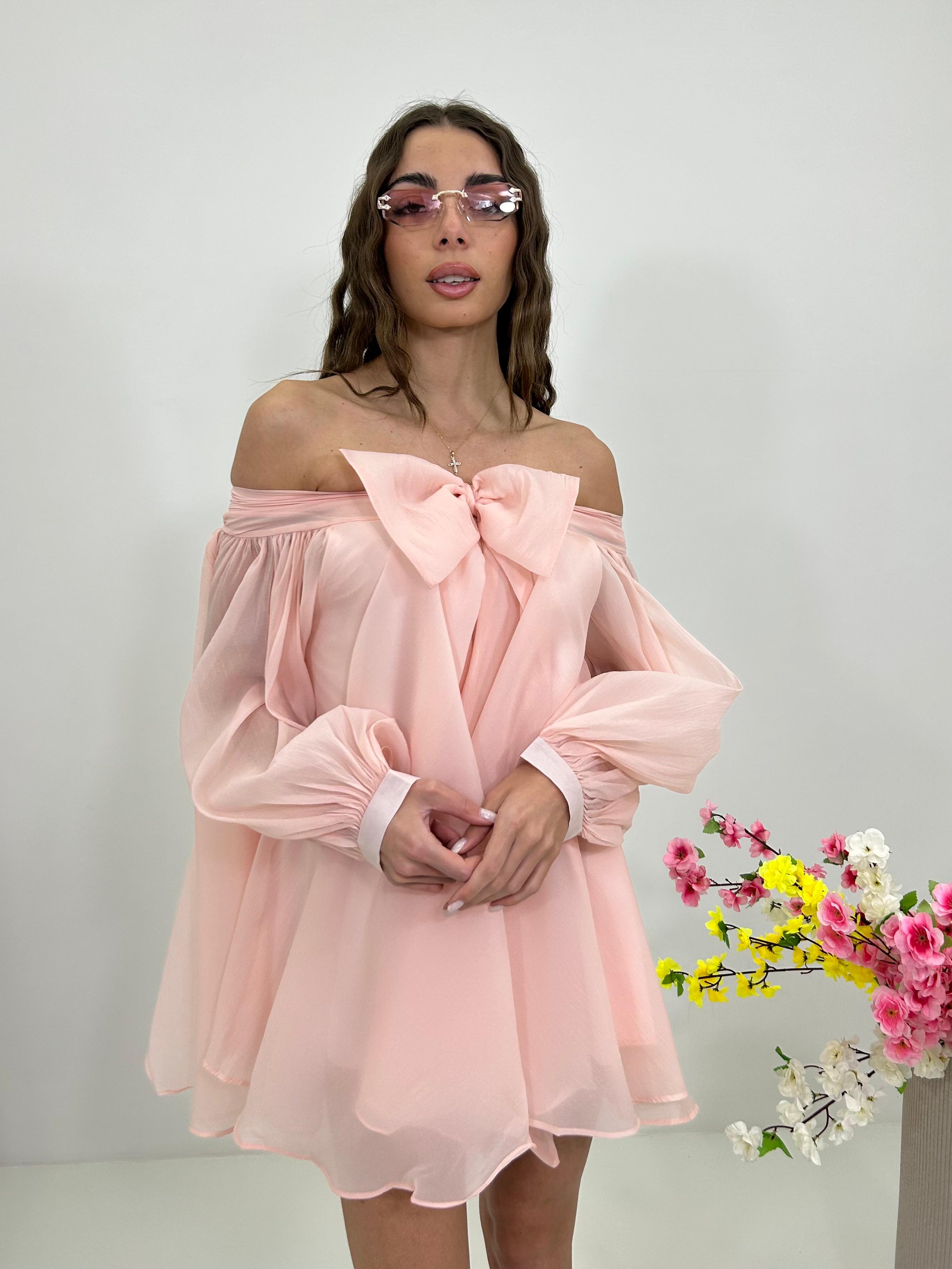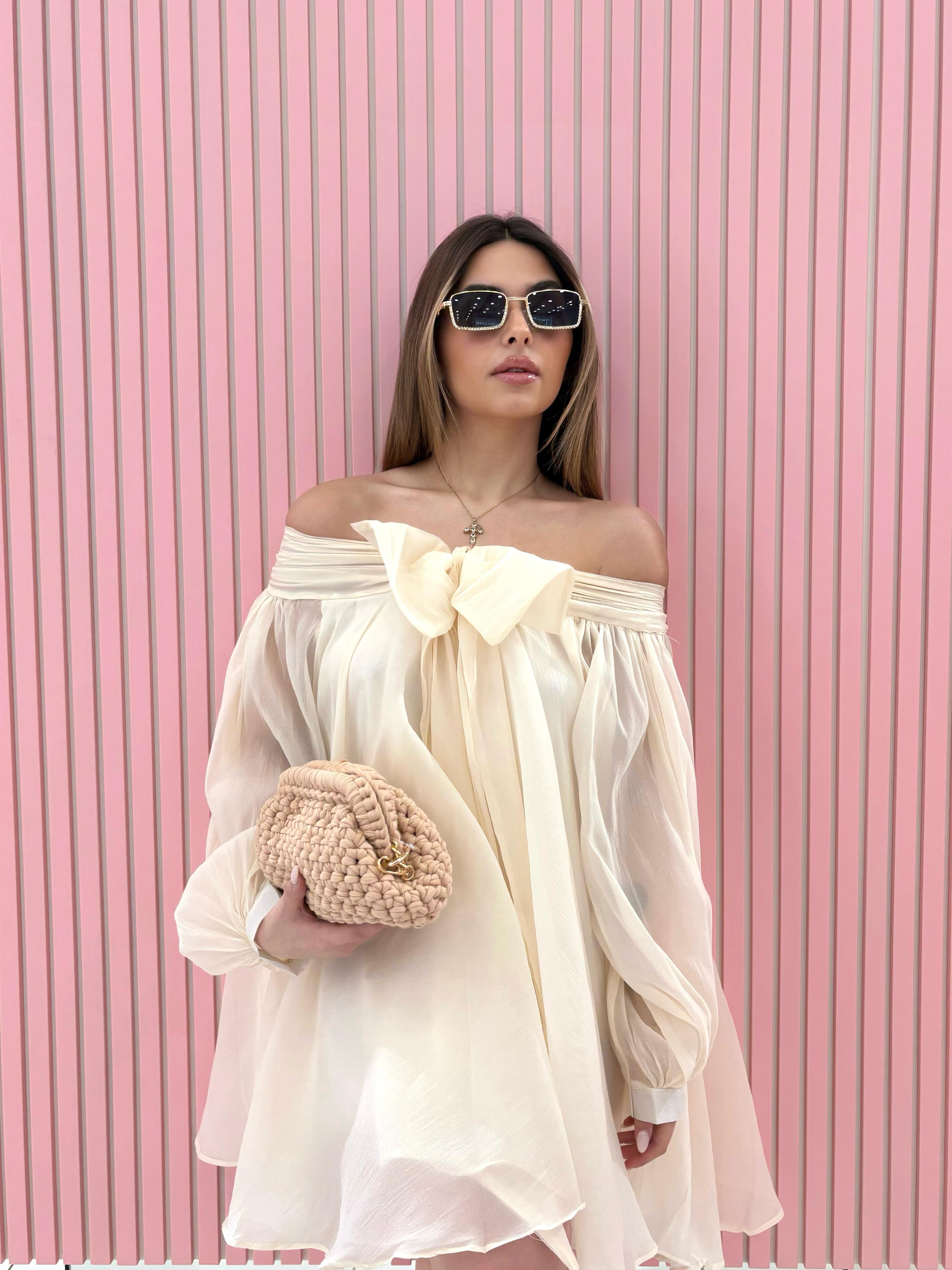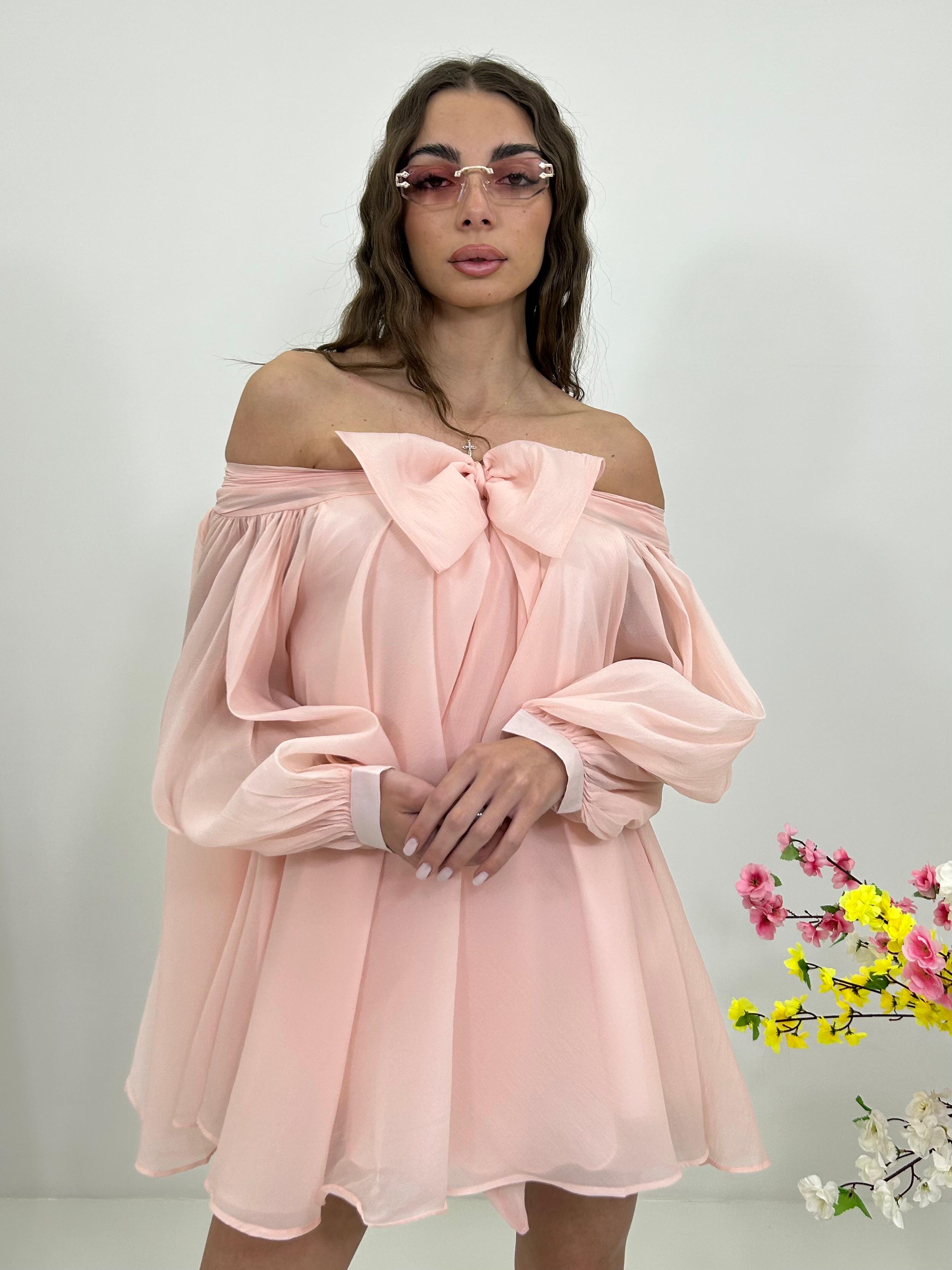 Vestitino velato scollo a barca con fiocco e fodera coprente