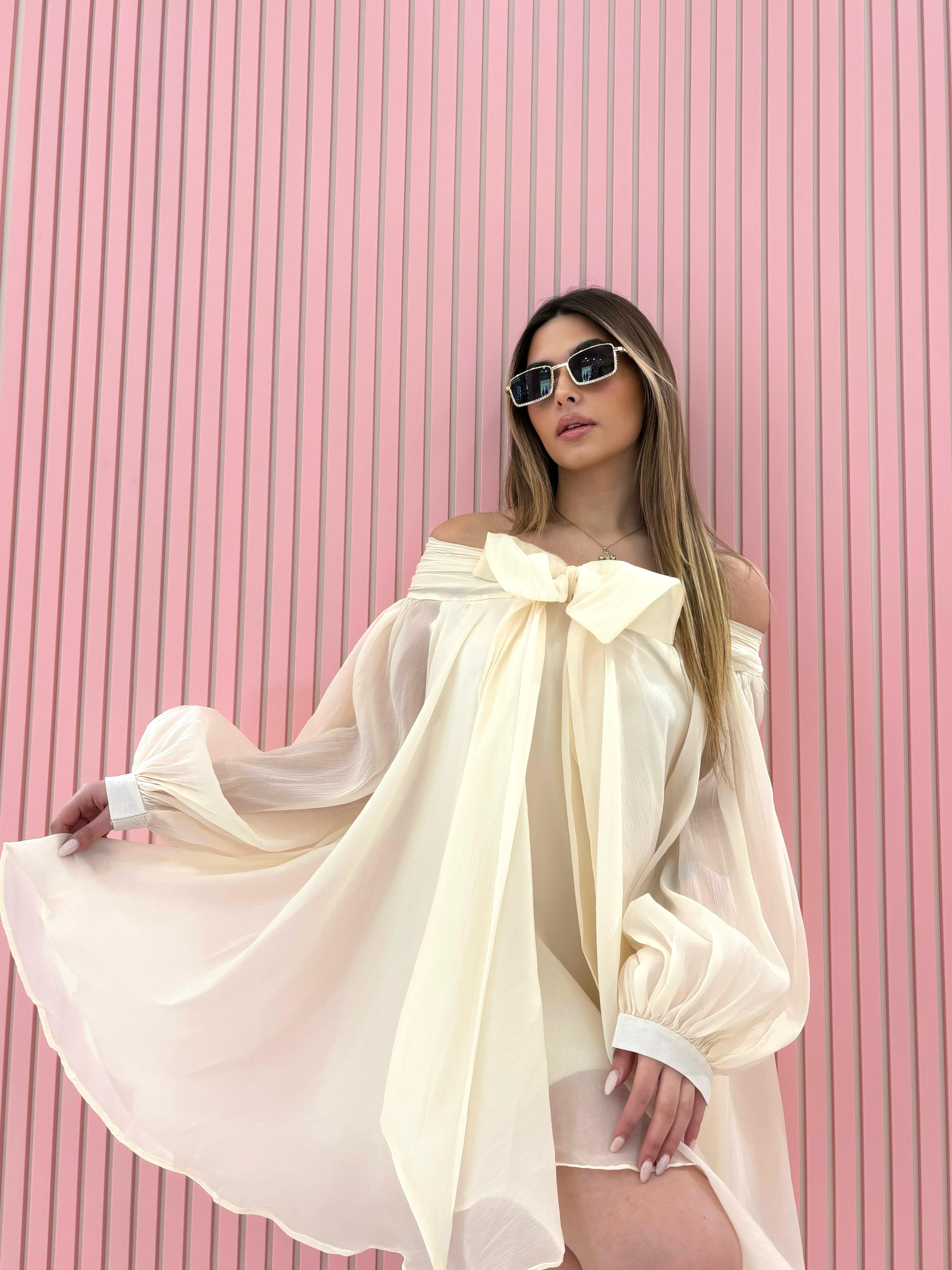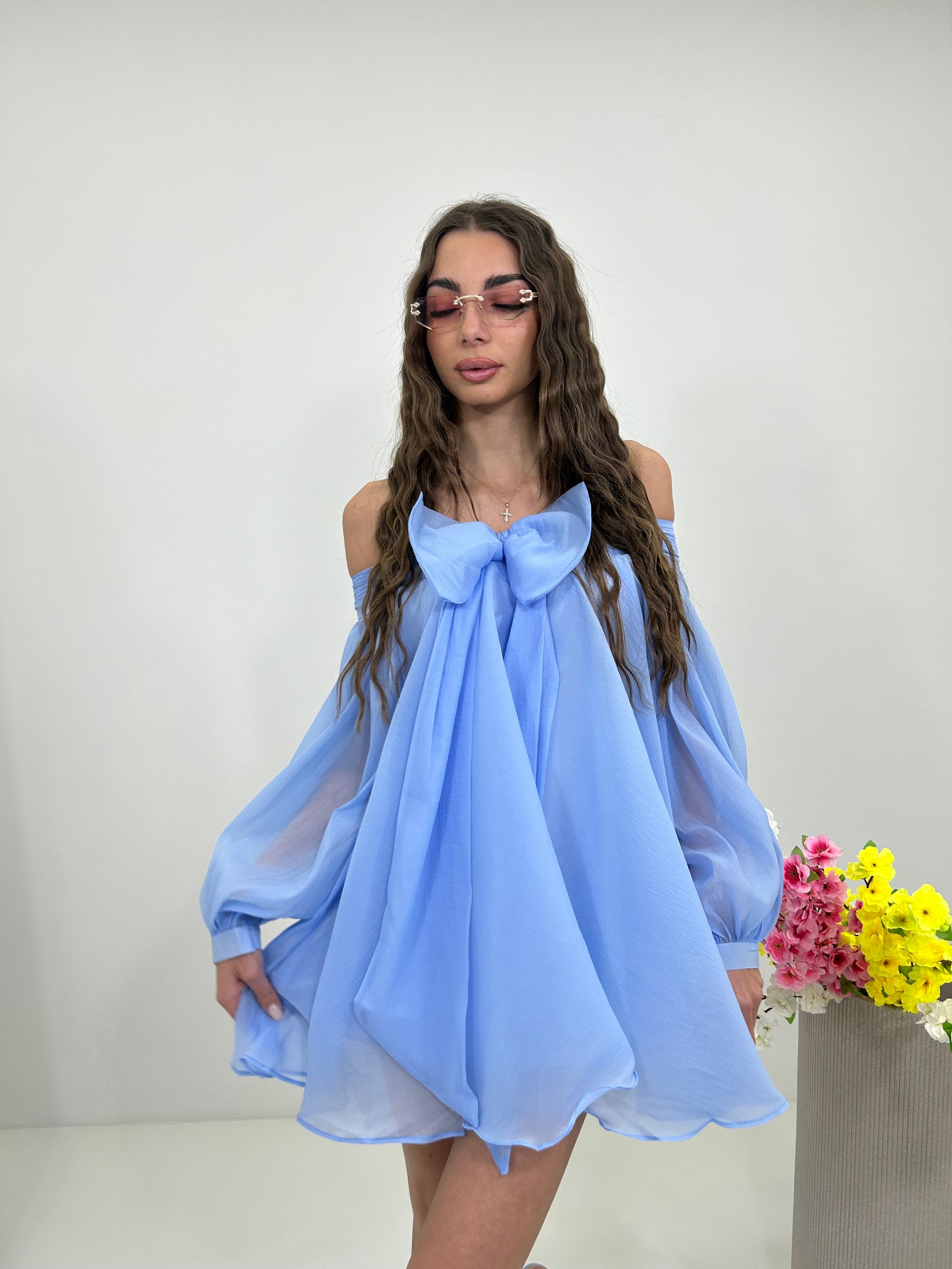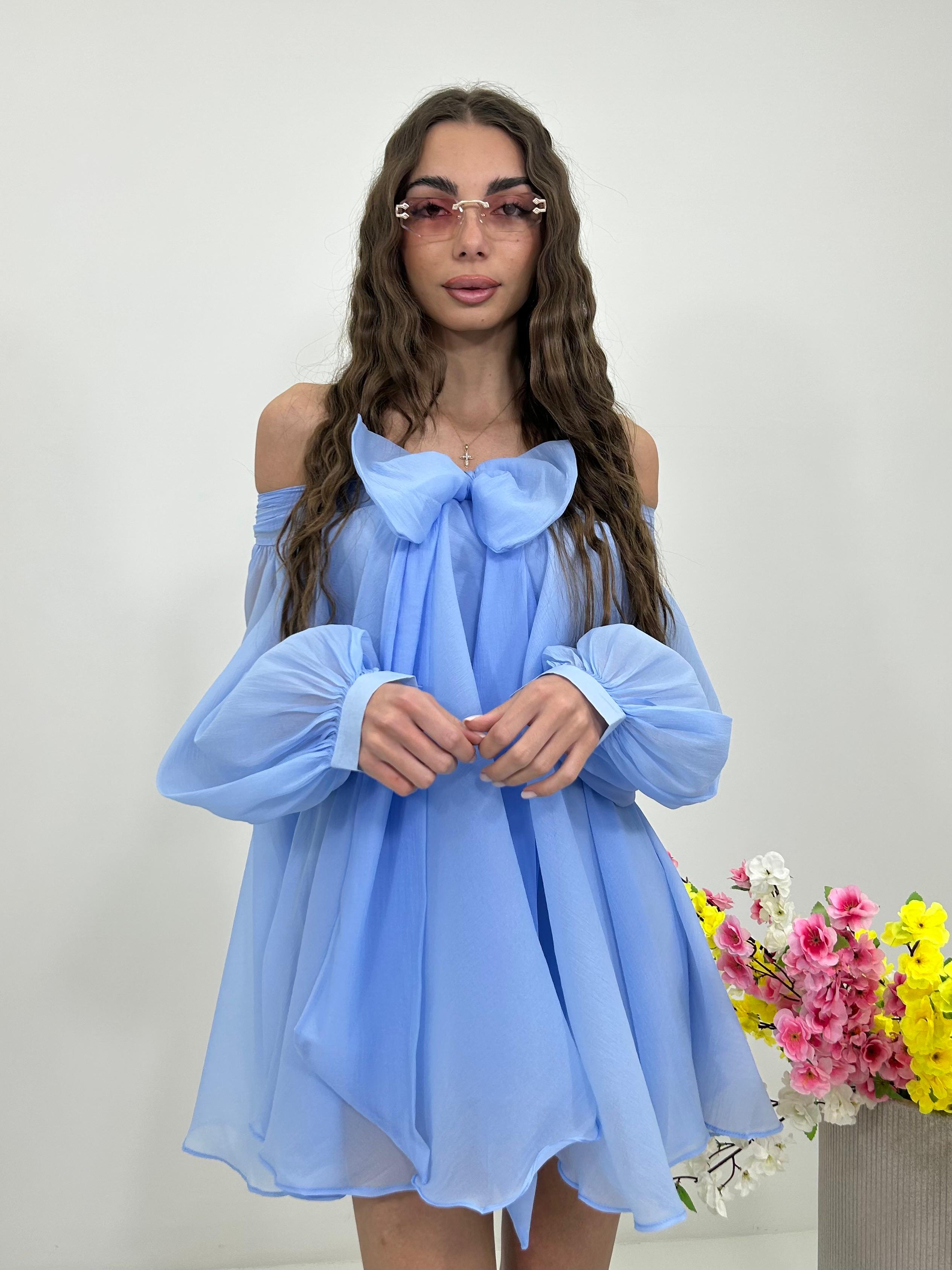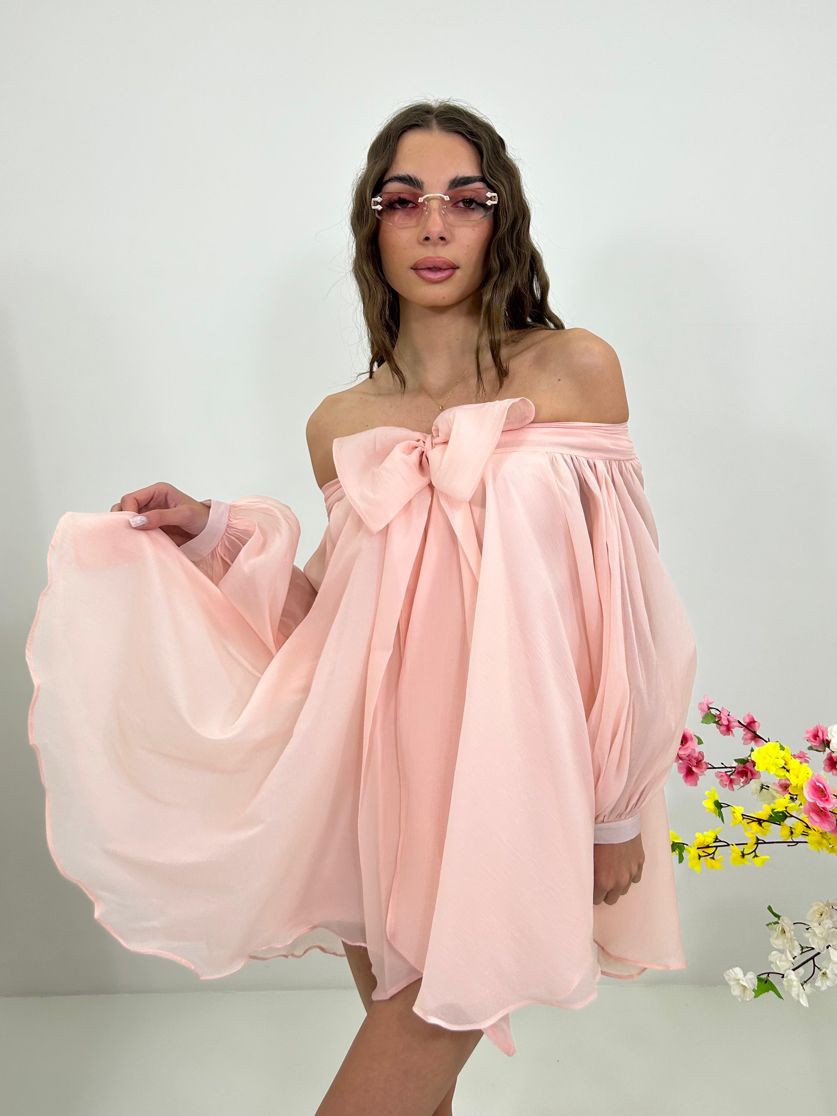 Vestitino velato scollo a barca con fiocco e fodera coprente