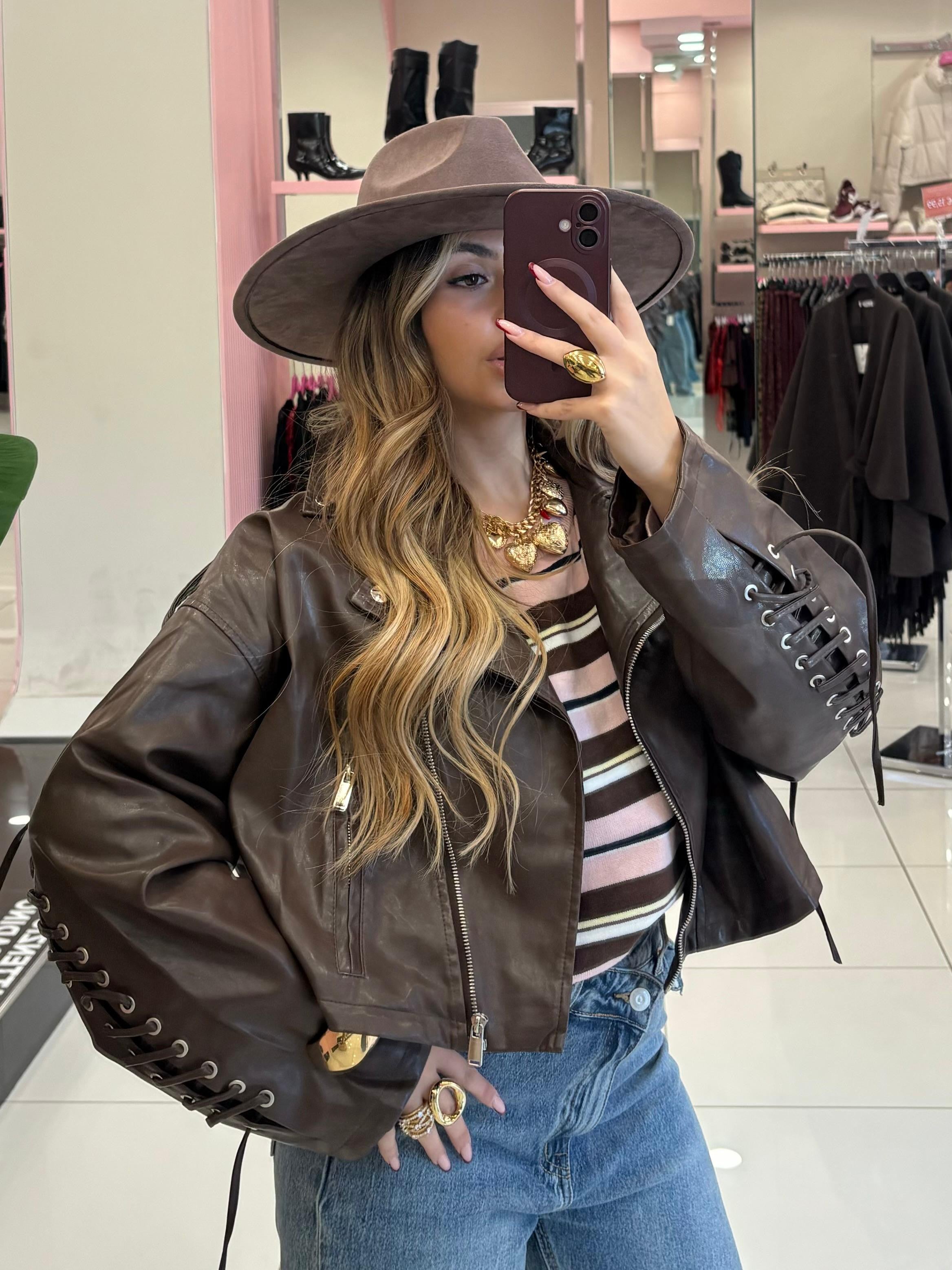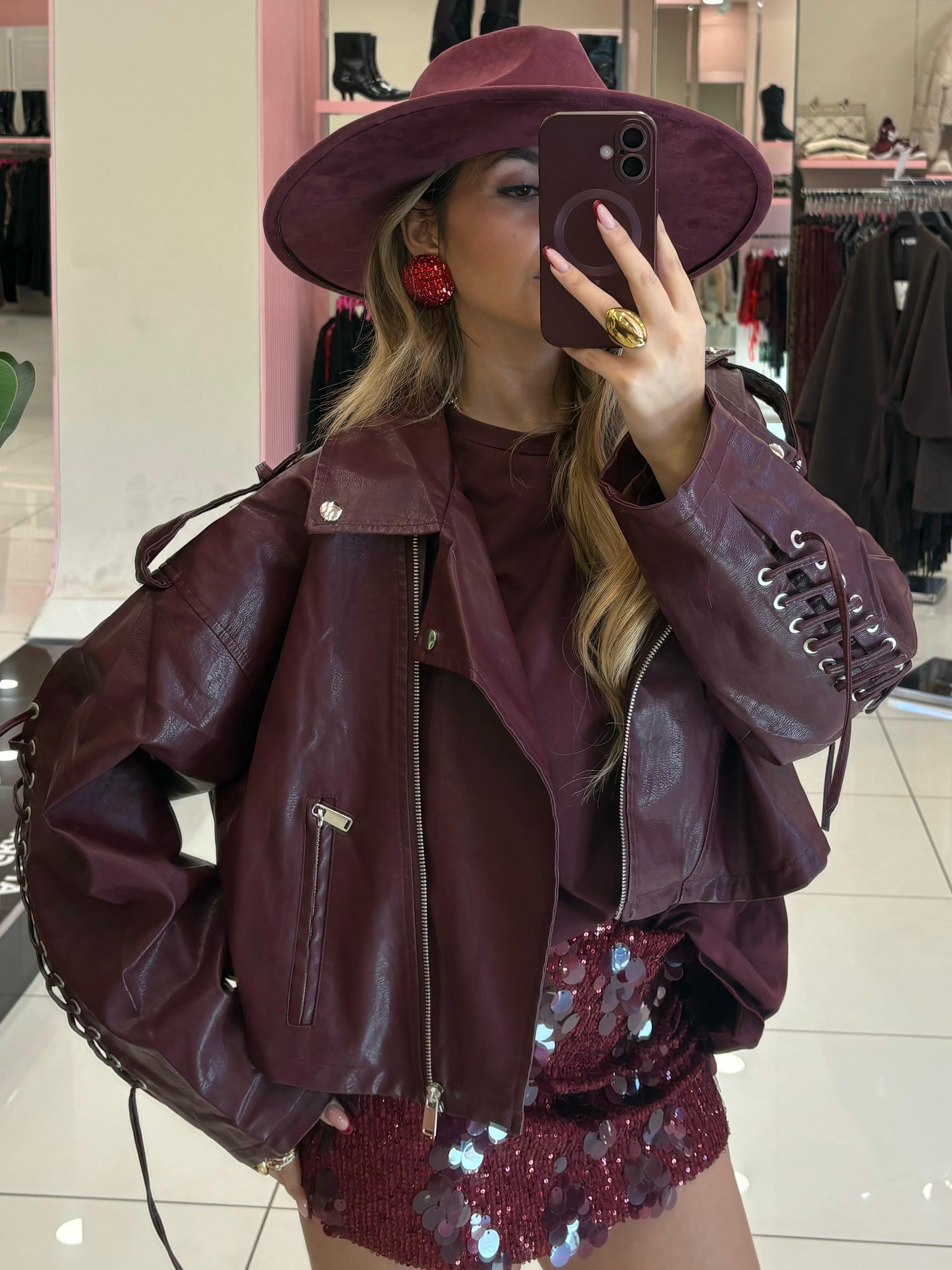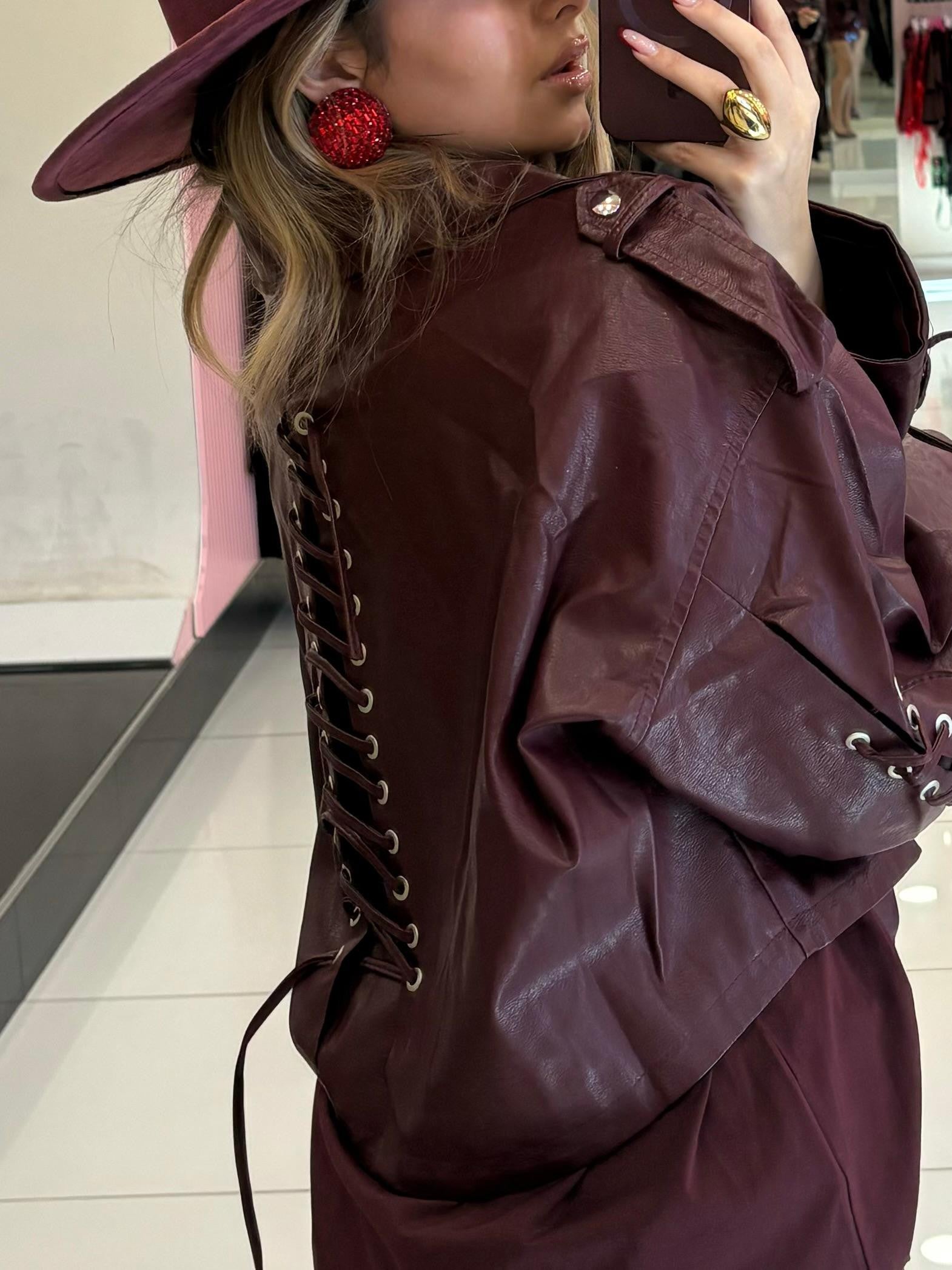 Chiodo in ecopelle con stringhe sulle maniche e posteriori