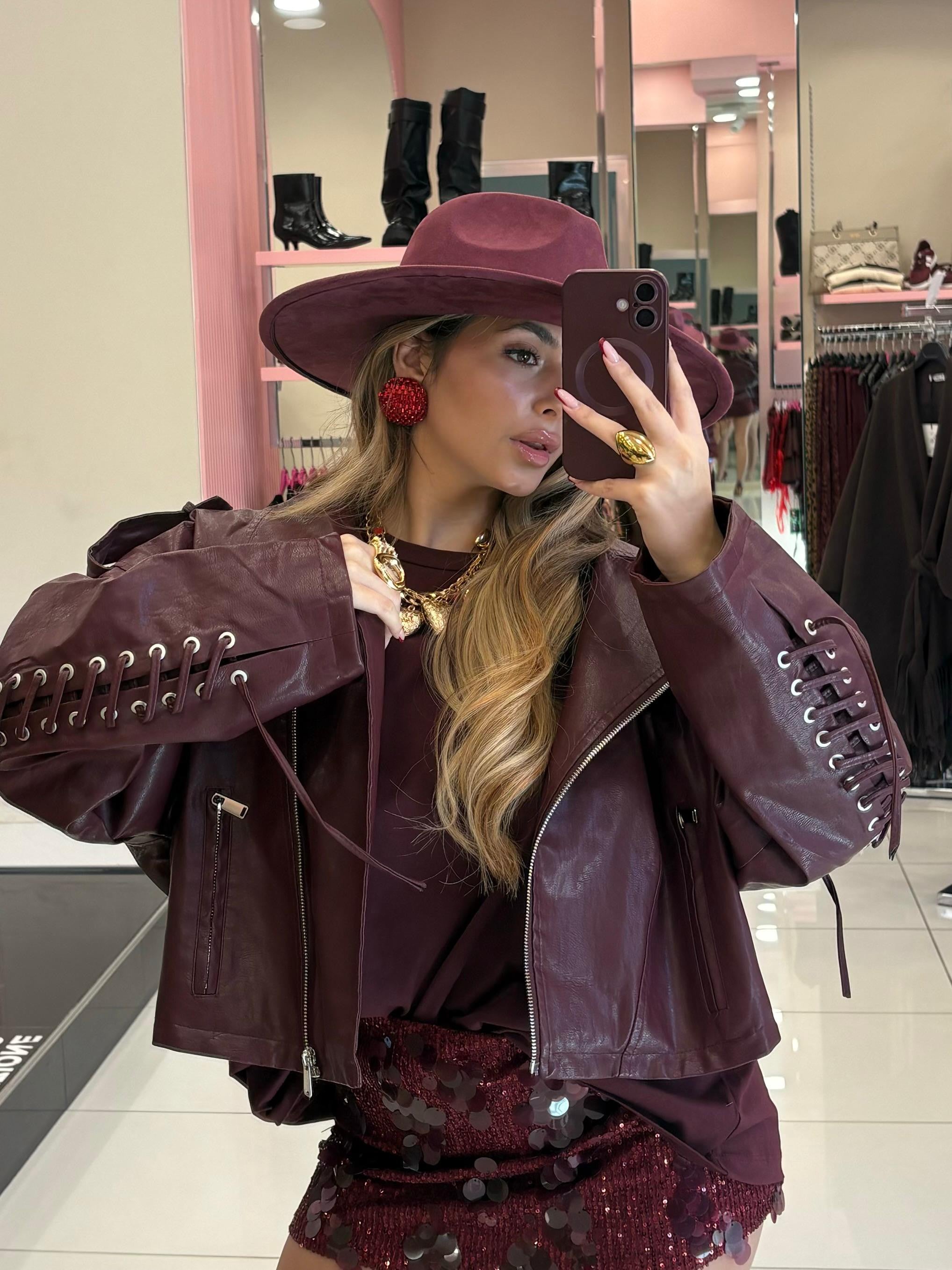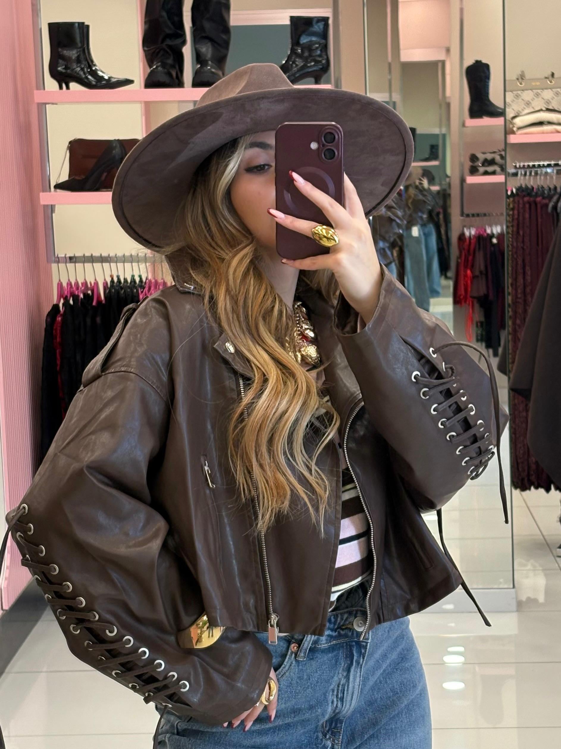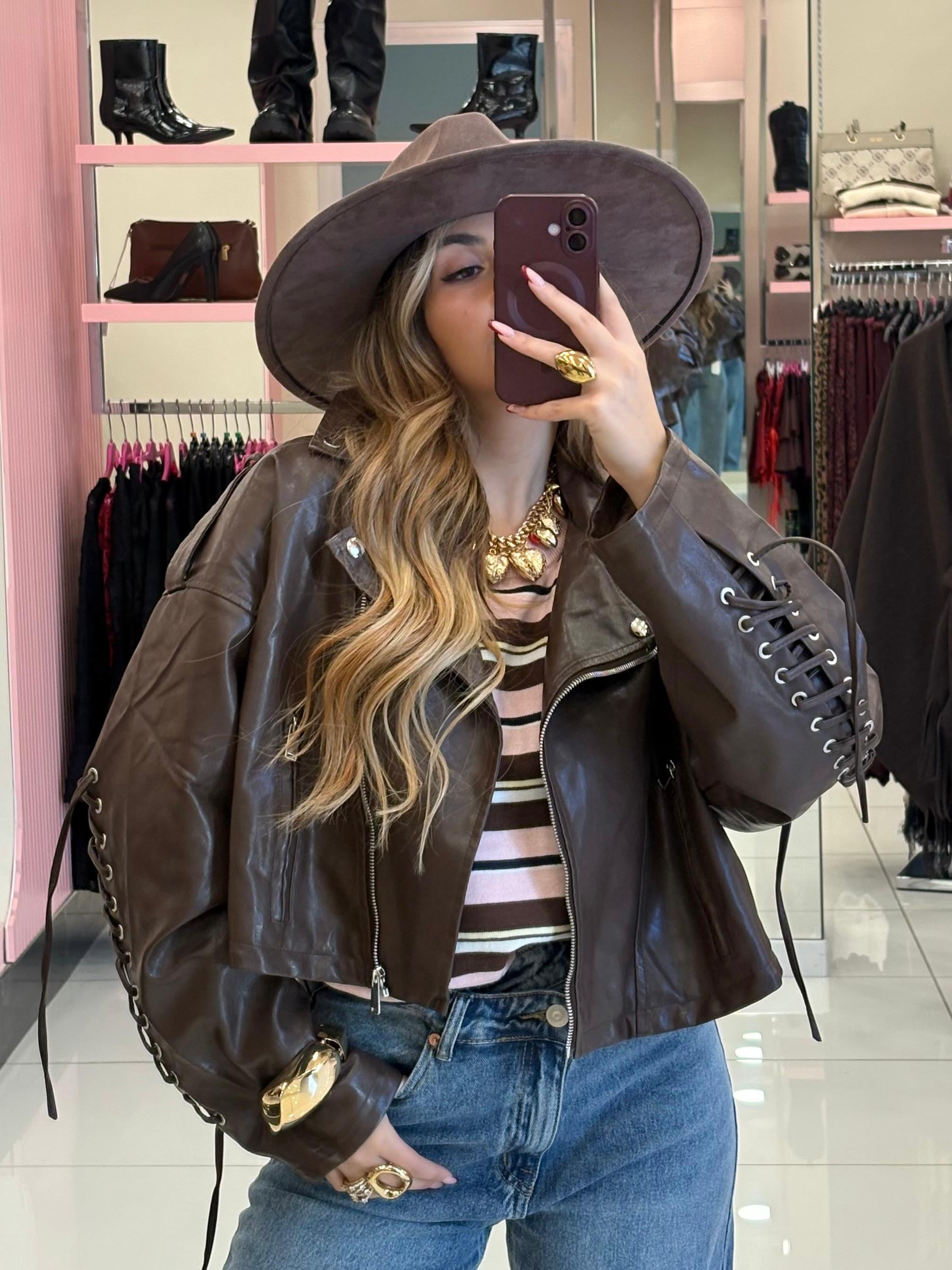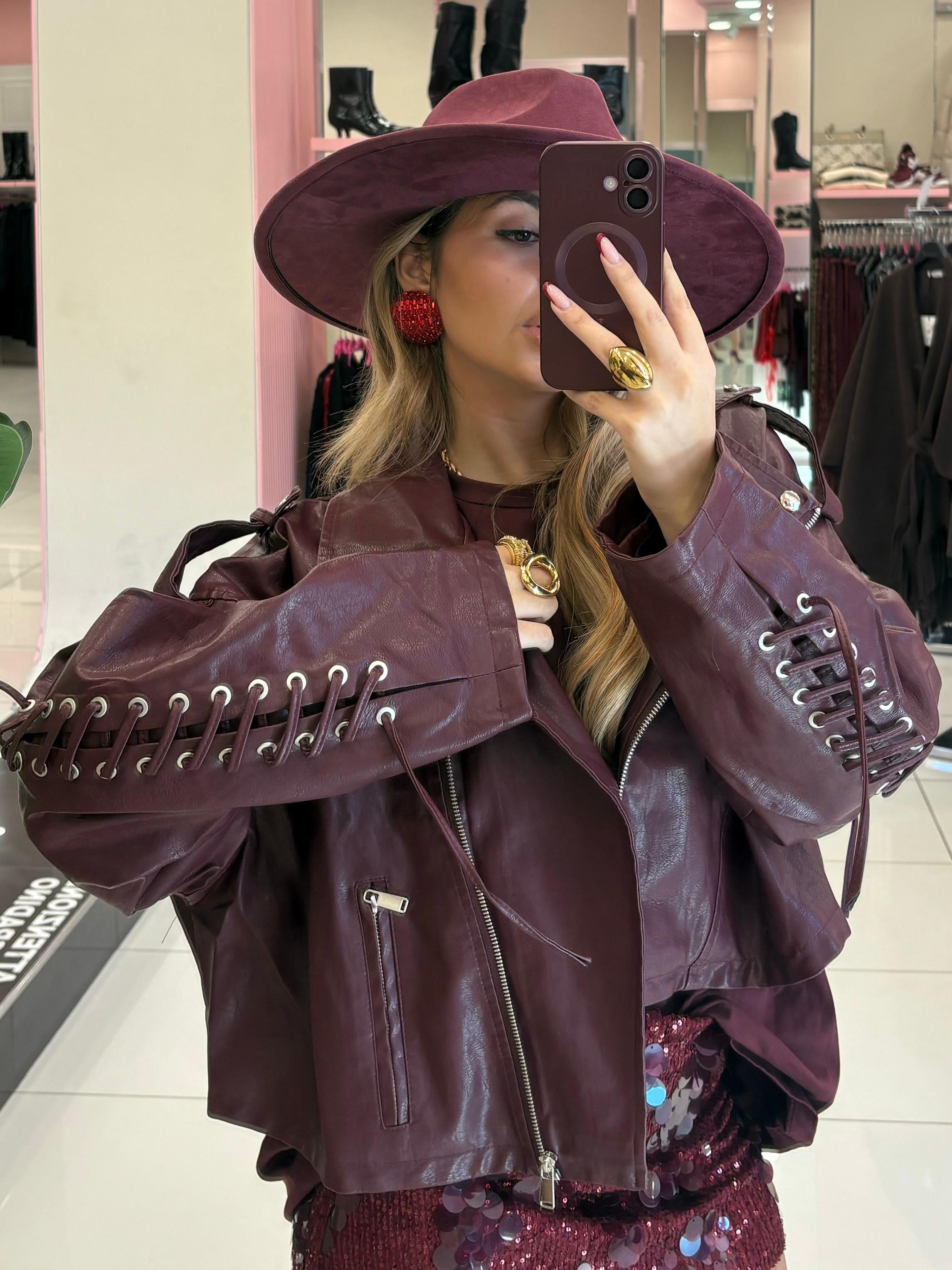 Chiodo in ecopelle con stringhe sulle maniche e posteriori