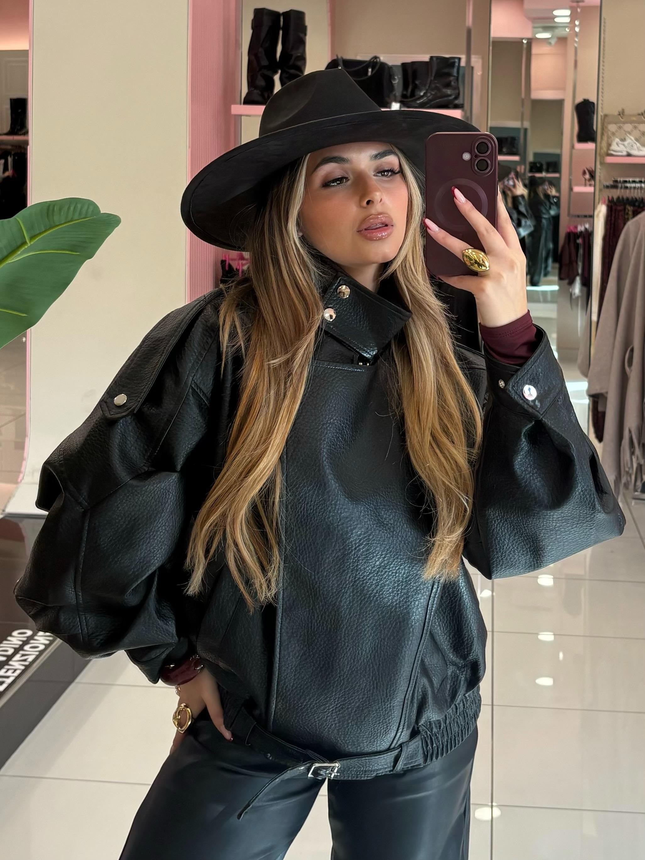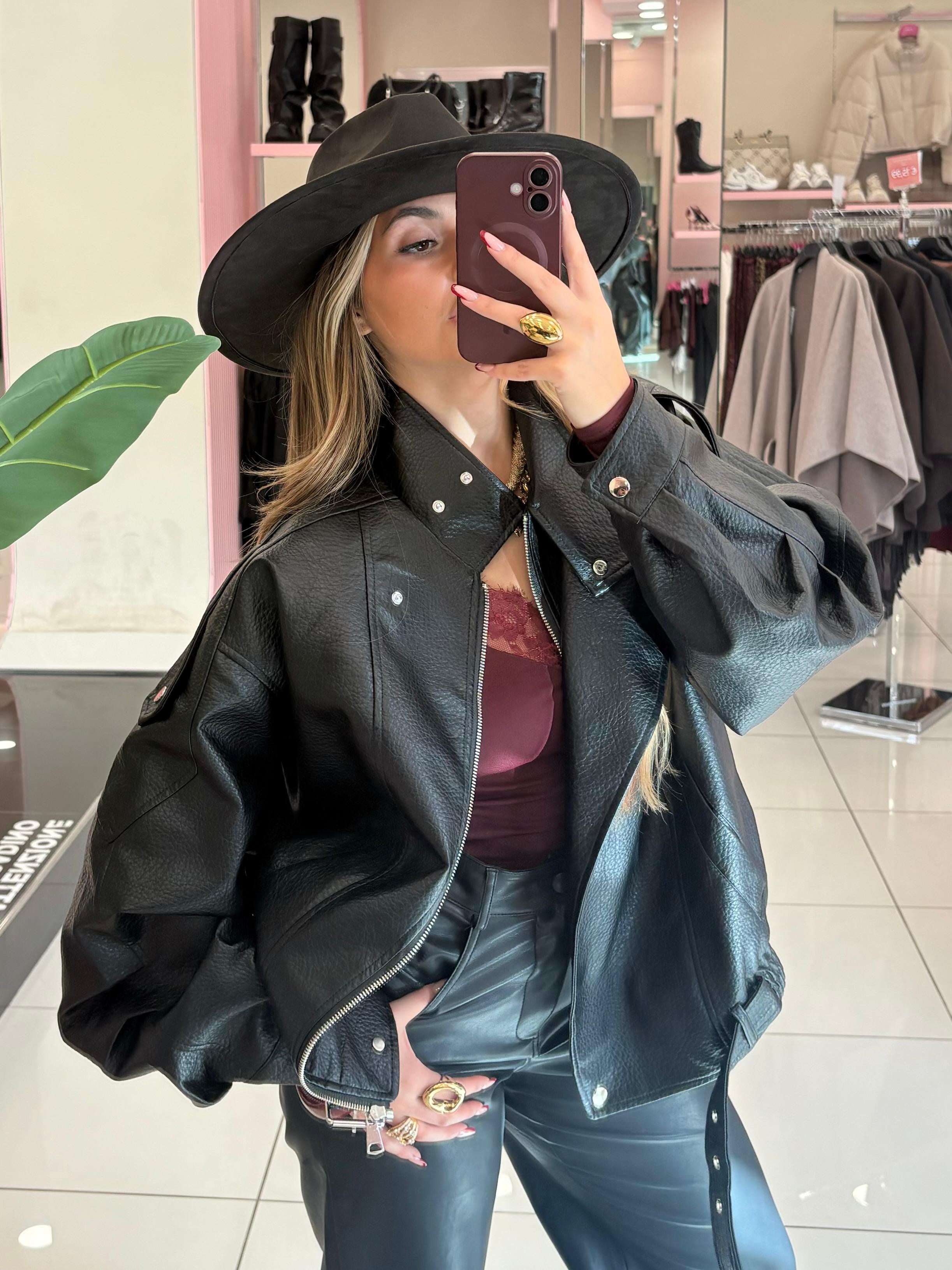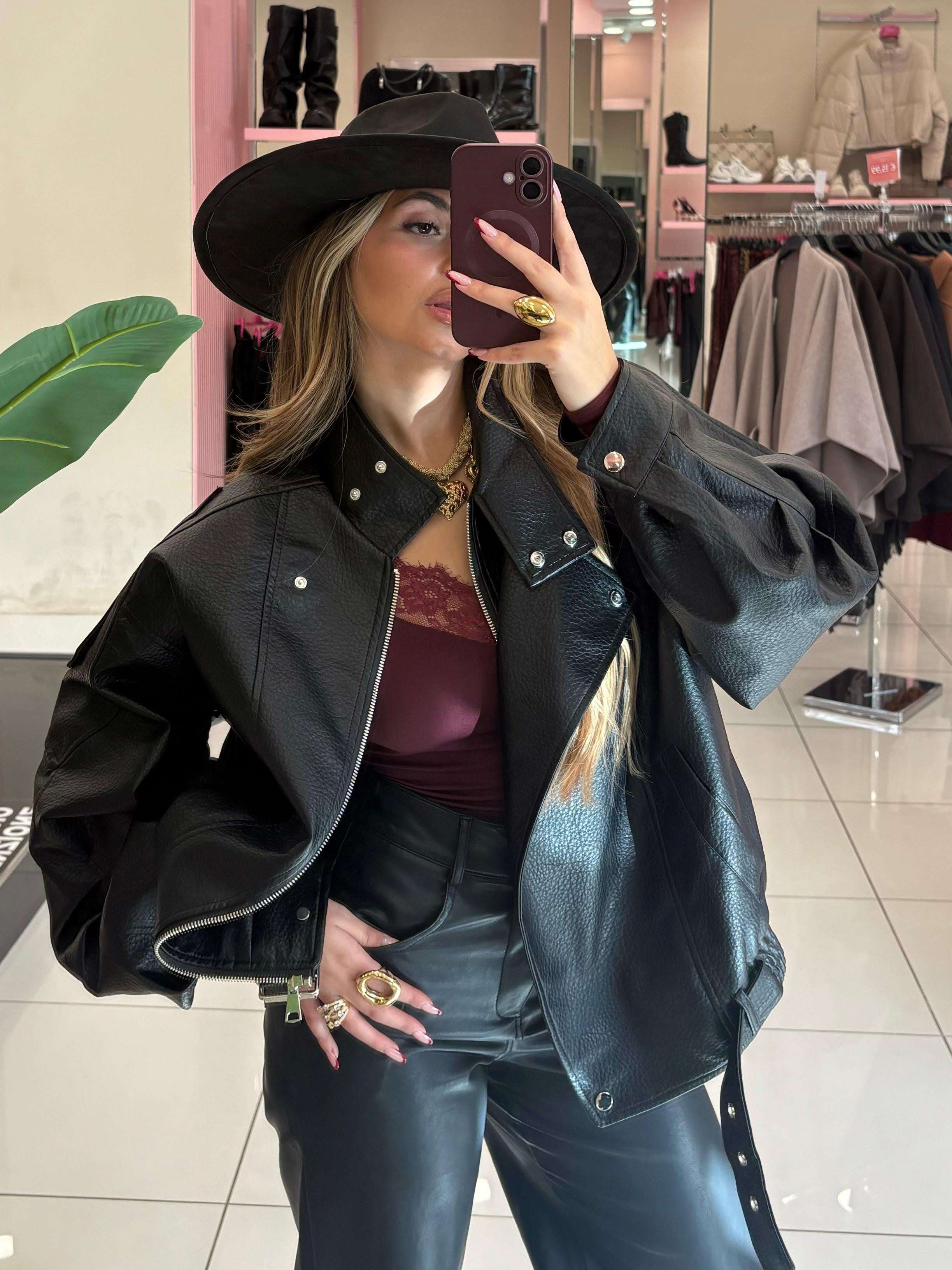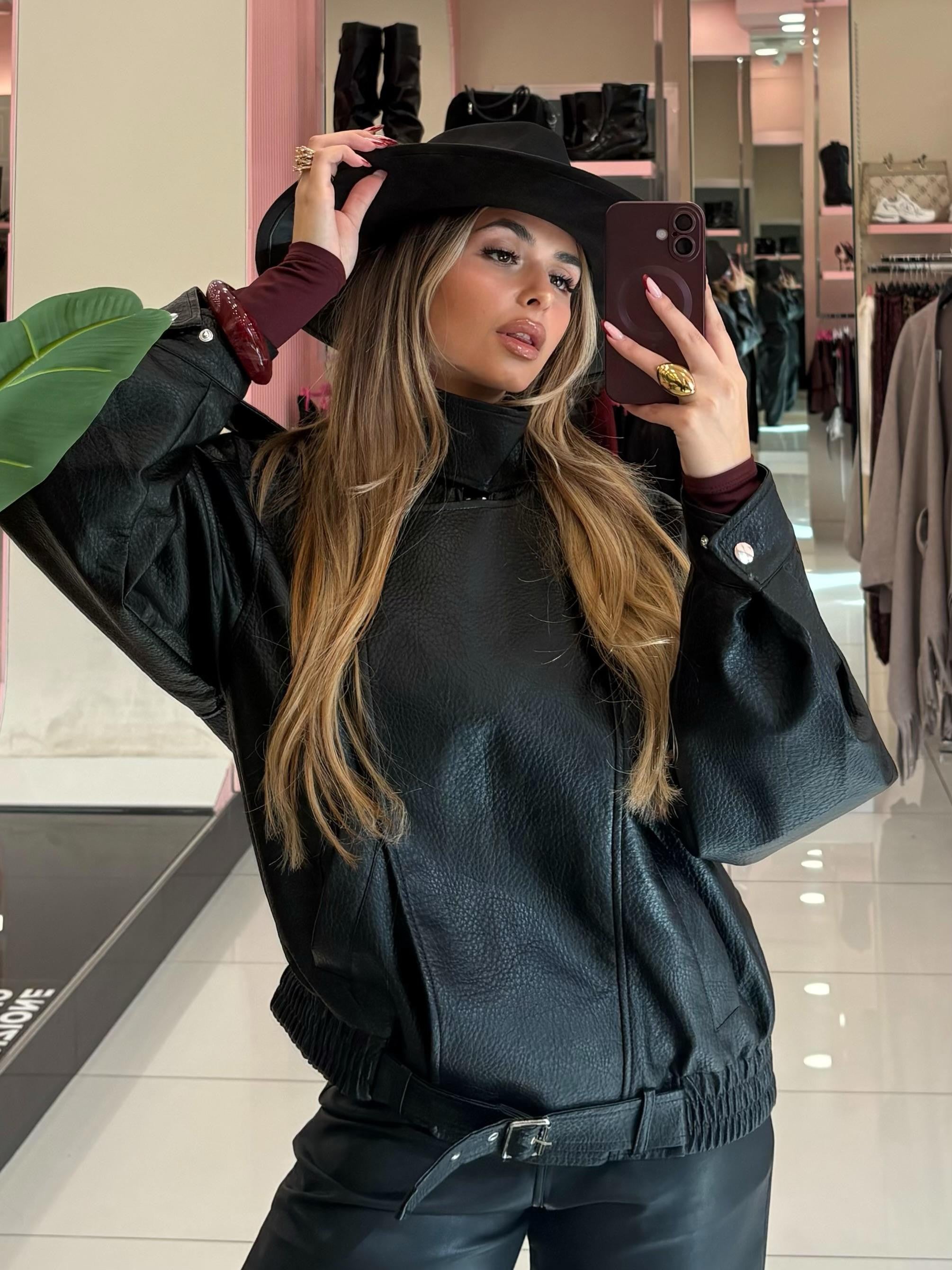 Giubbino in ecopelle,chiusura assimentrica con zip e bottoni e cintura regolabile sul fondo