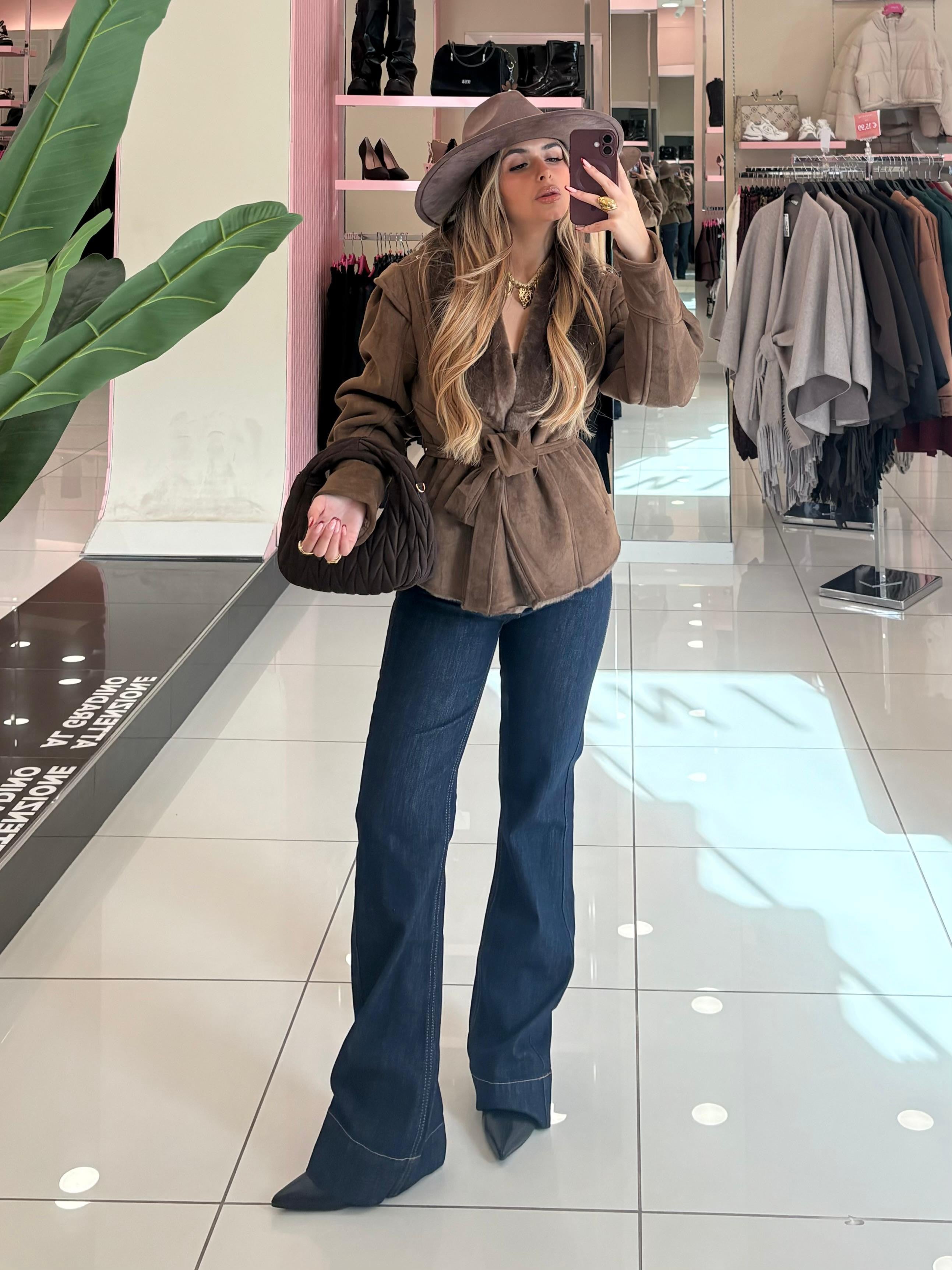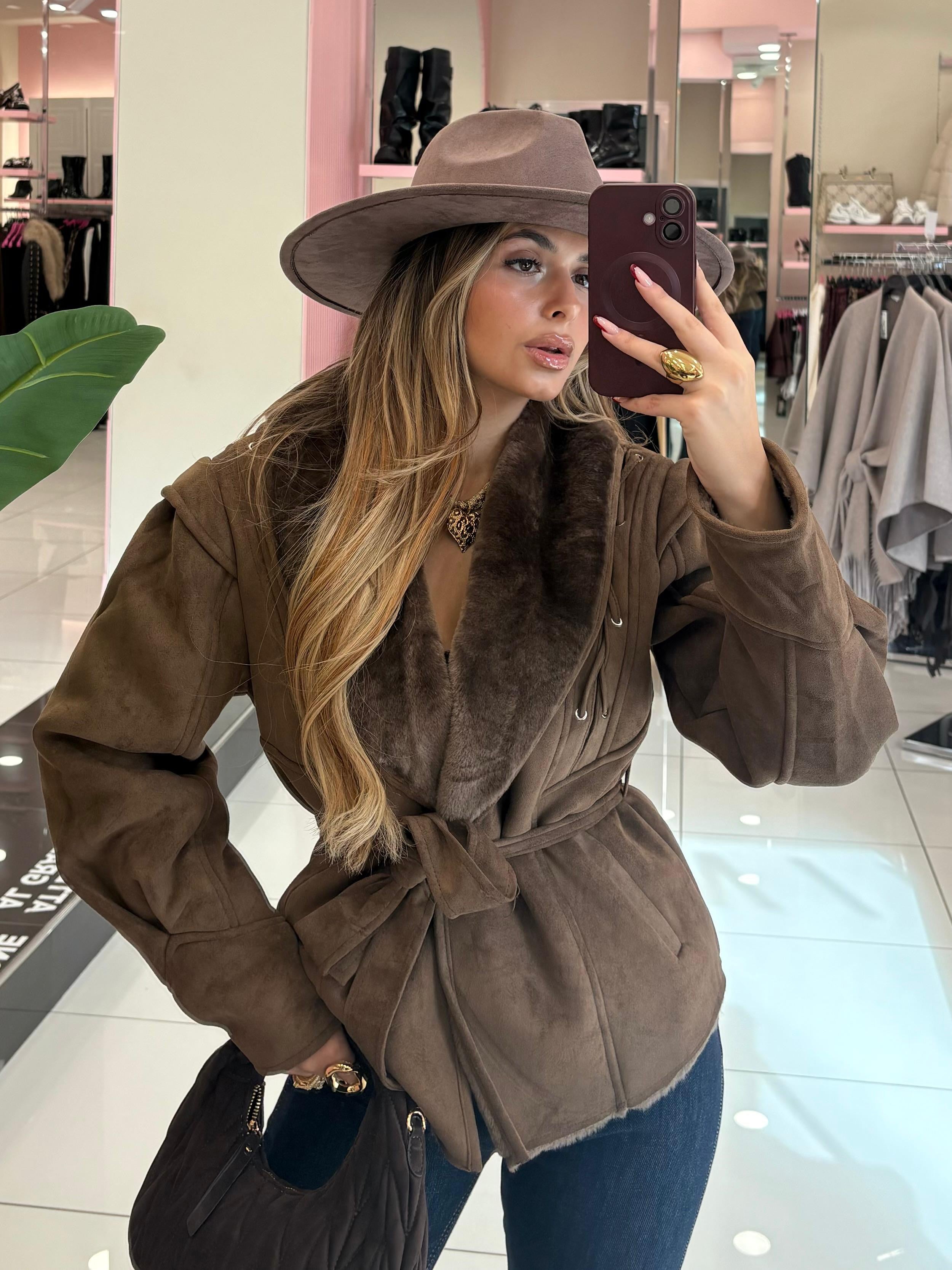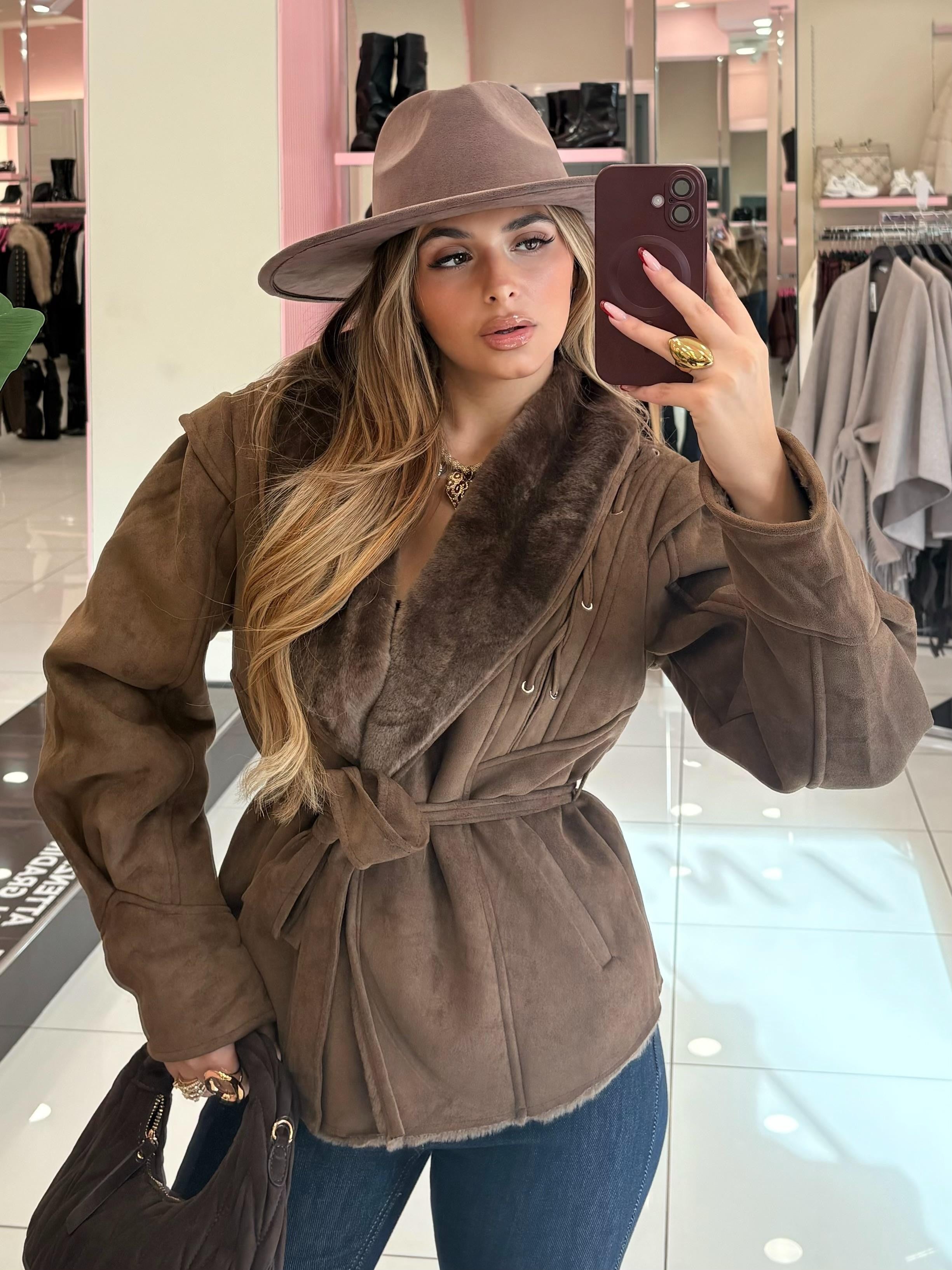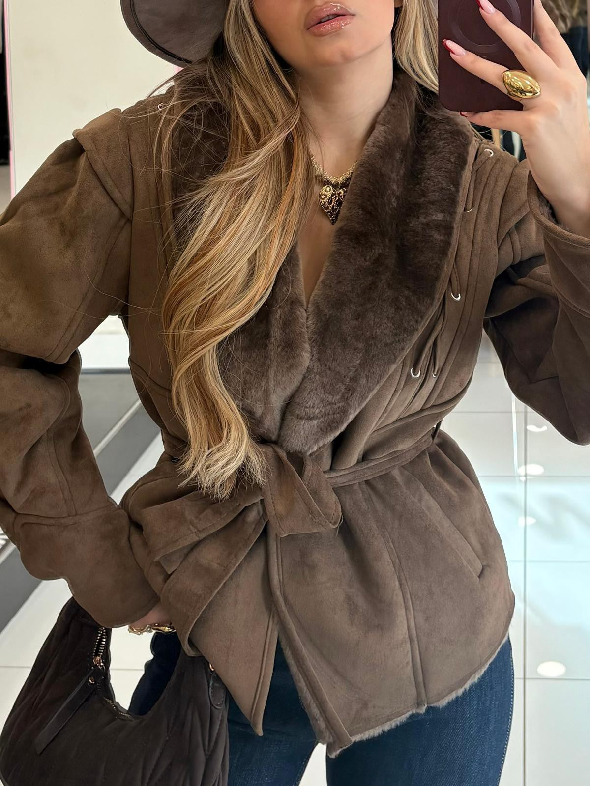 Giacca con finitura suede, fodera in pelliccia sintetica e cinturino