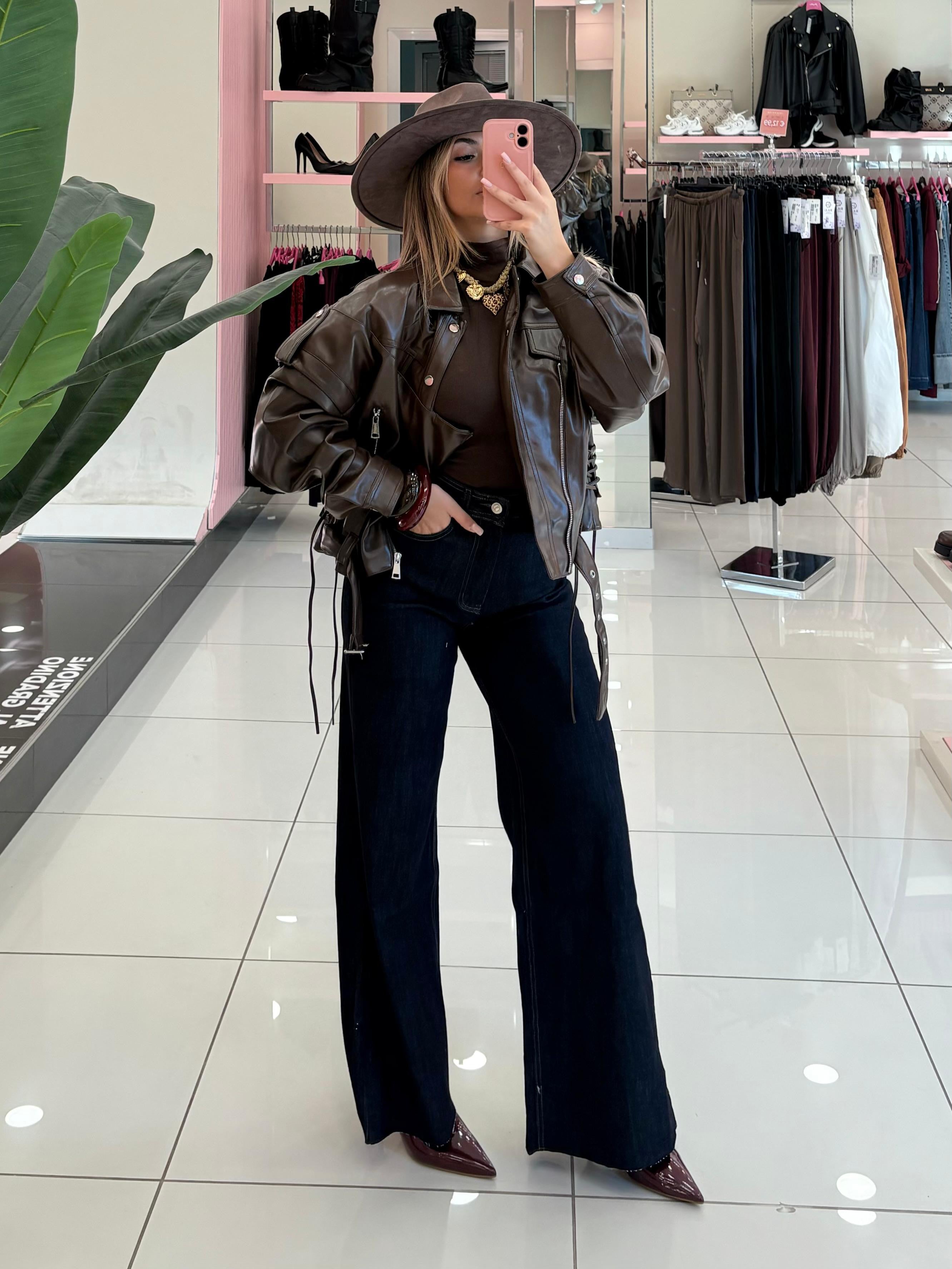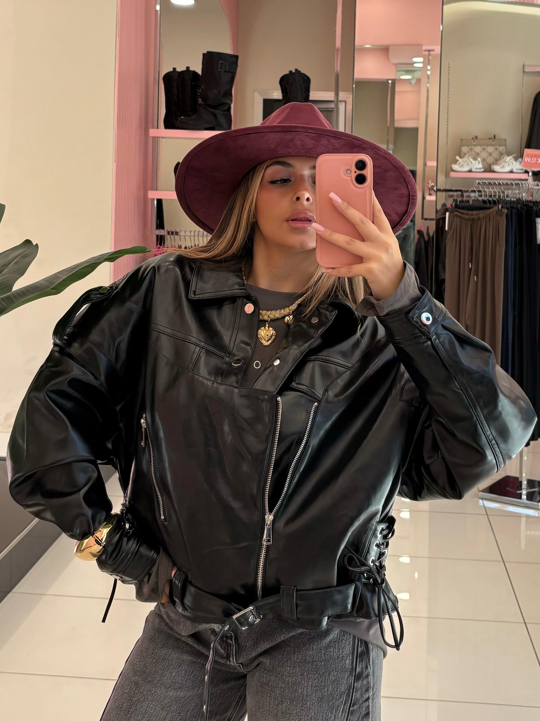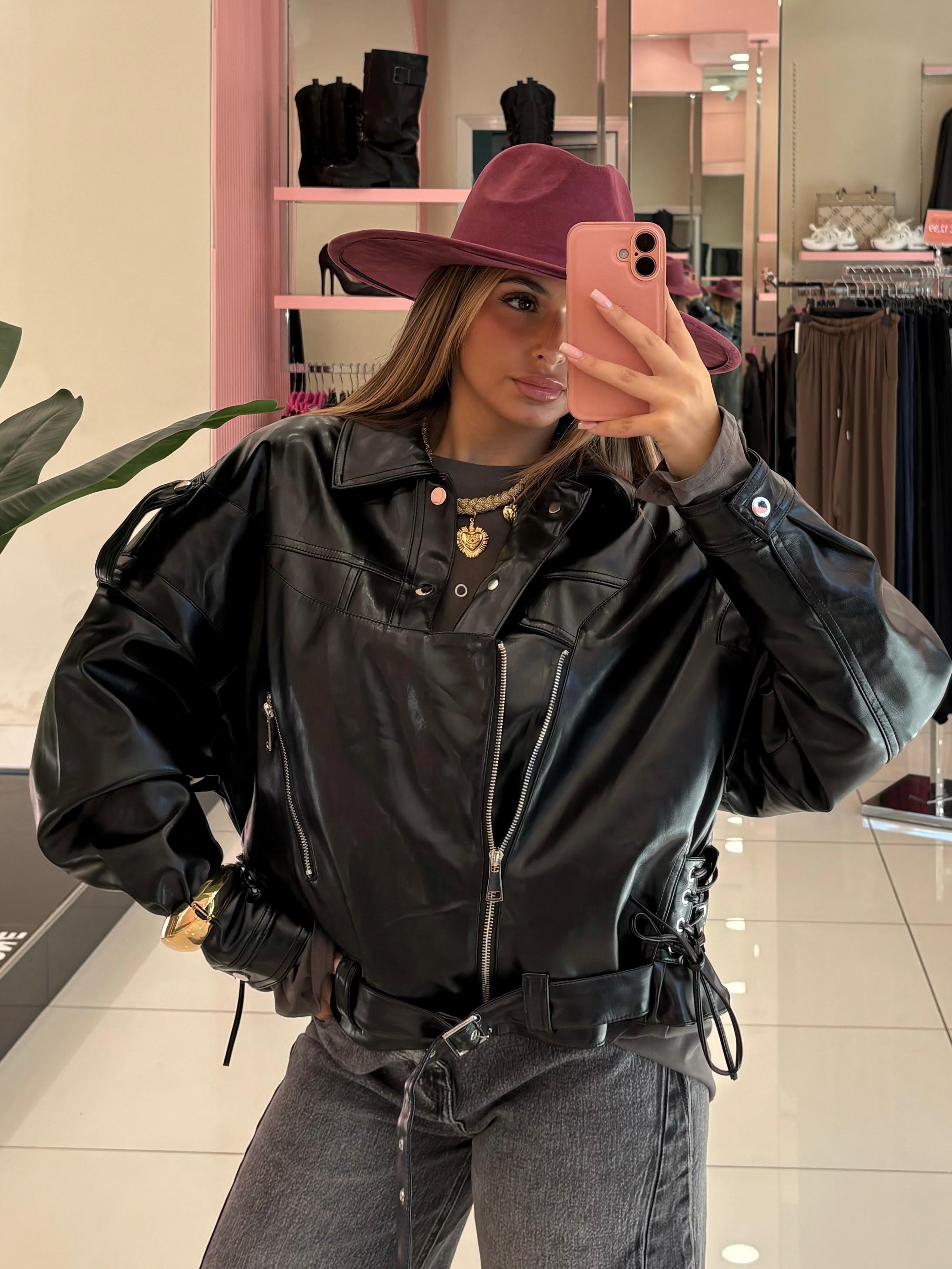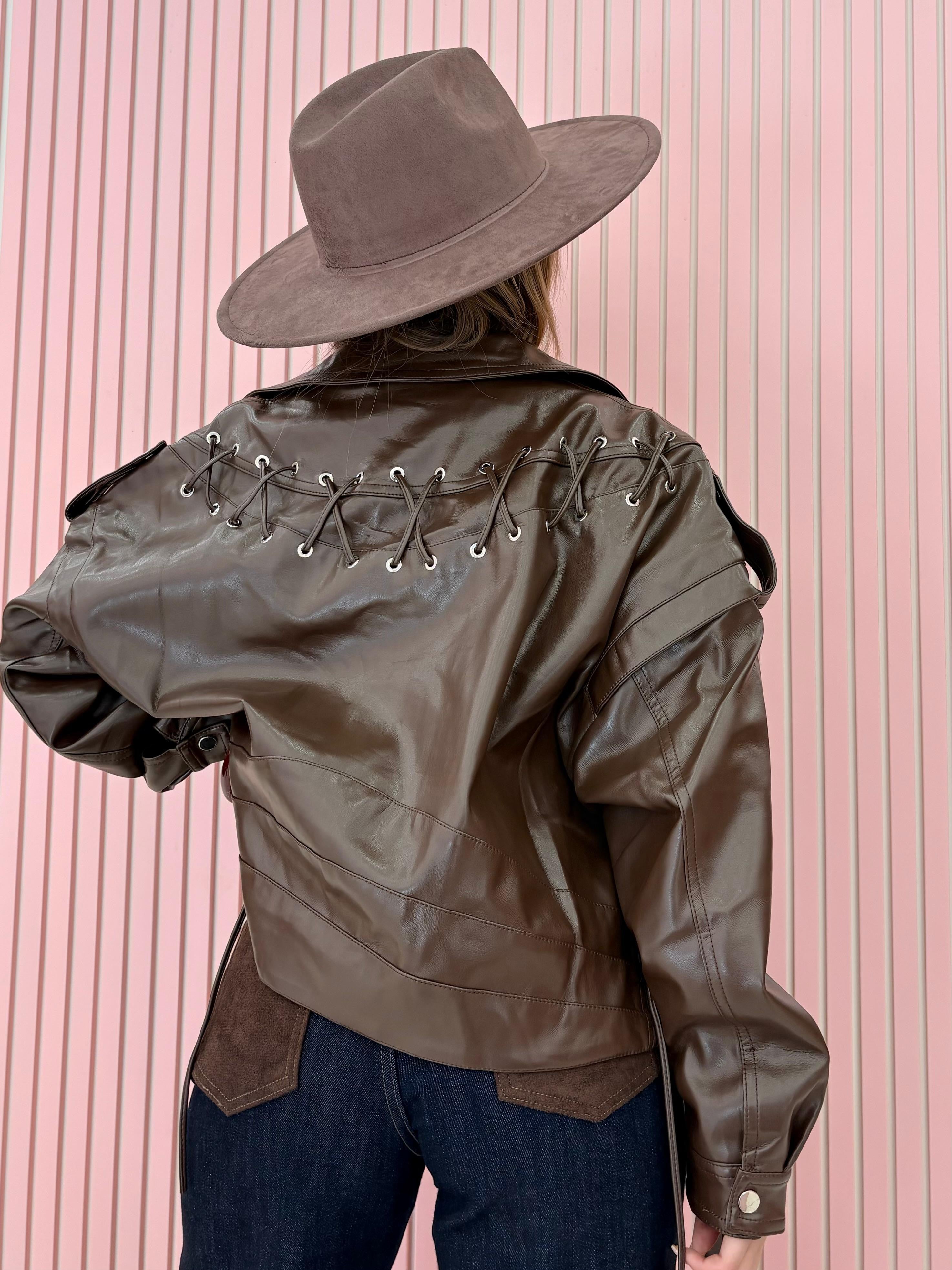 Giacca in eco-pelle dal taglio corto,con zip assimmetrica,lacci laterali regolabili e dettagli intrecciati sul retro.