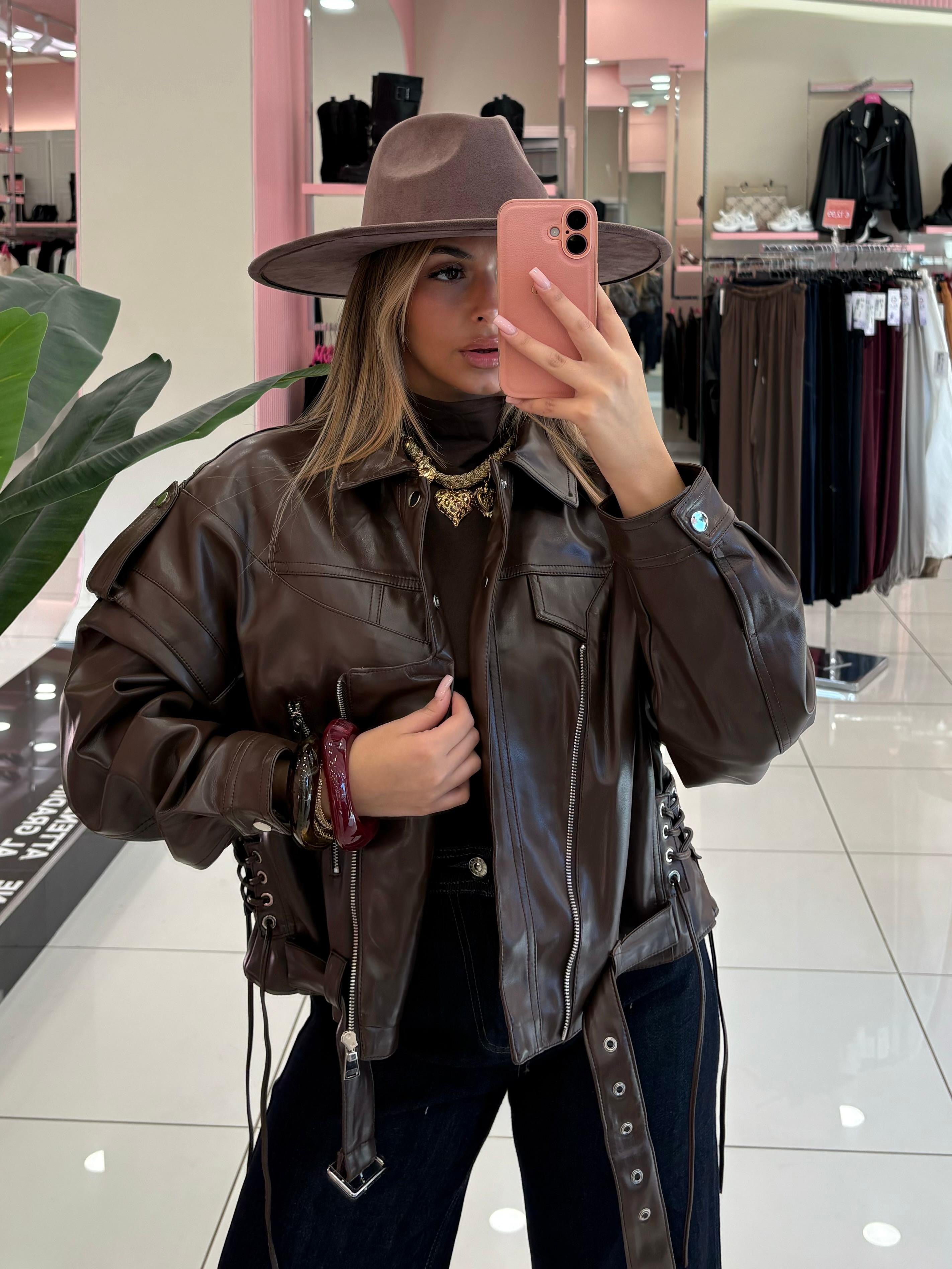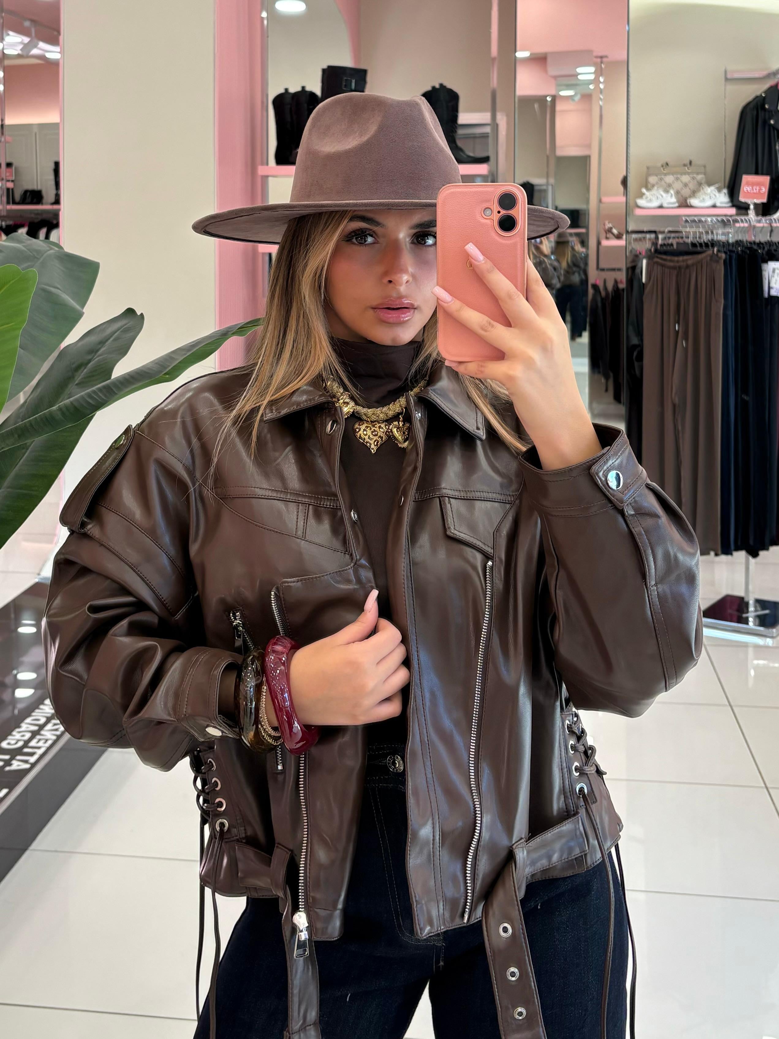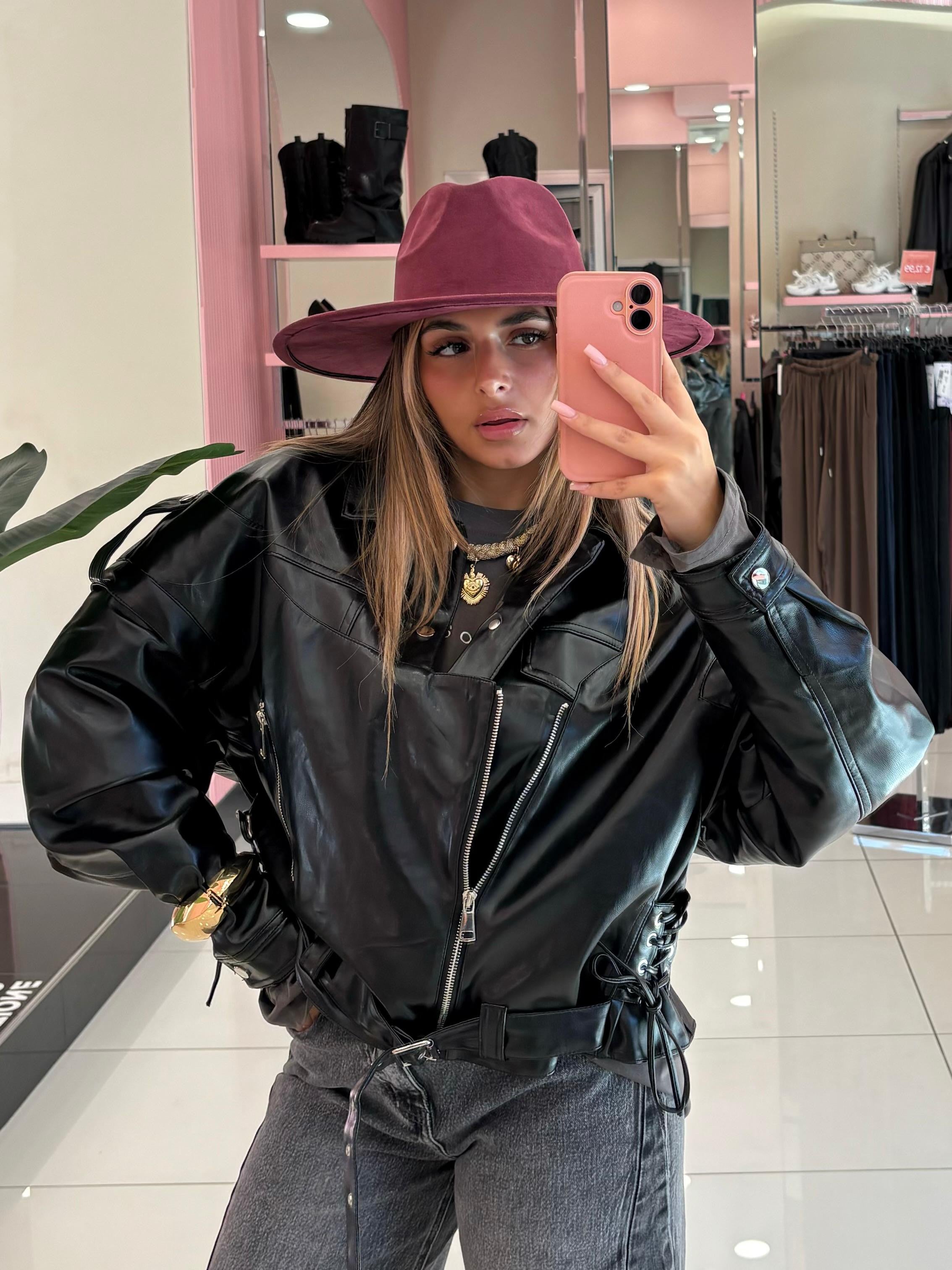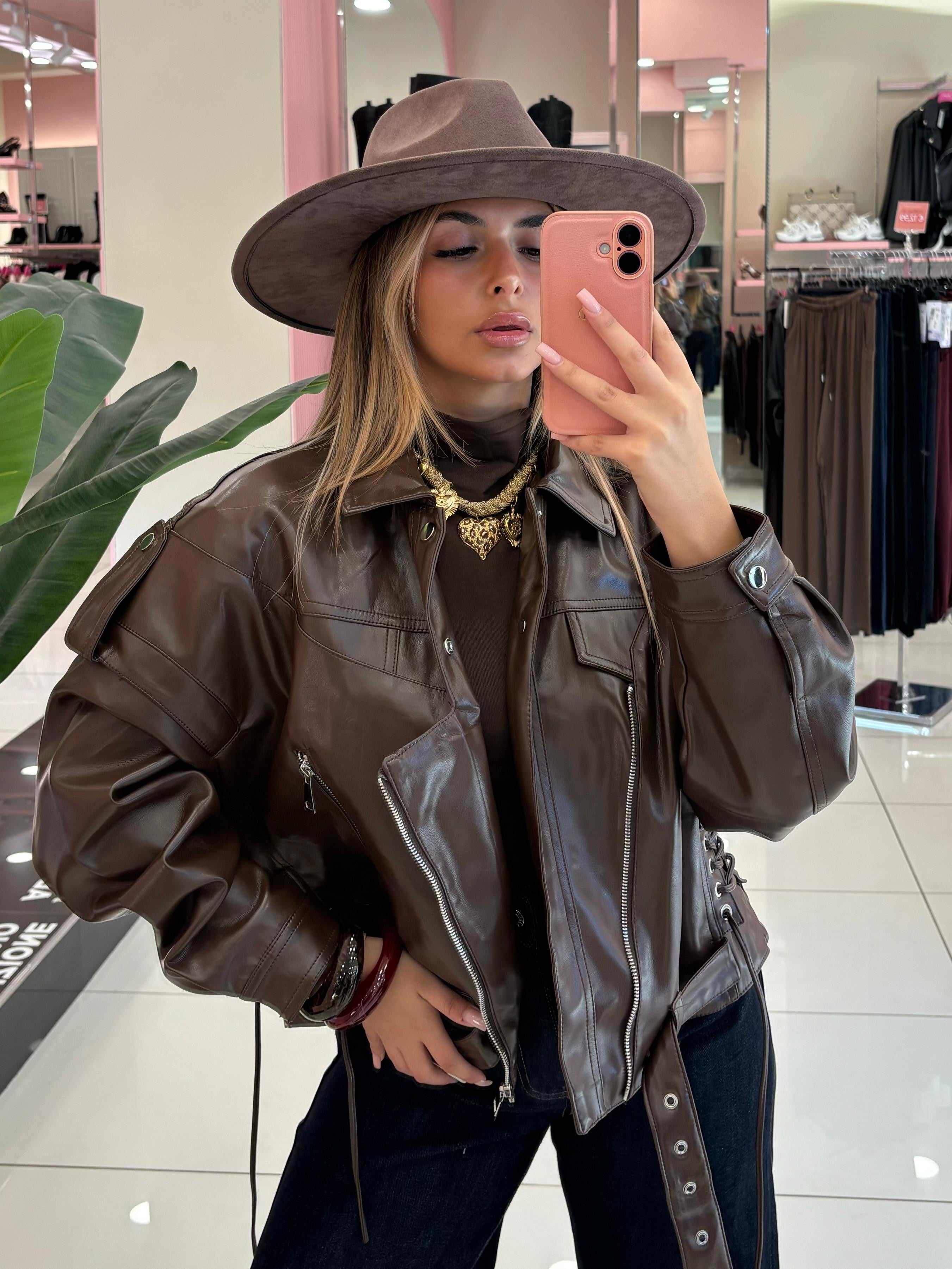 Giacca in eco-pelle dal taglio corto,con zip assimmetrica,lacci laterali regolabili e dettagli intrecciati sul retro.