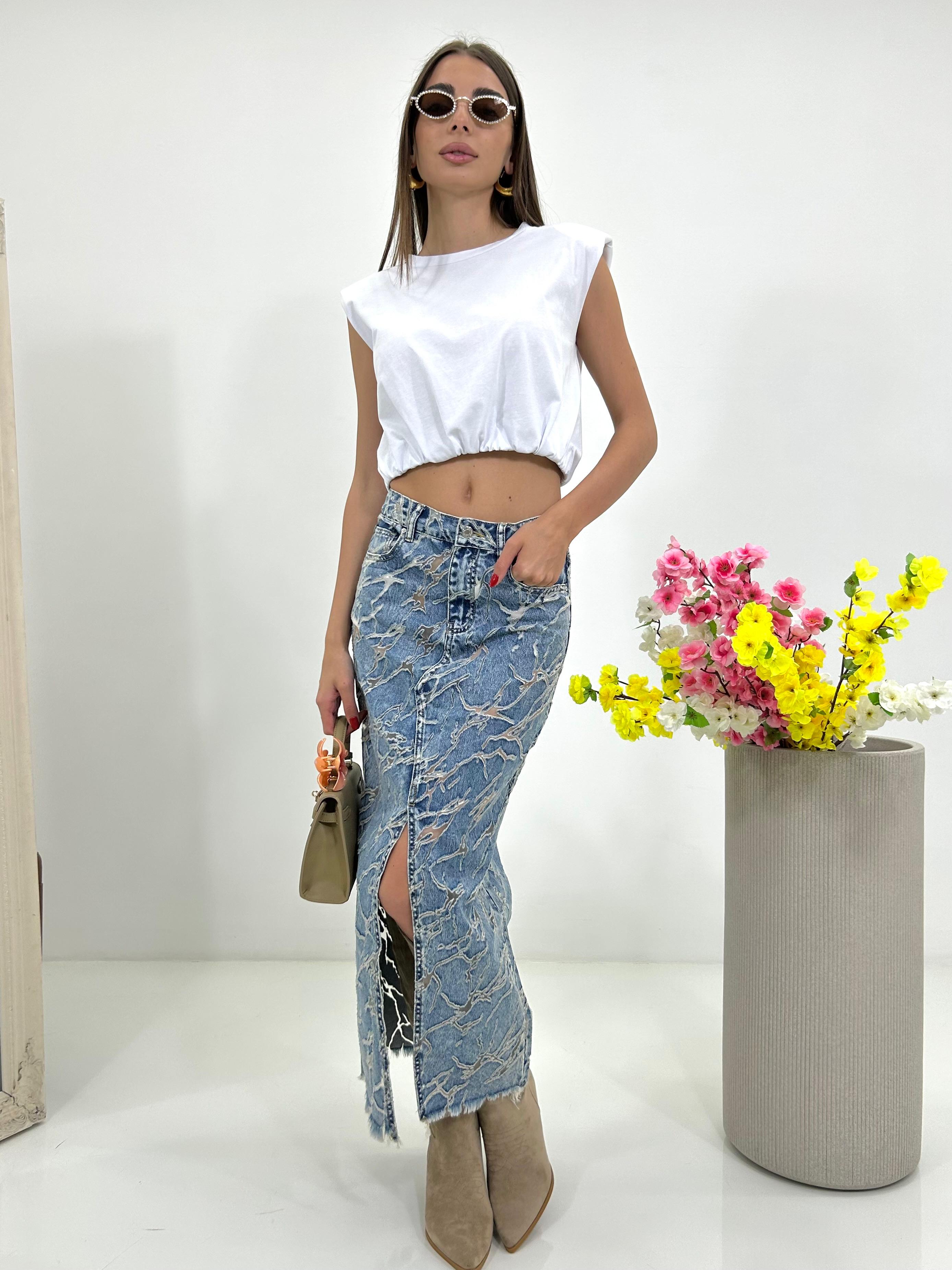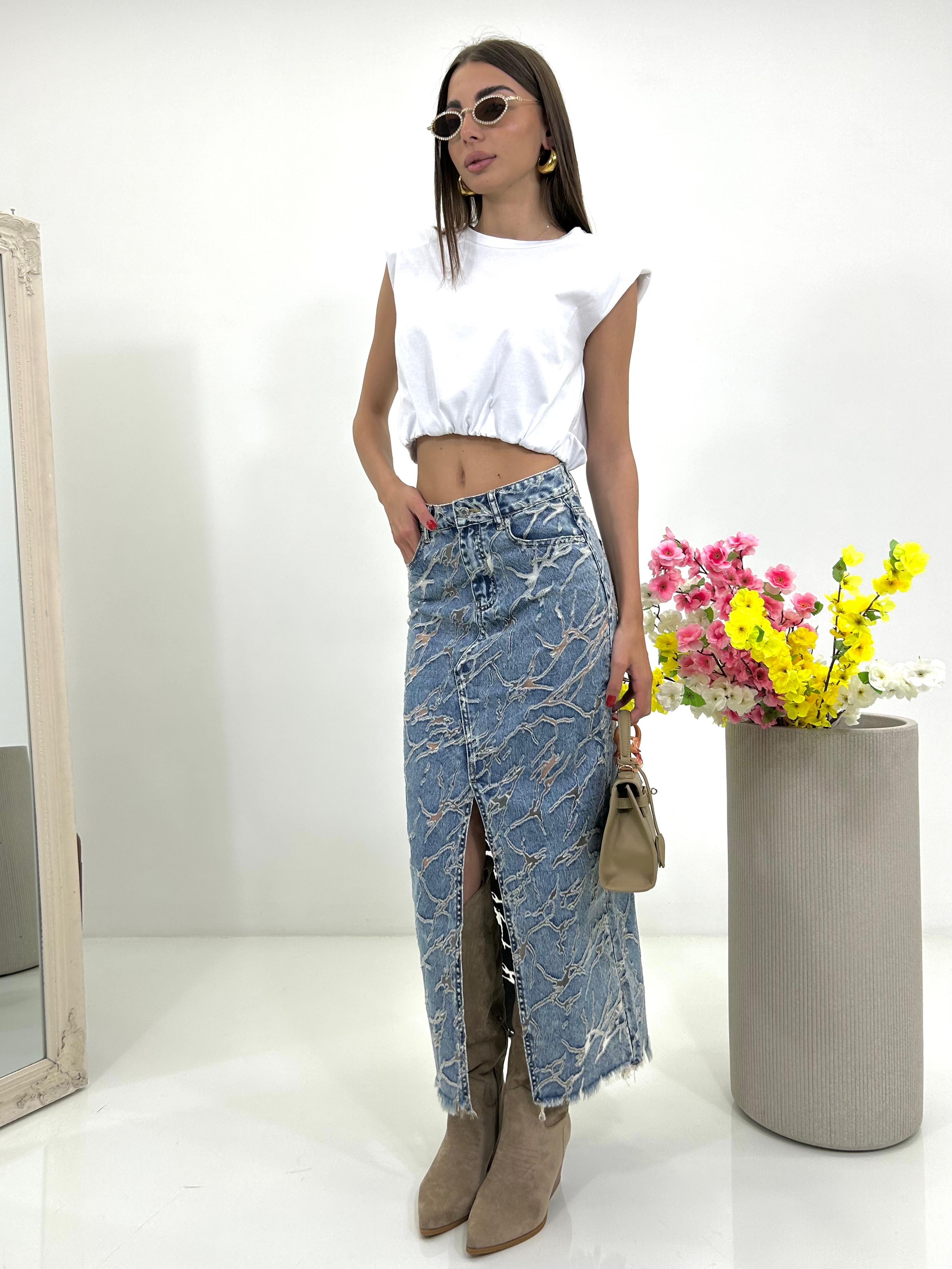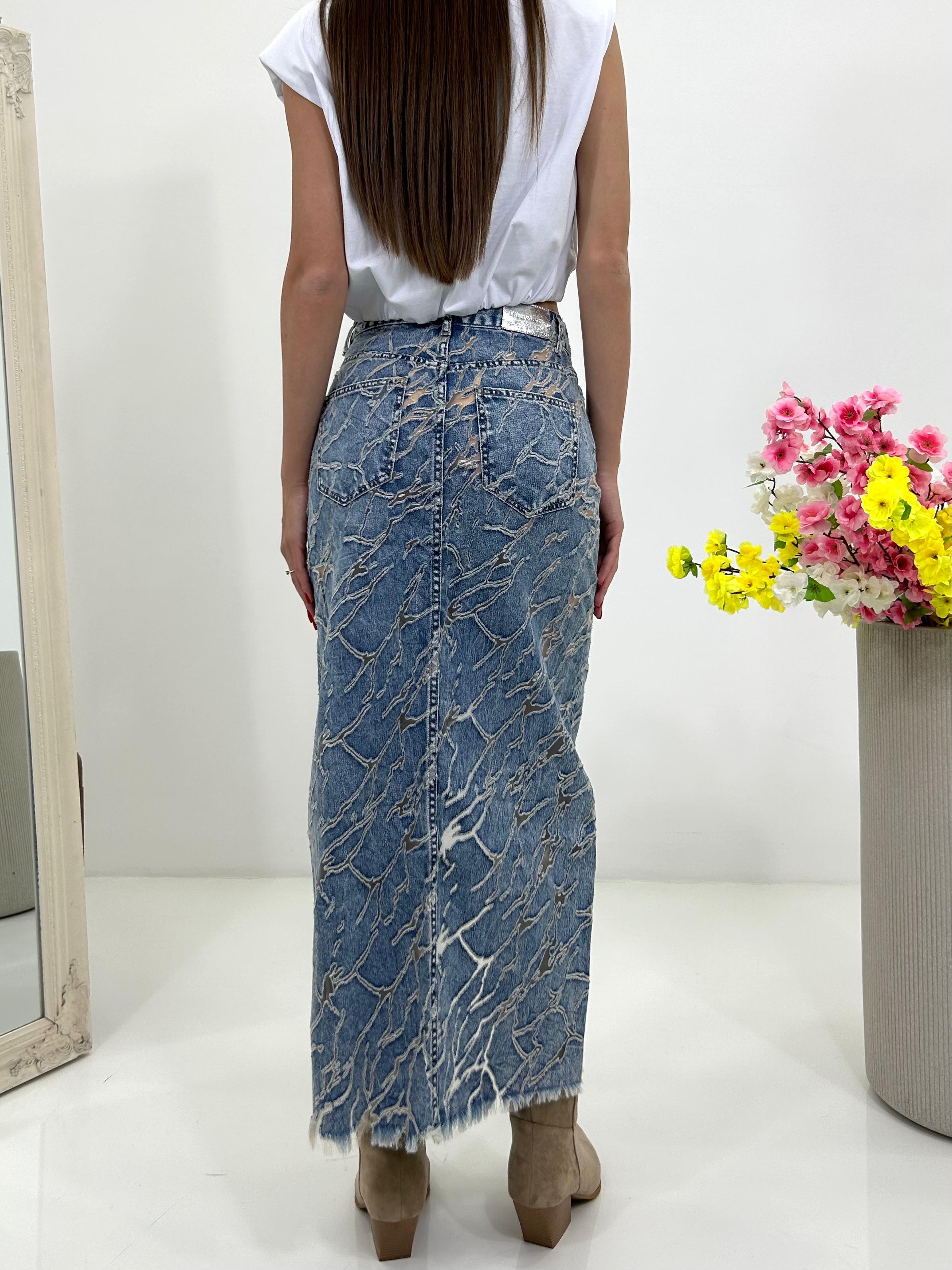 Gonna denim con spacco e trasparenze