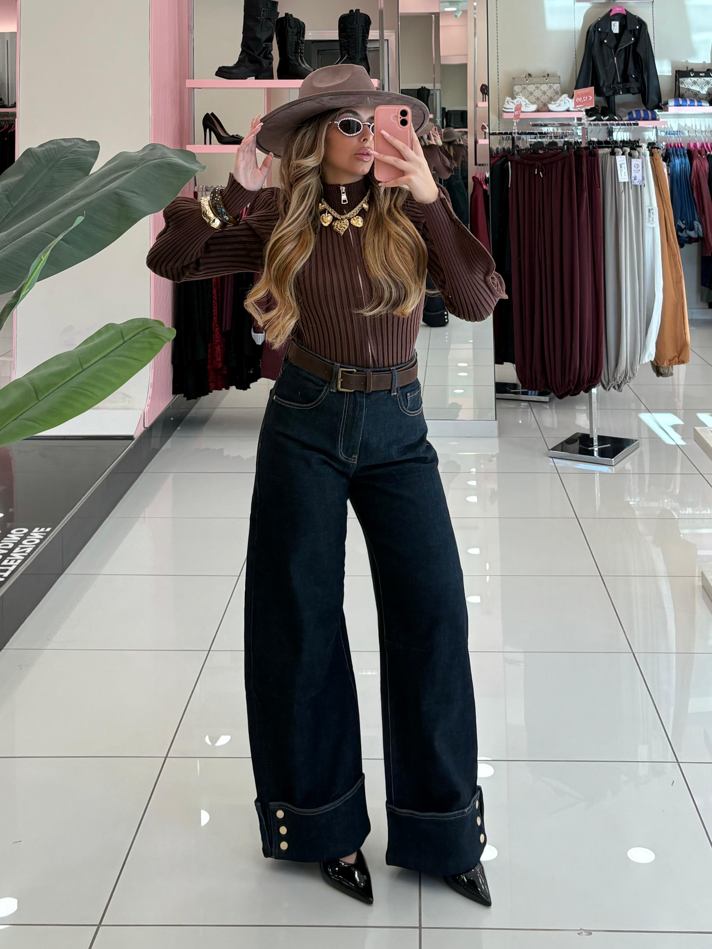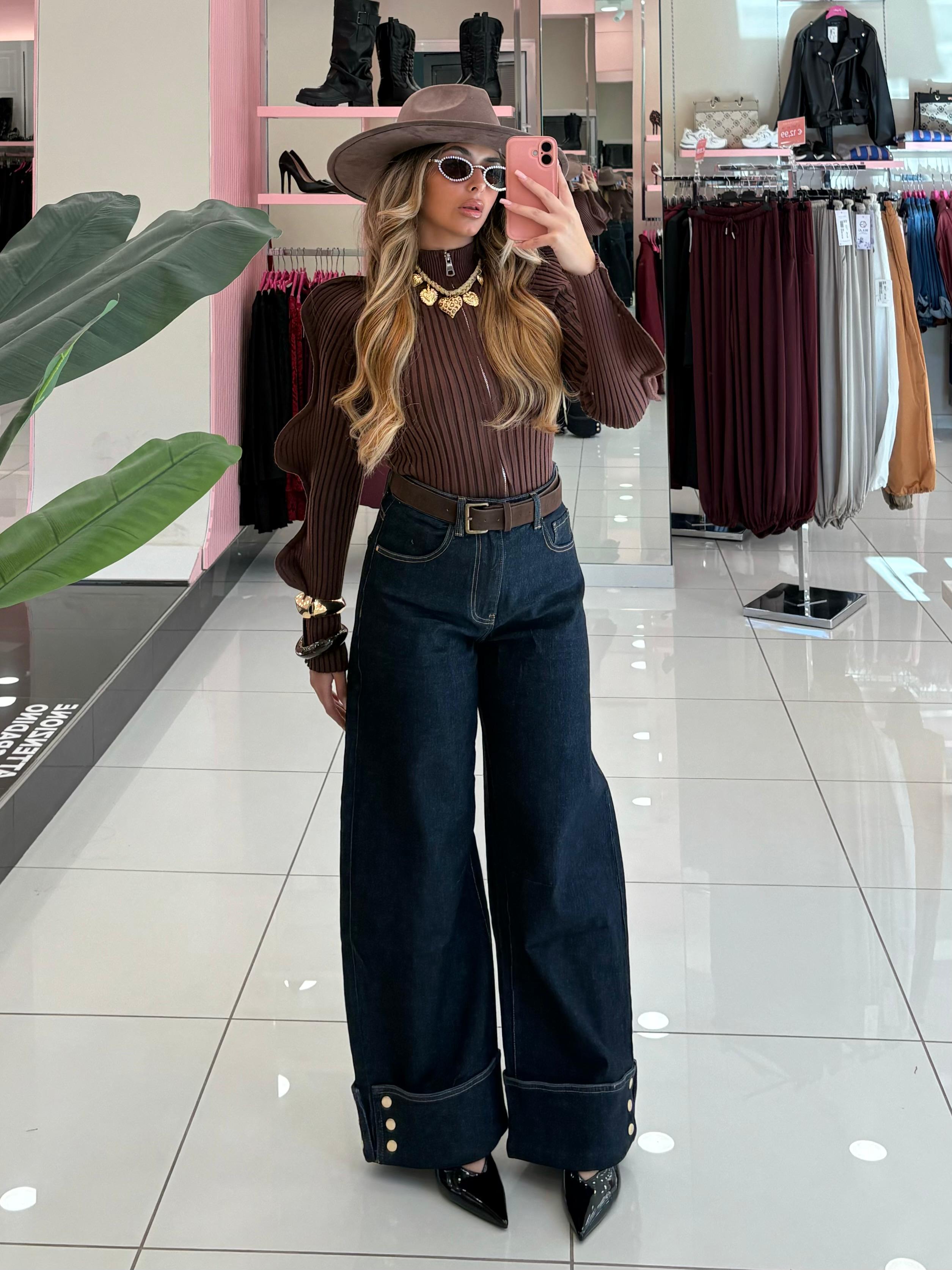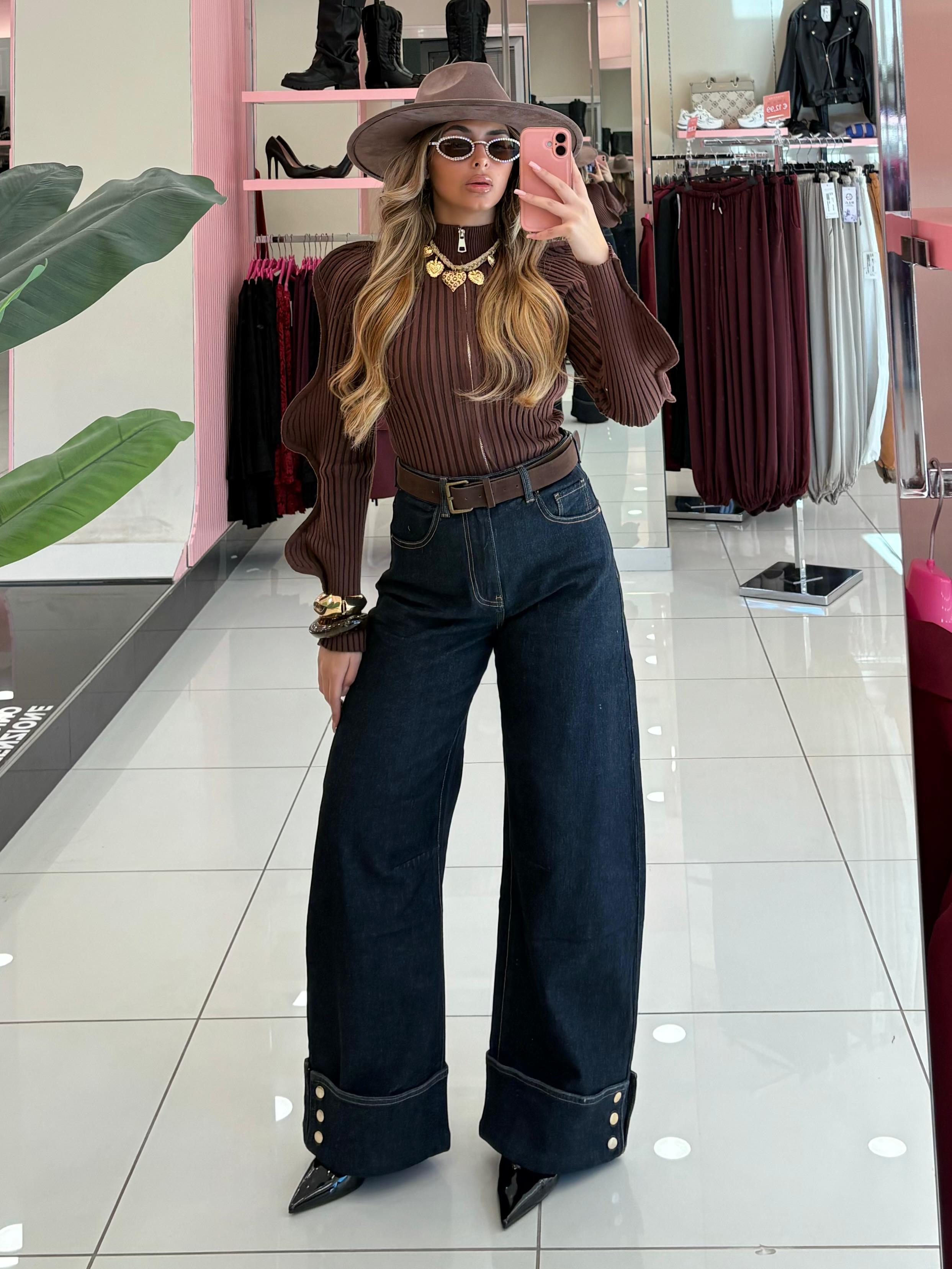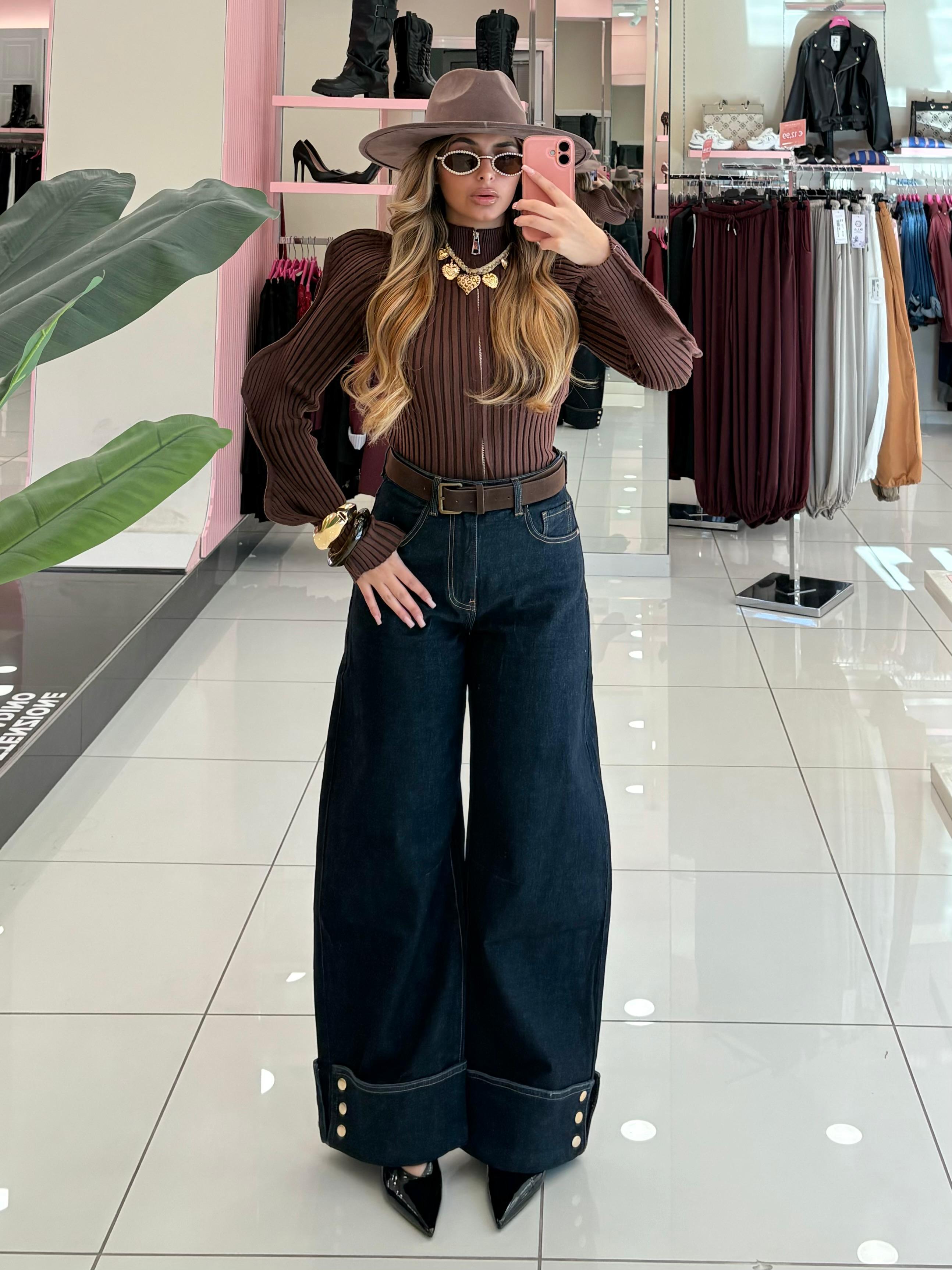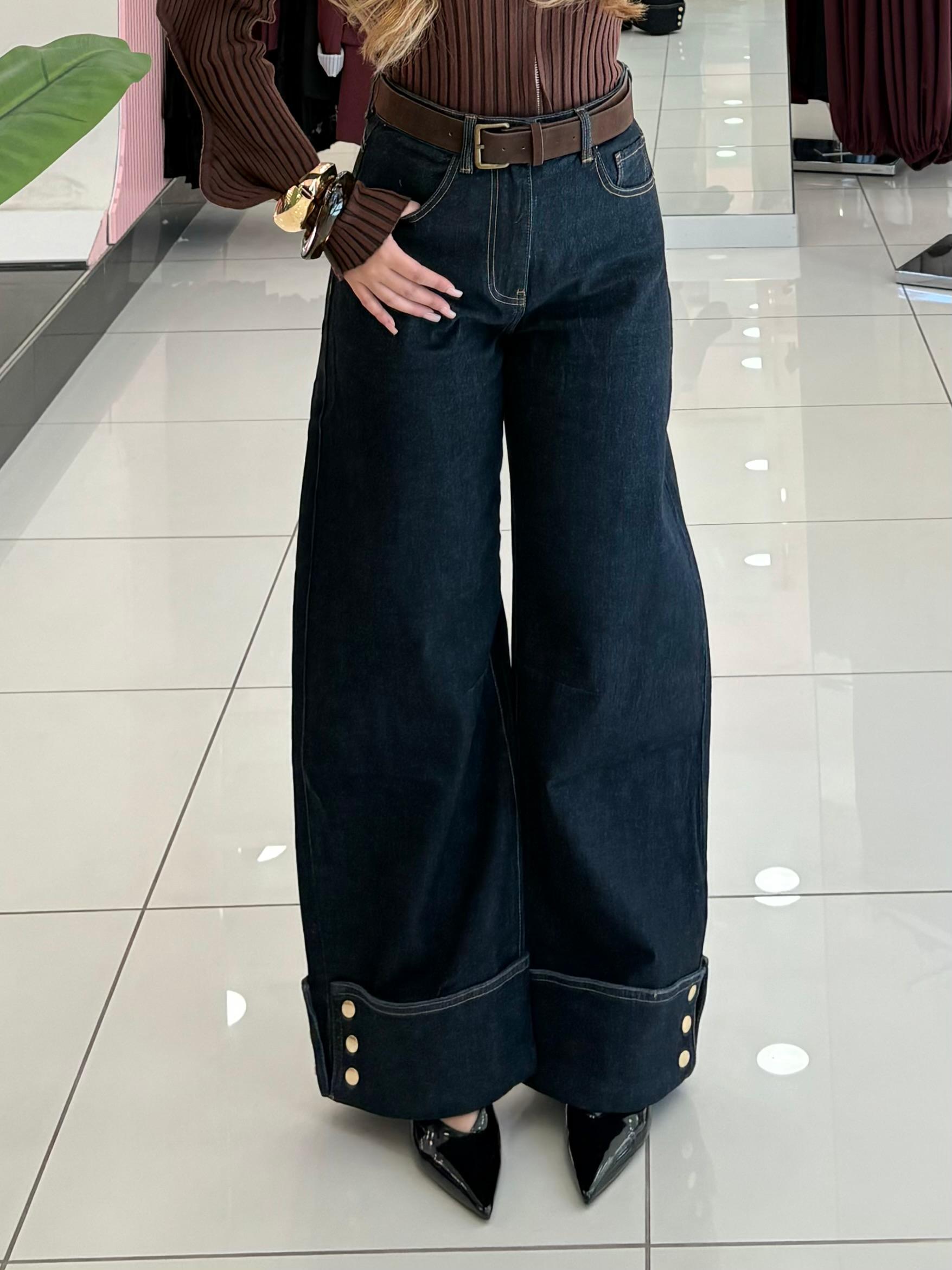 Jeans a palazzo, il risvolto del jeans non è fissato tramite cucitura, ma è mantenuto in posizione dai bottoni.