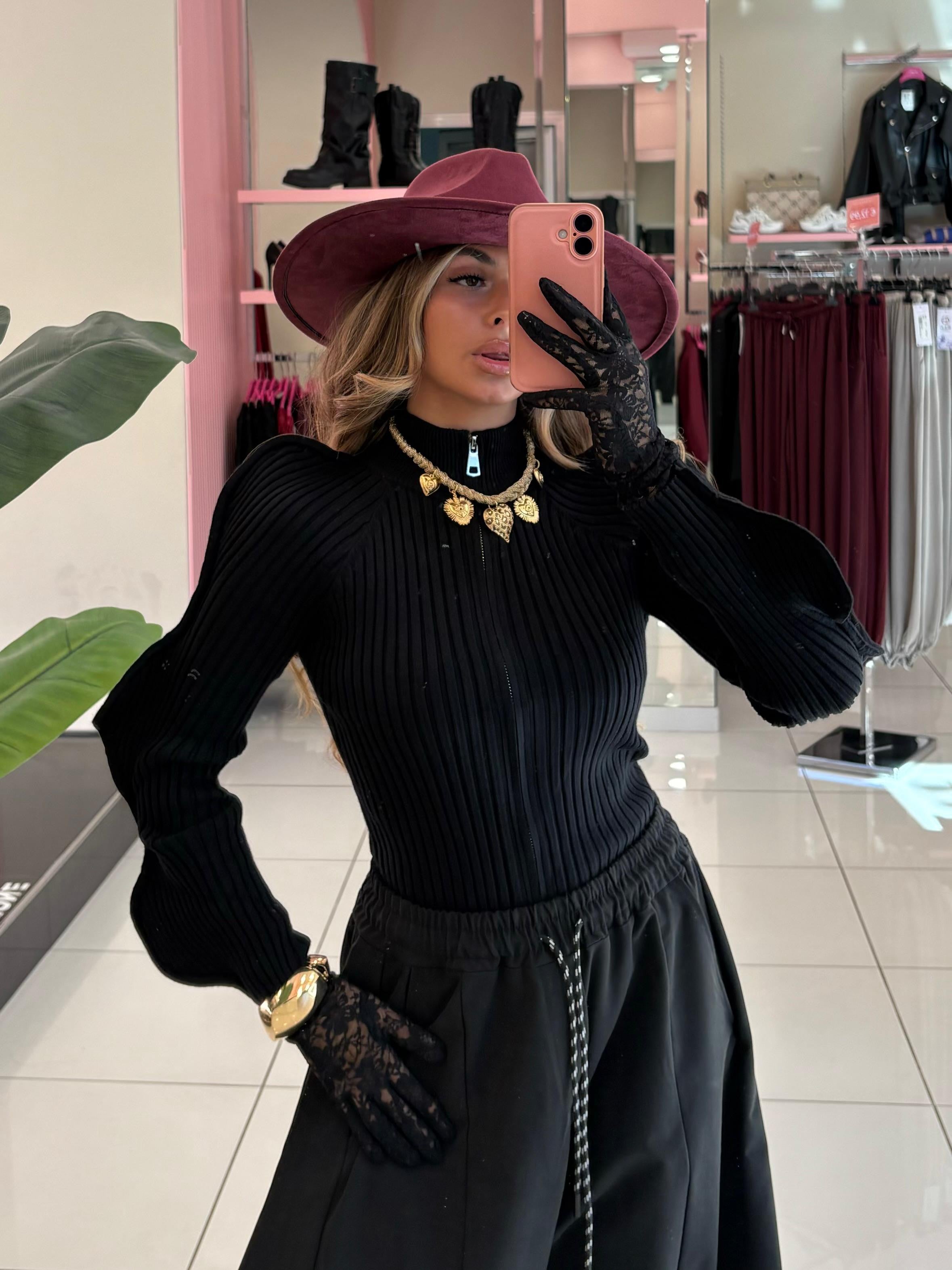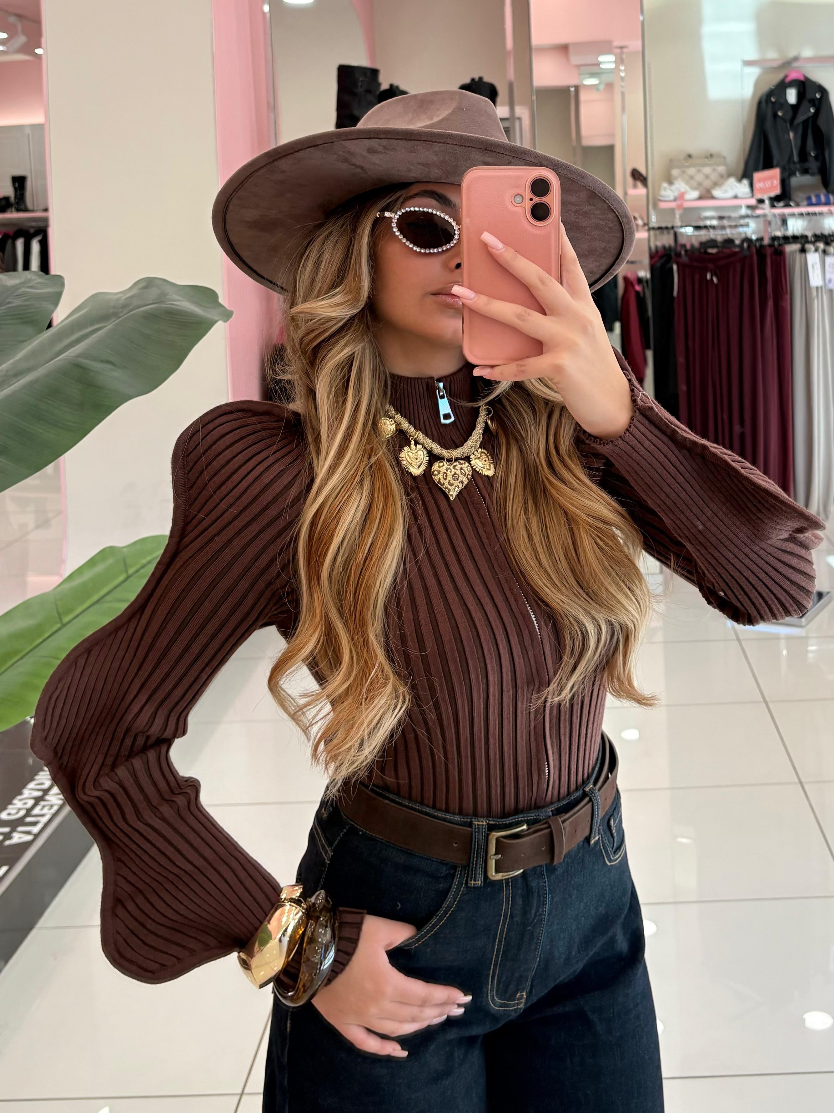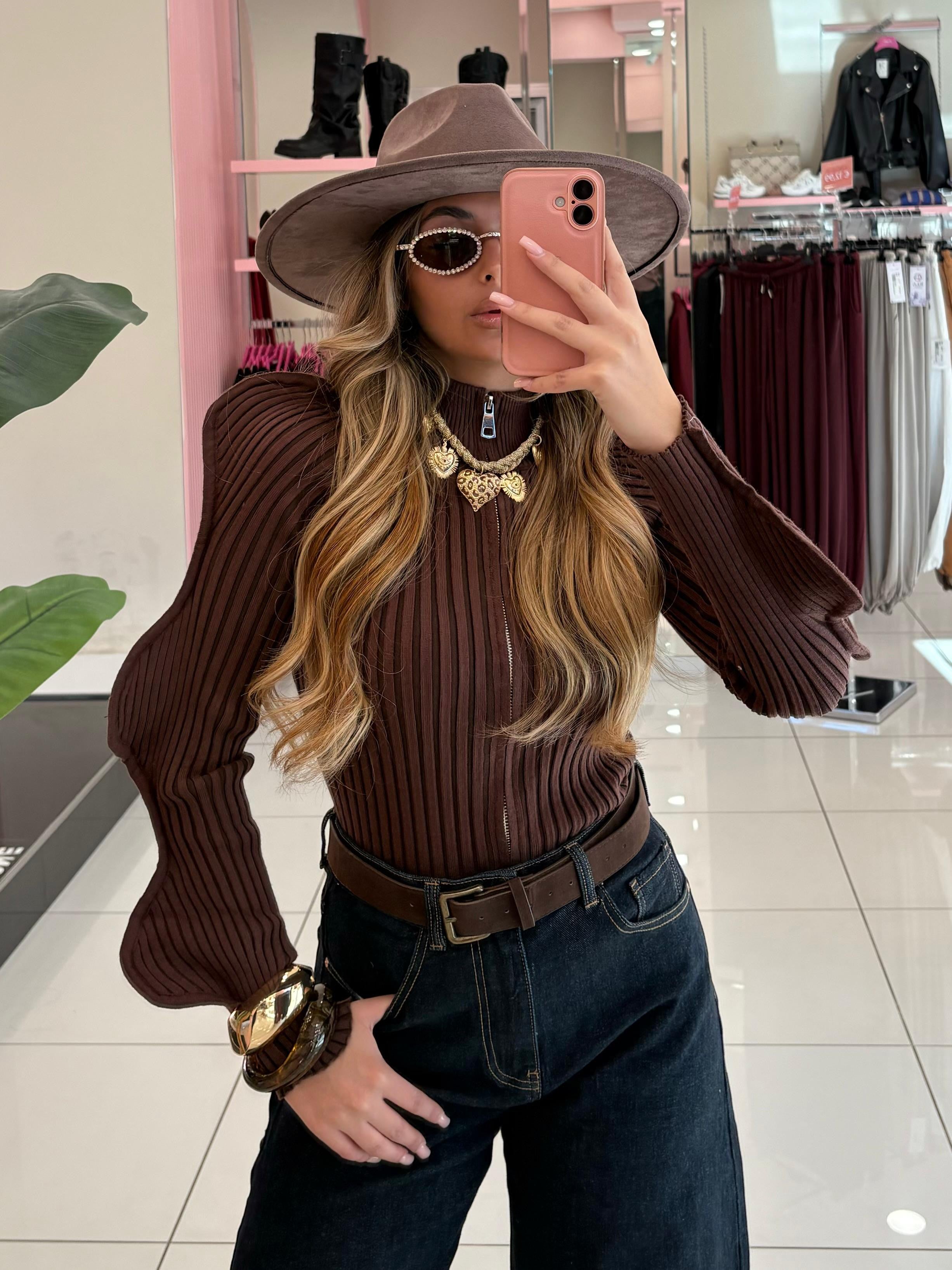 Maglia a costina con manica a sbuffo e zip