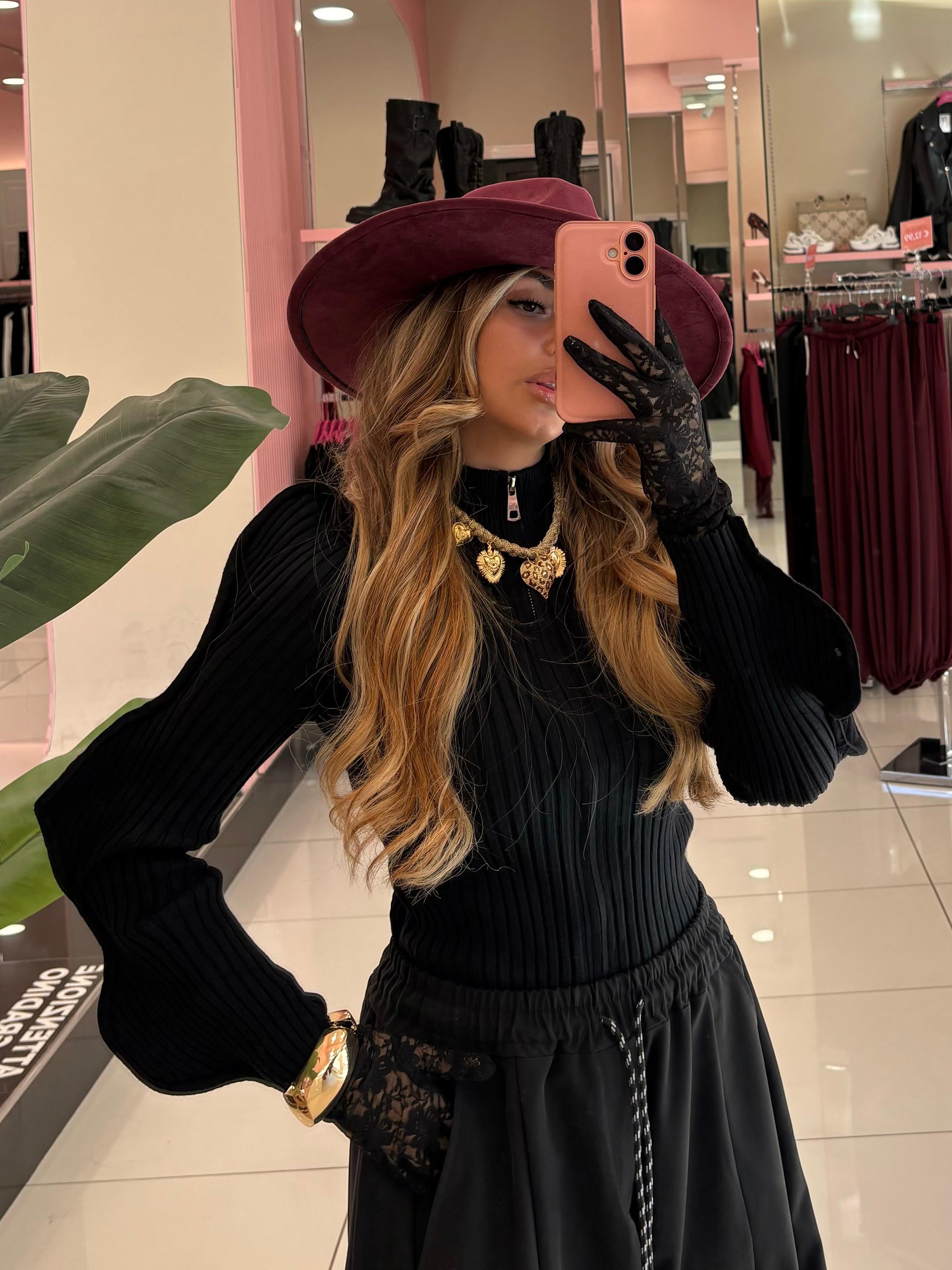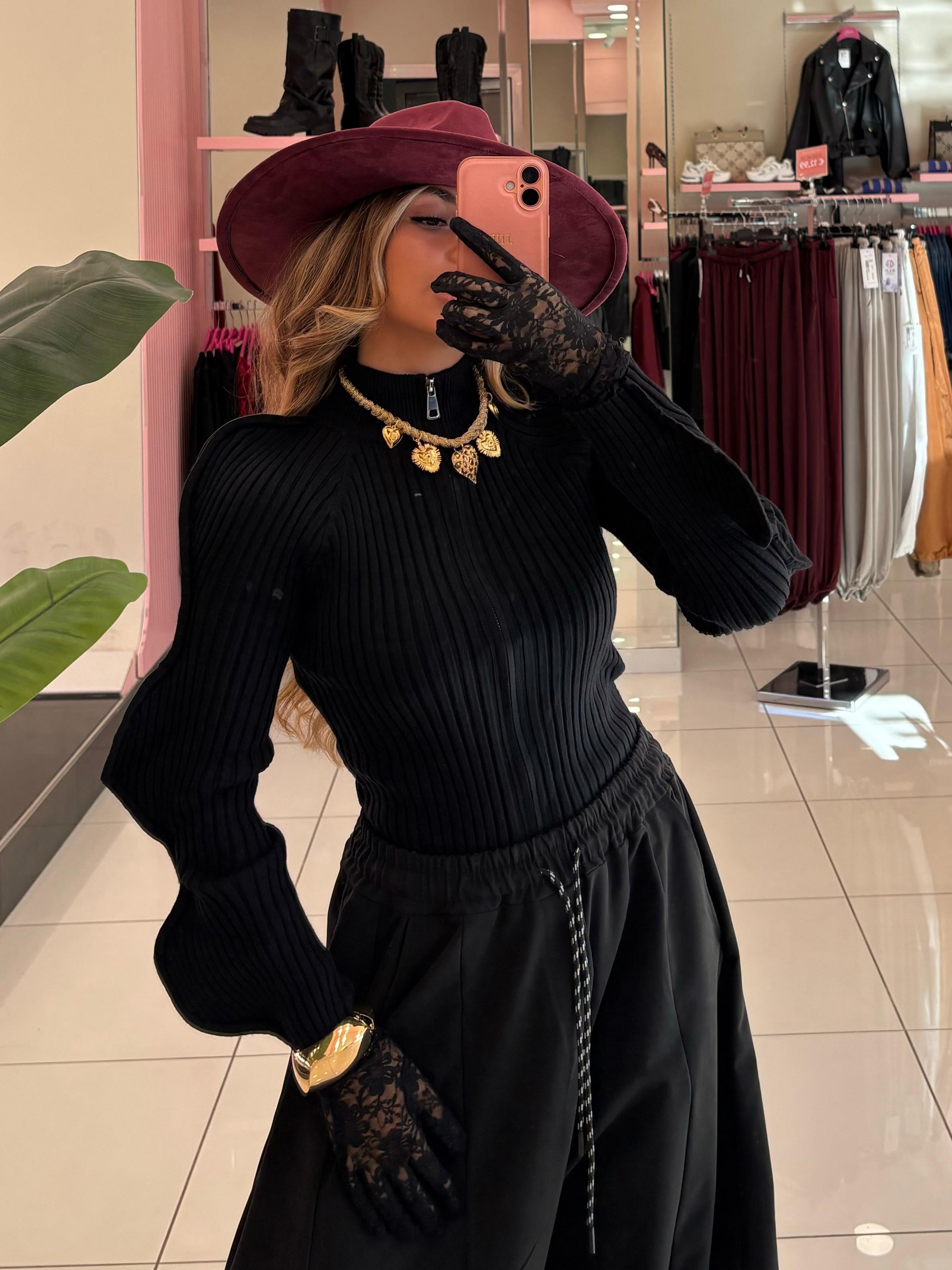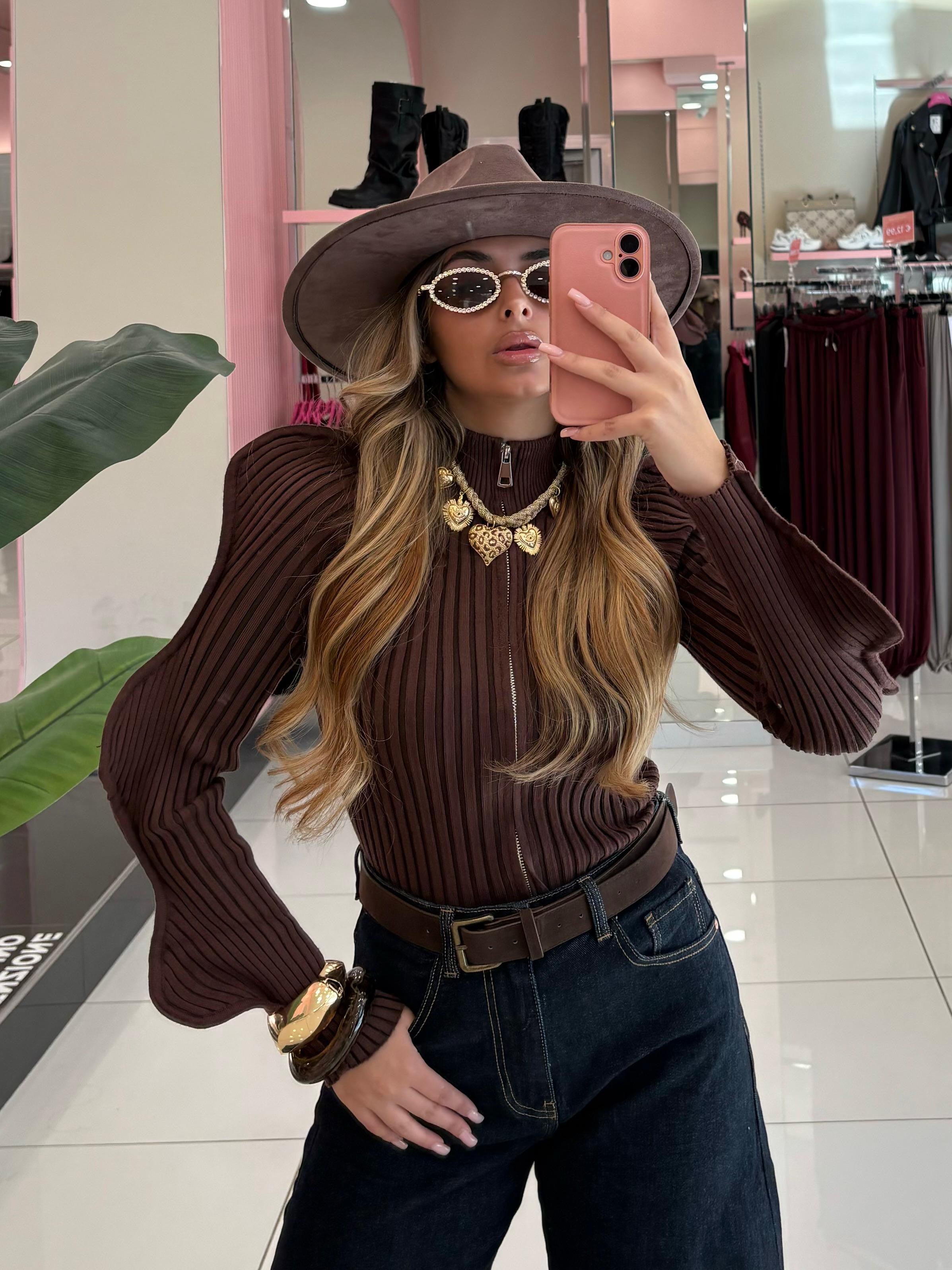 Maglia a costina con manica a sbuffo e zip