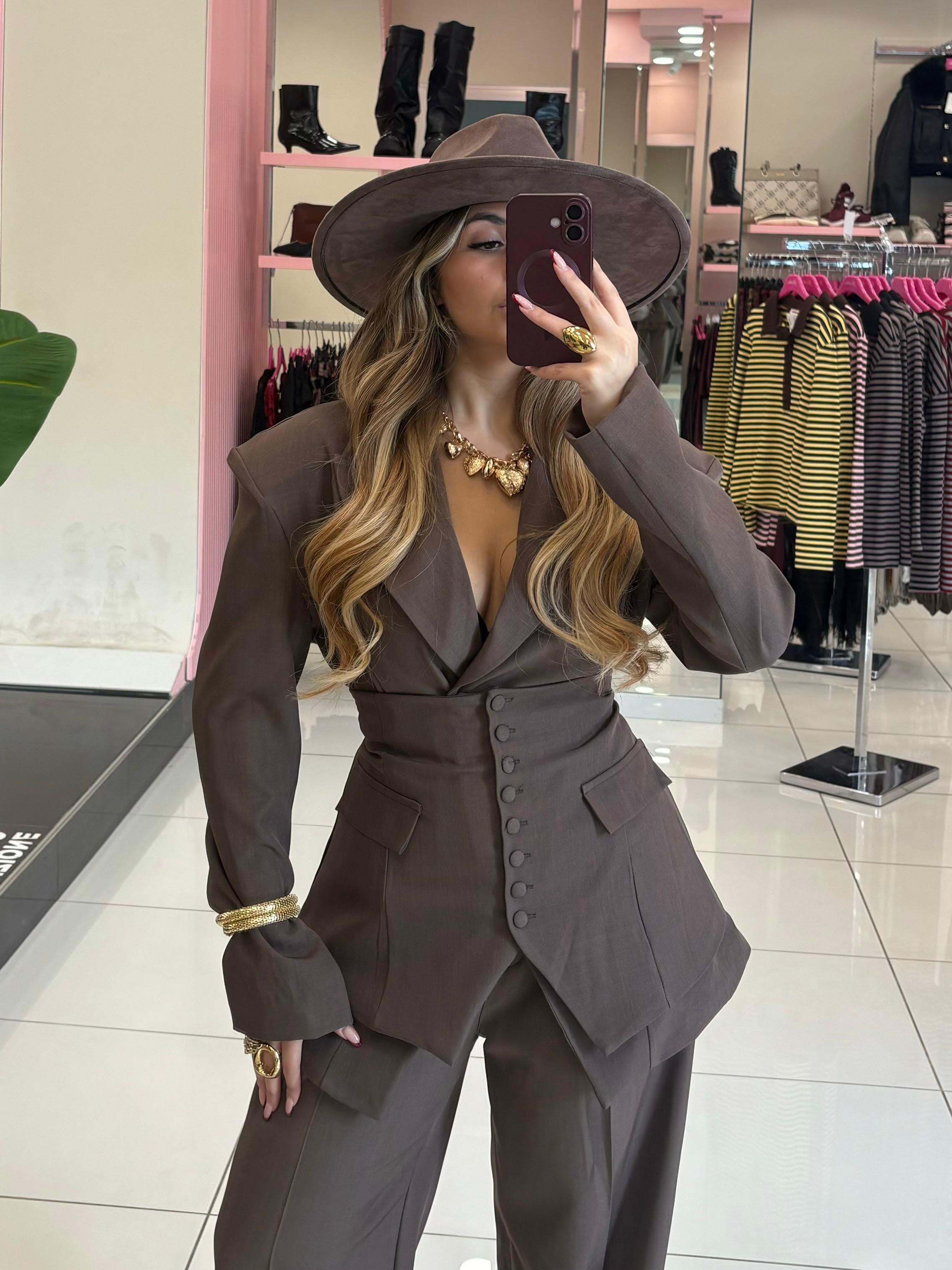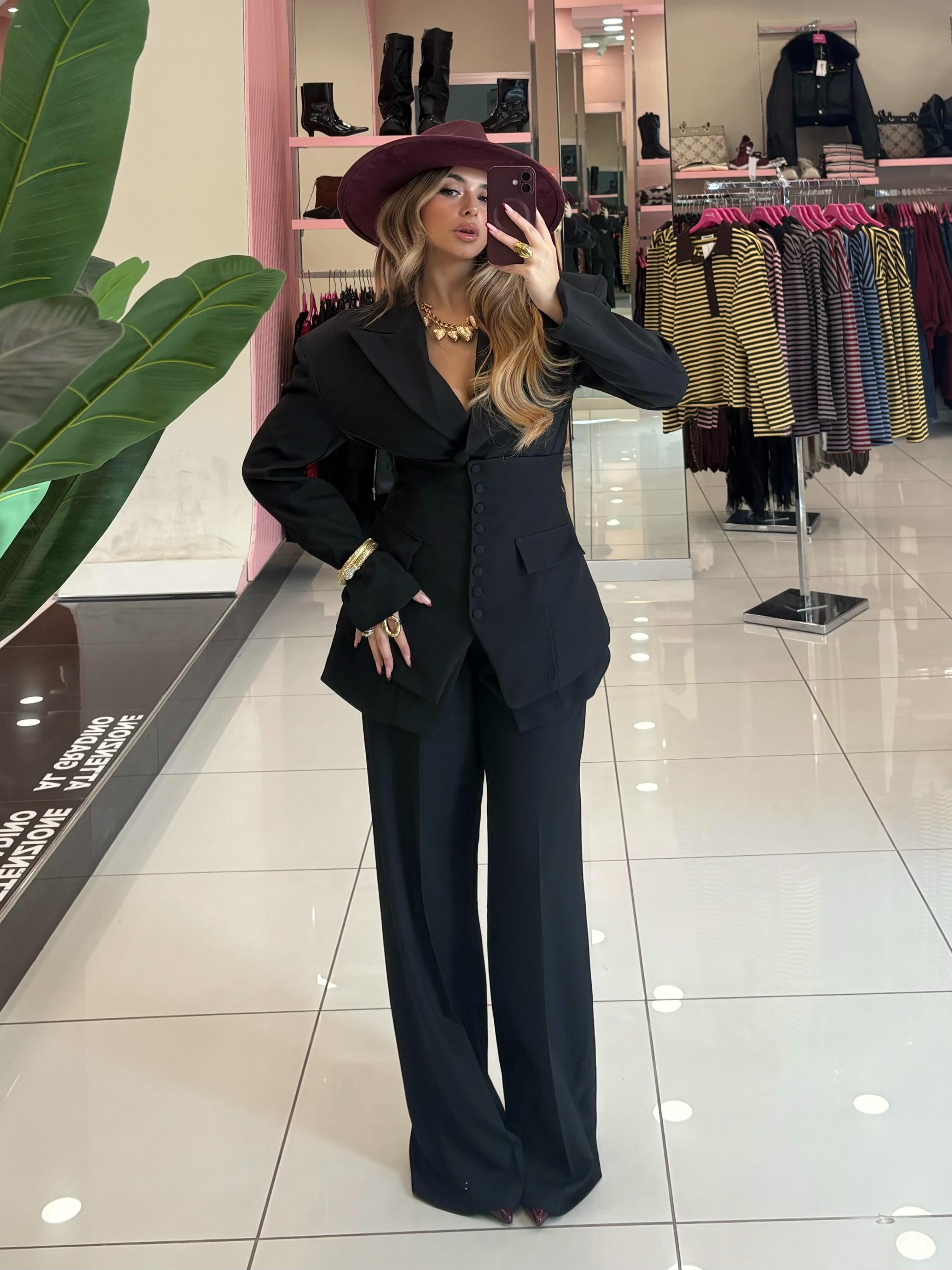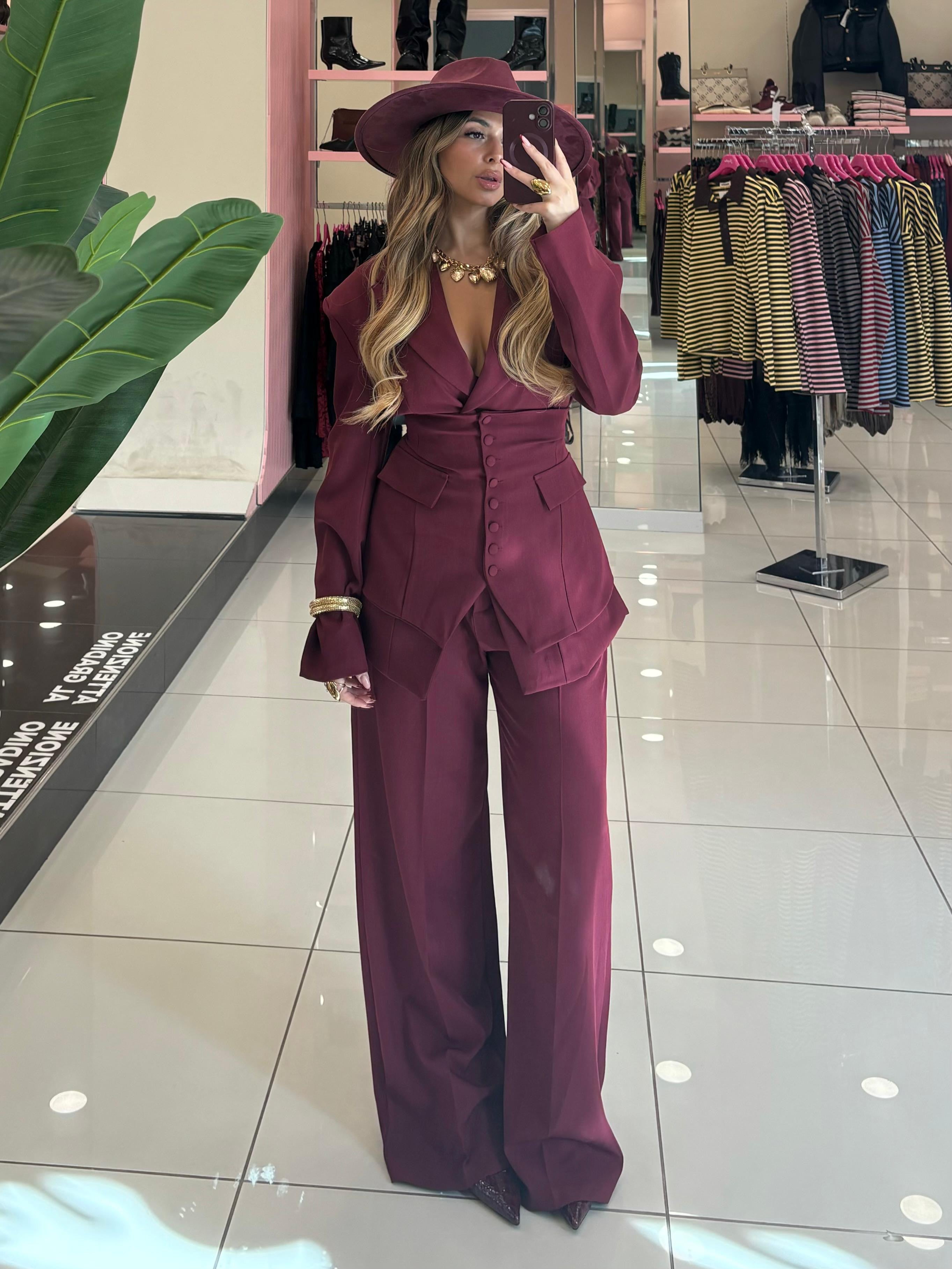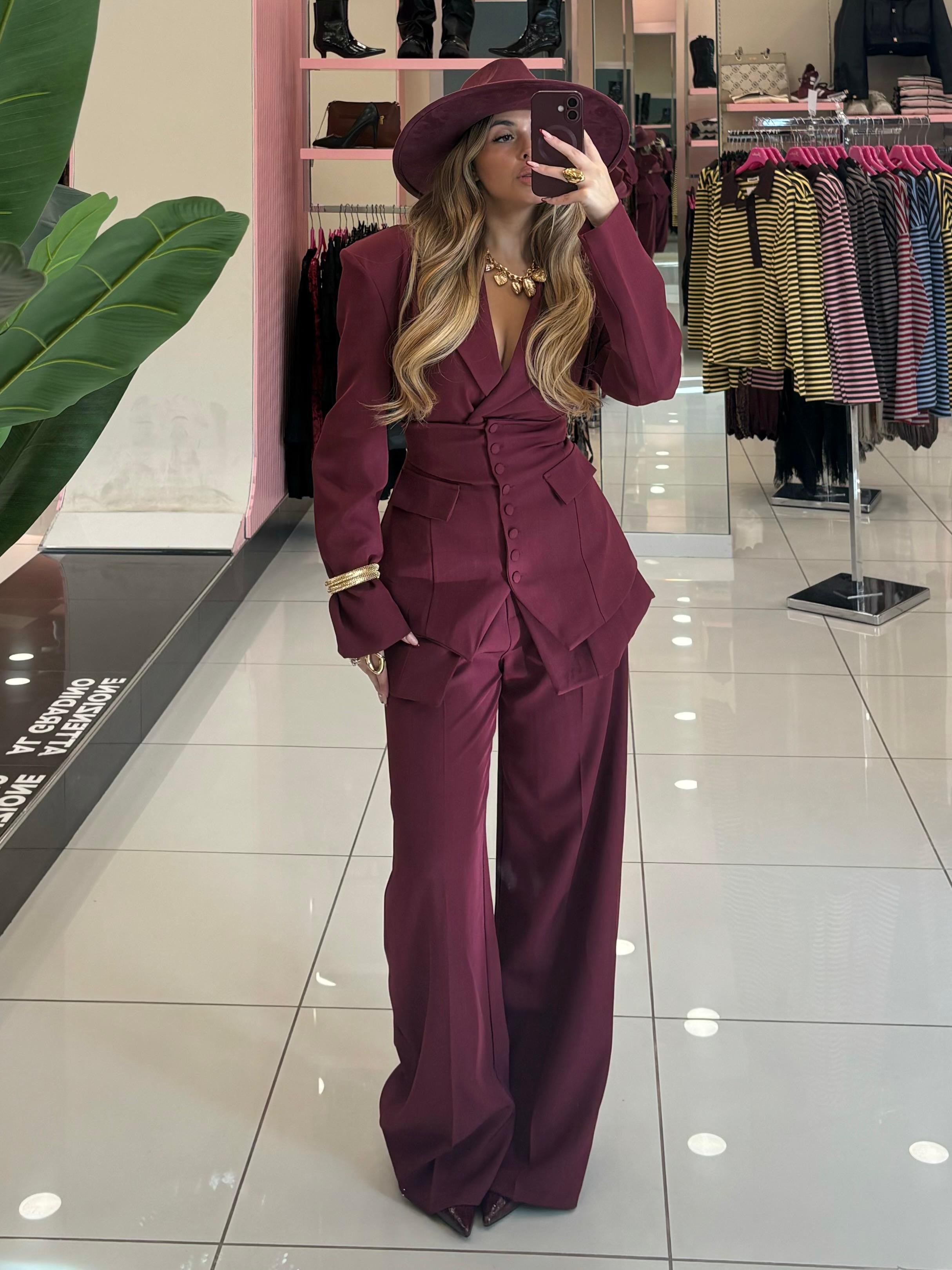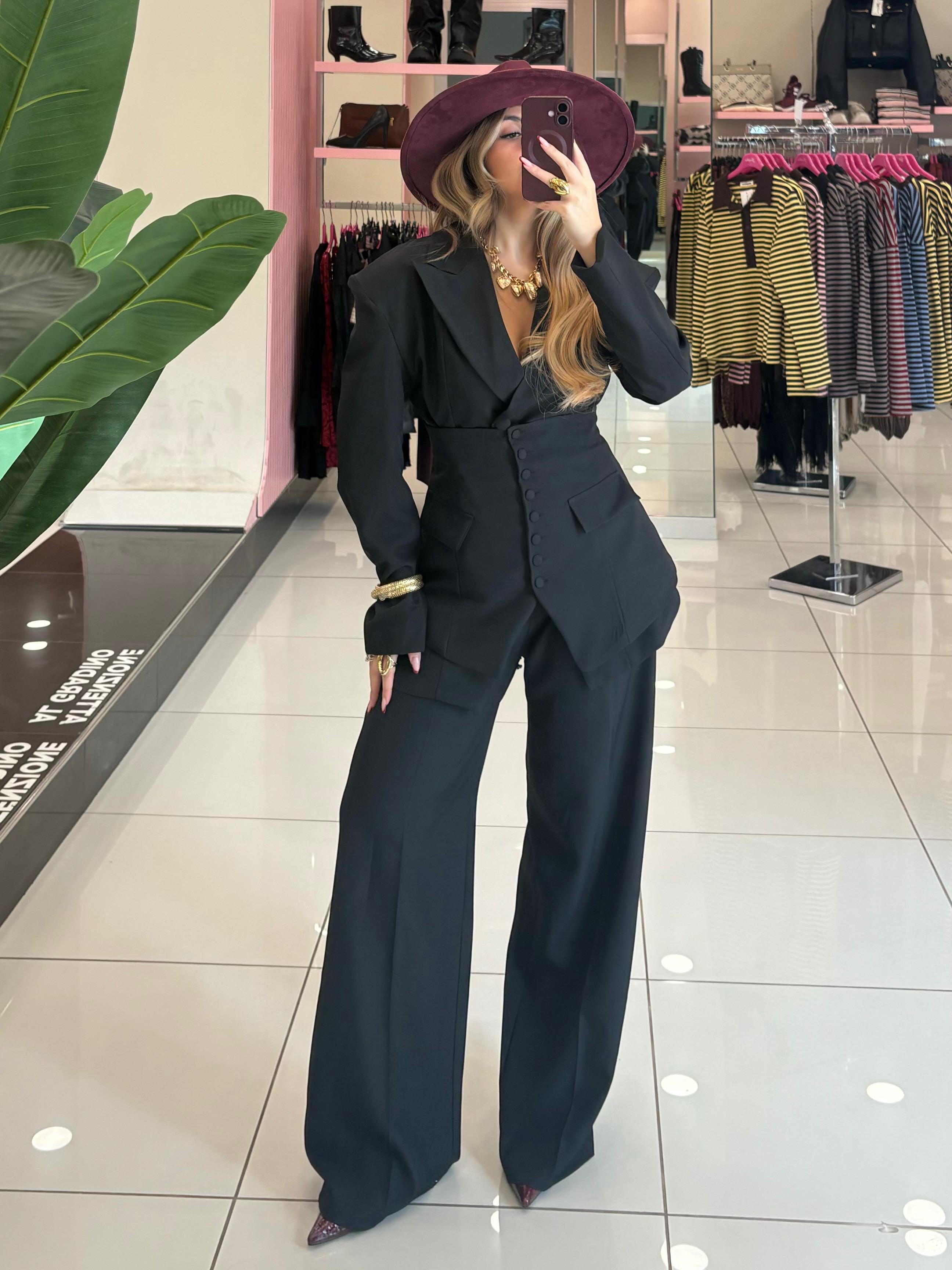 Tailleur composto da giacca pantalone e panciotto con fiocco posteriore