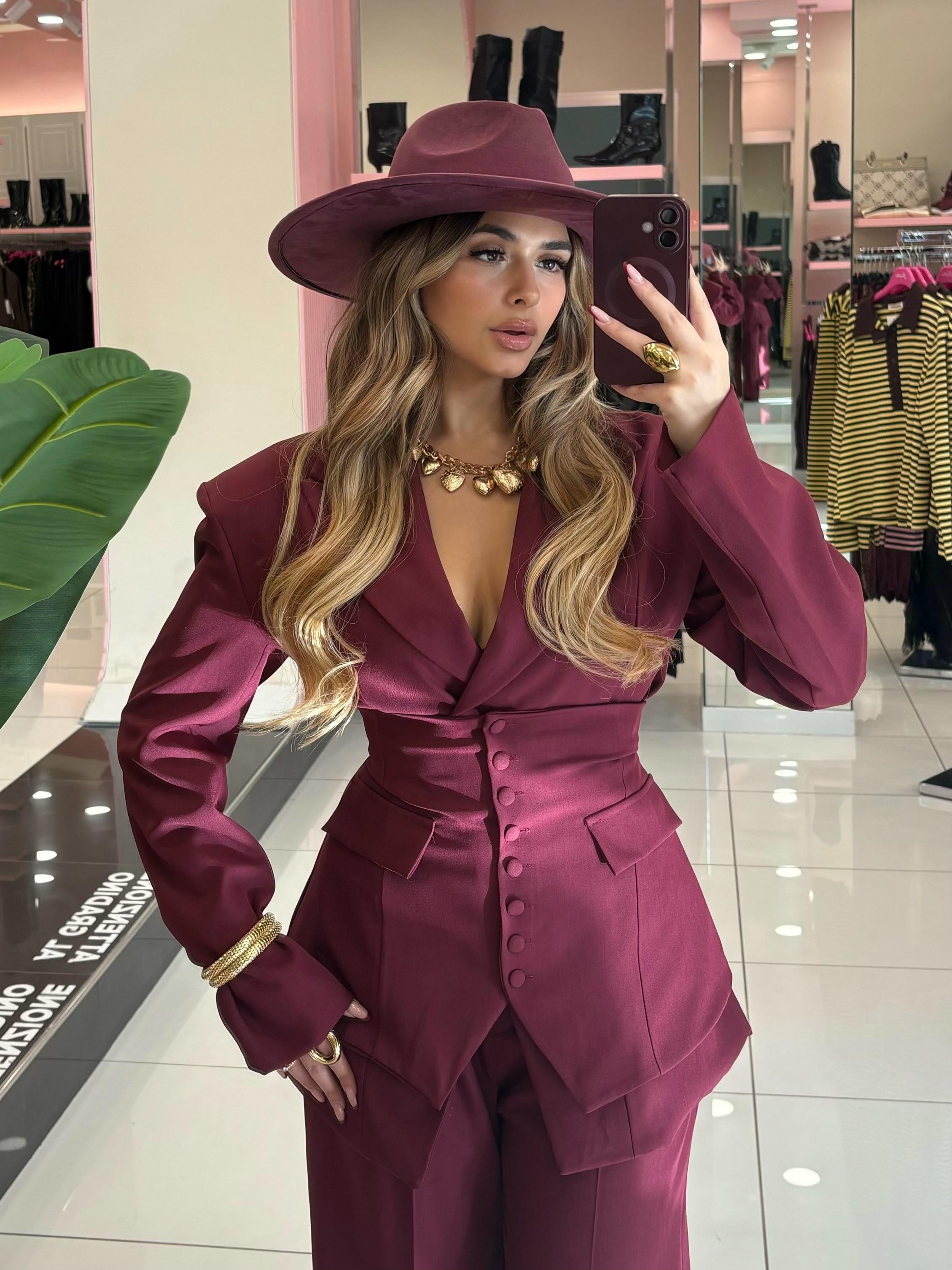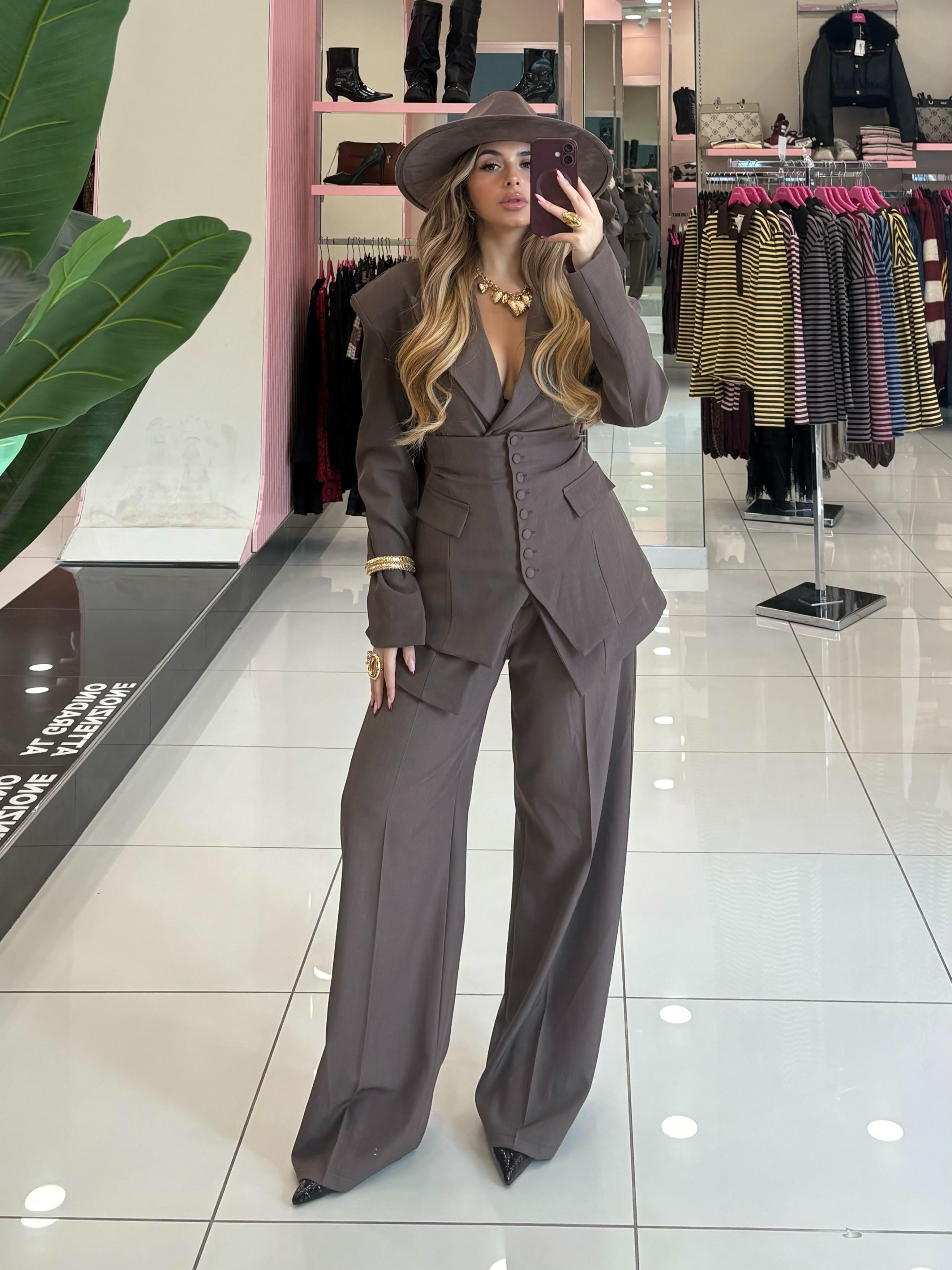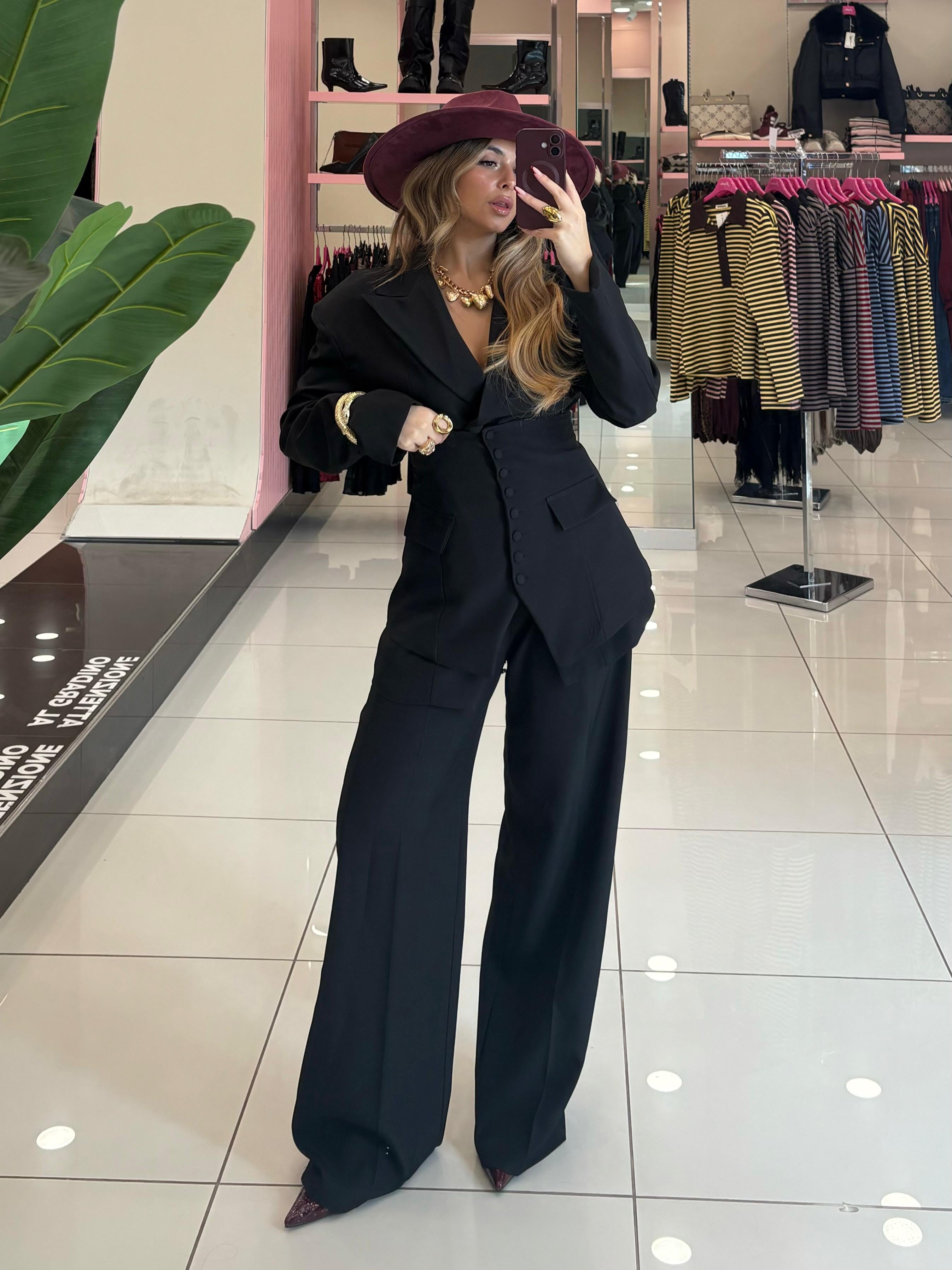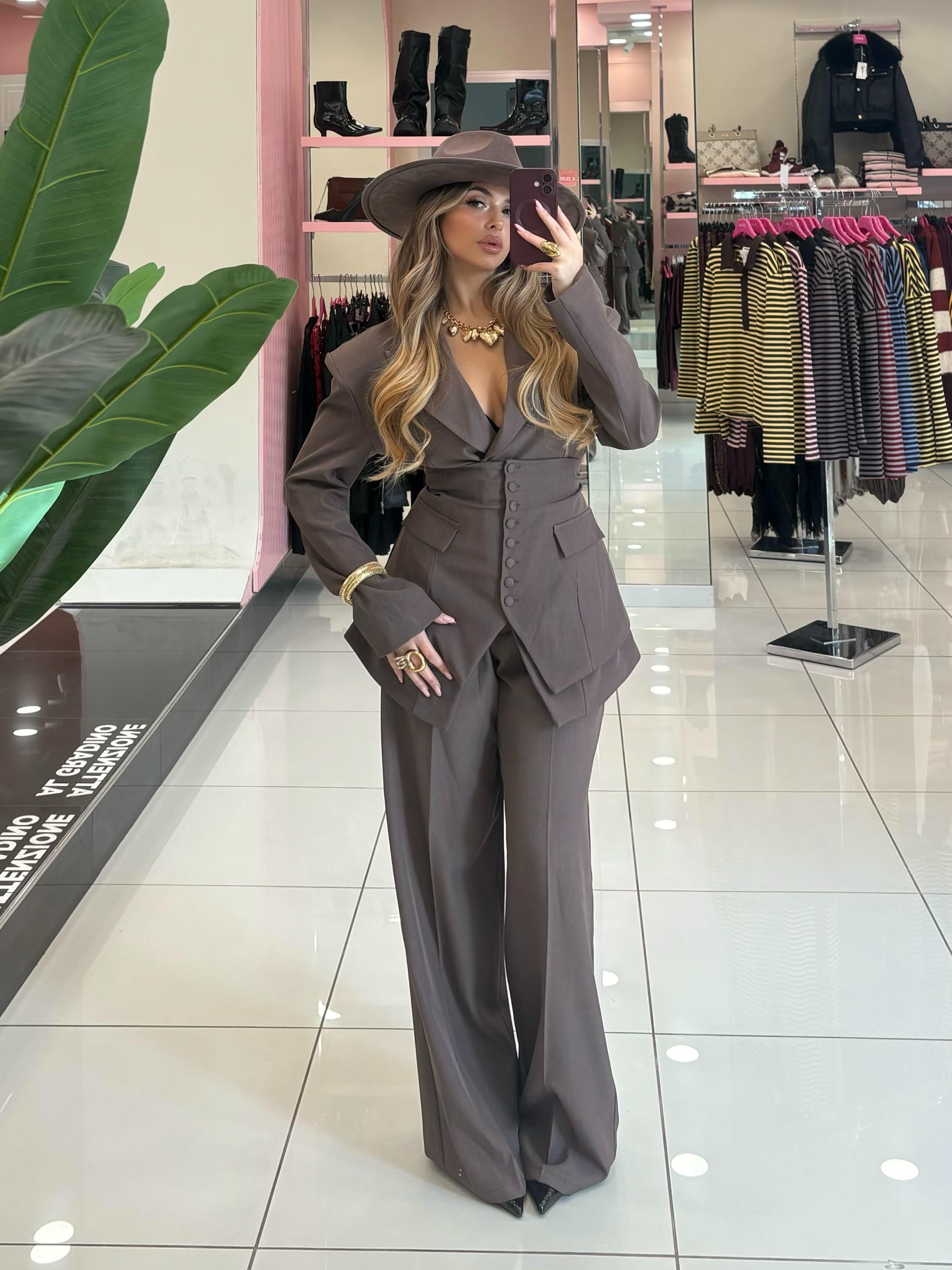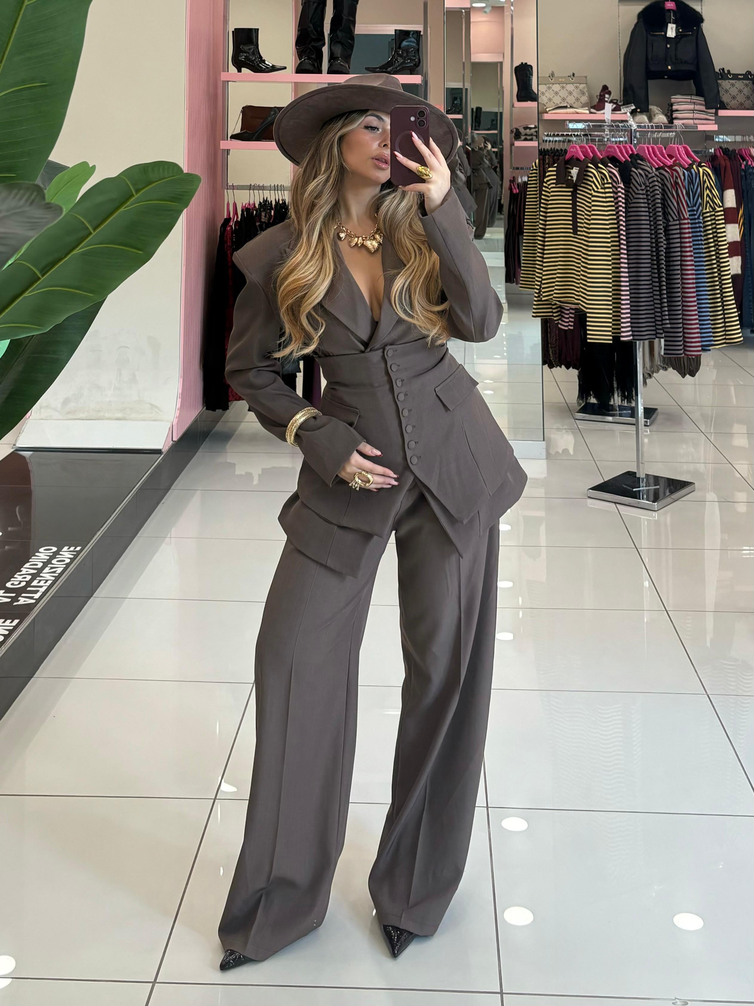 Tailleur composto da giacca pantalone e panciotto con fiocco posteriore