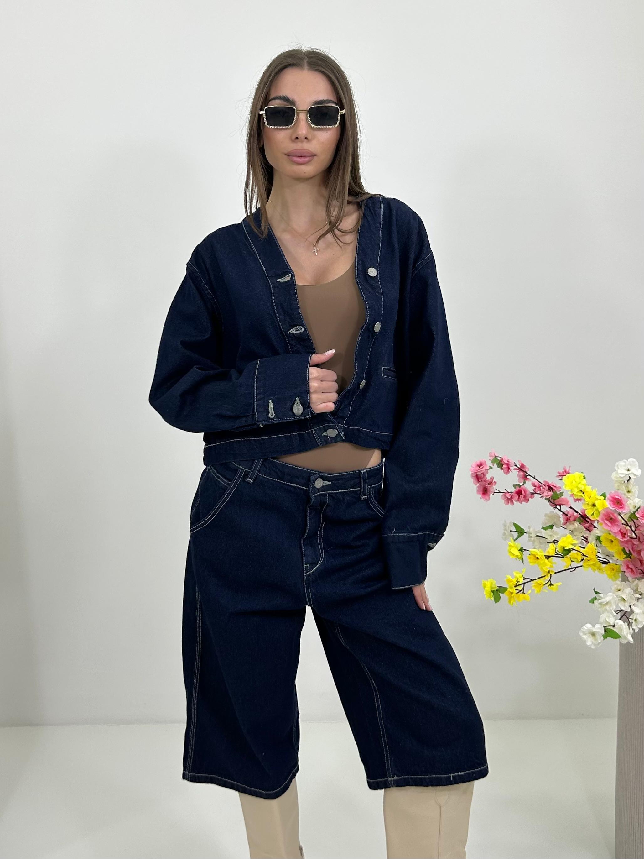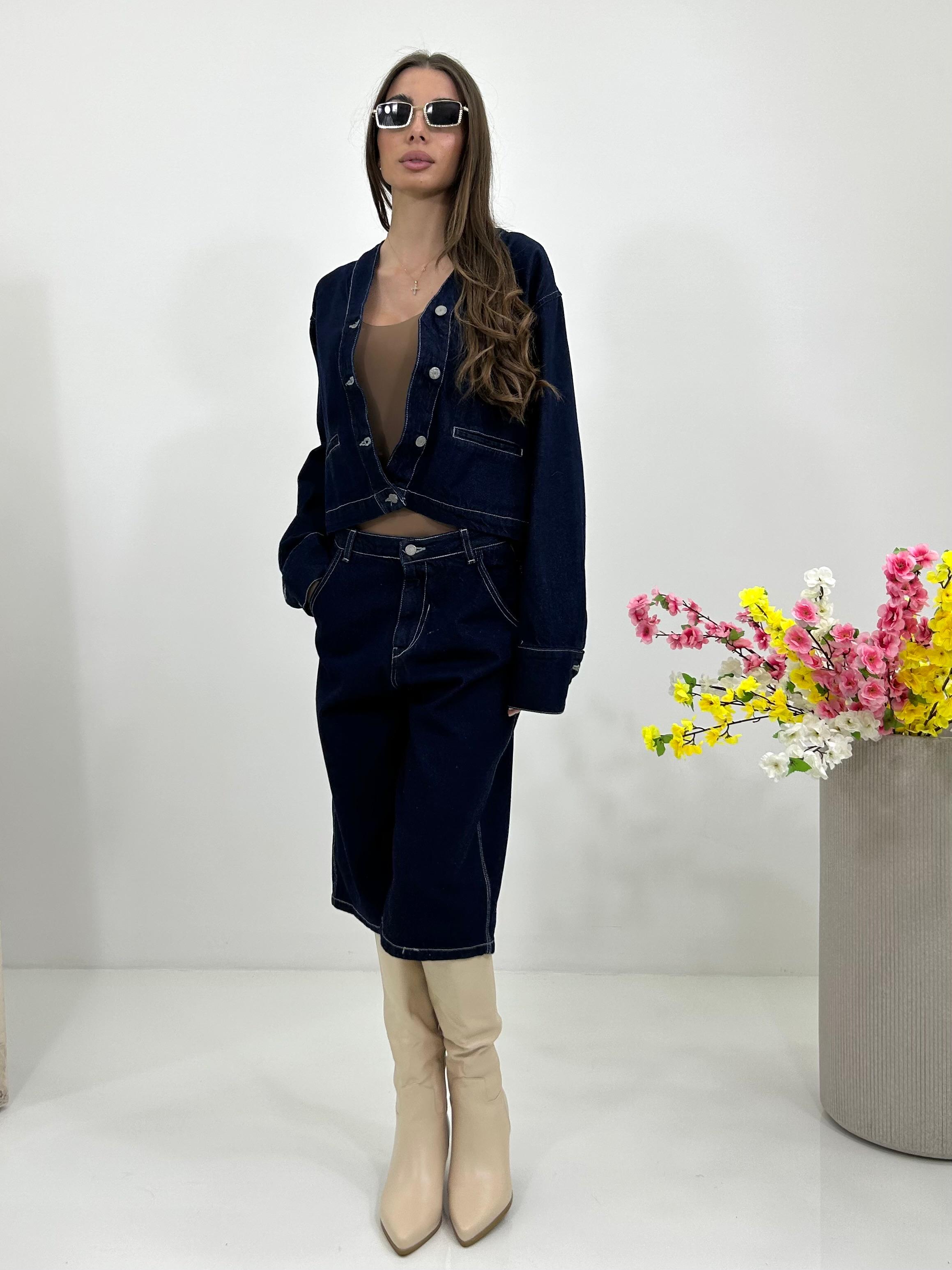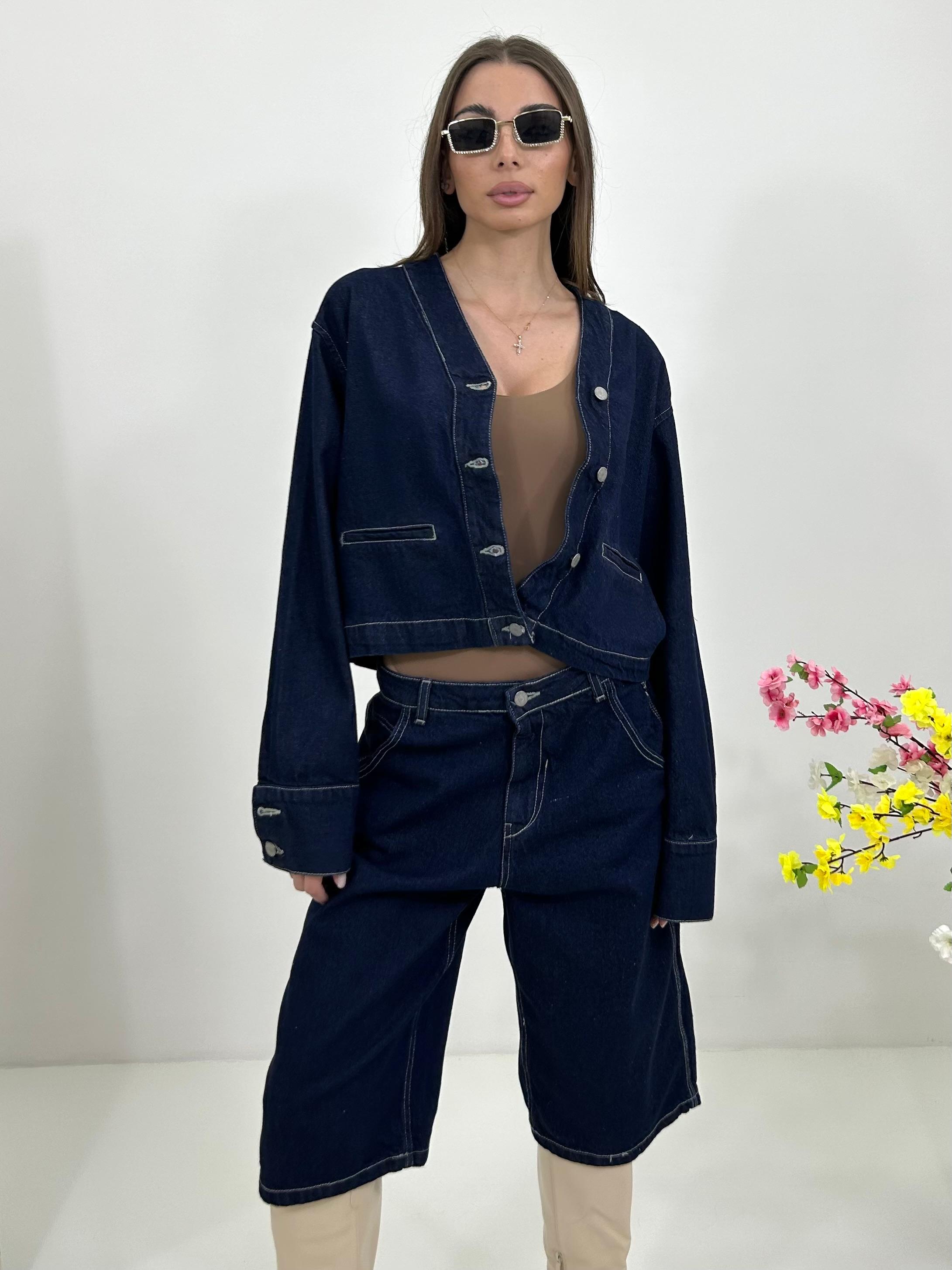 Completo denim compoSto da: giacca scollo v e bottoni e bermuda con tasche