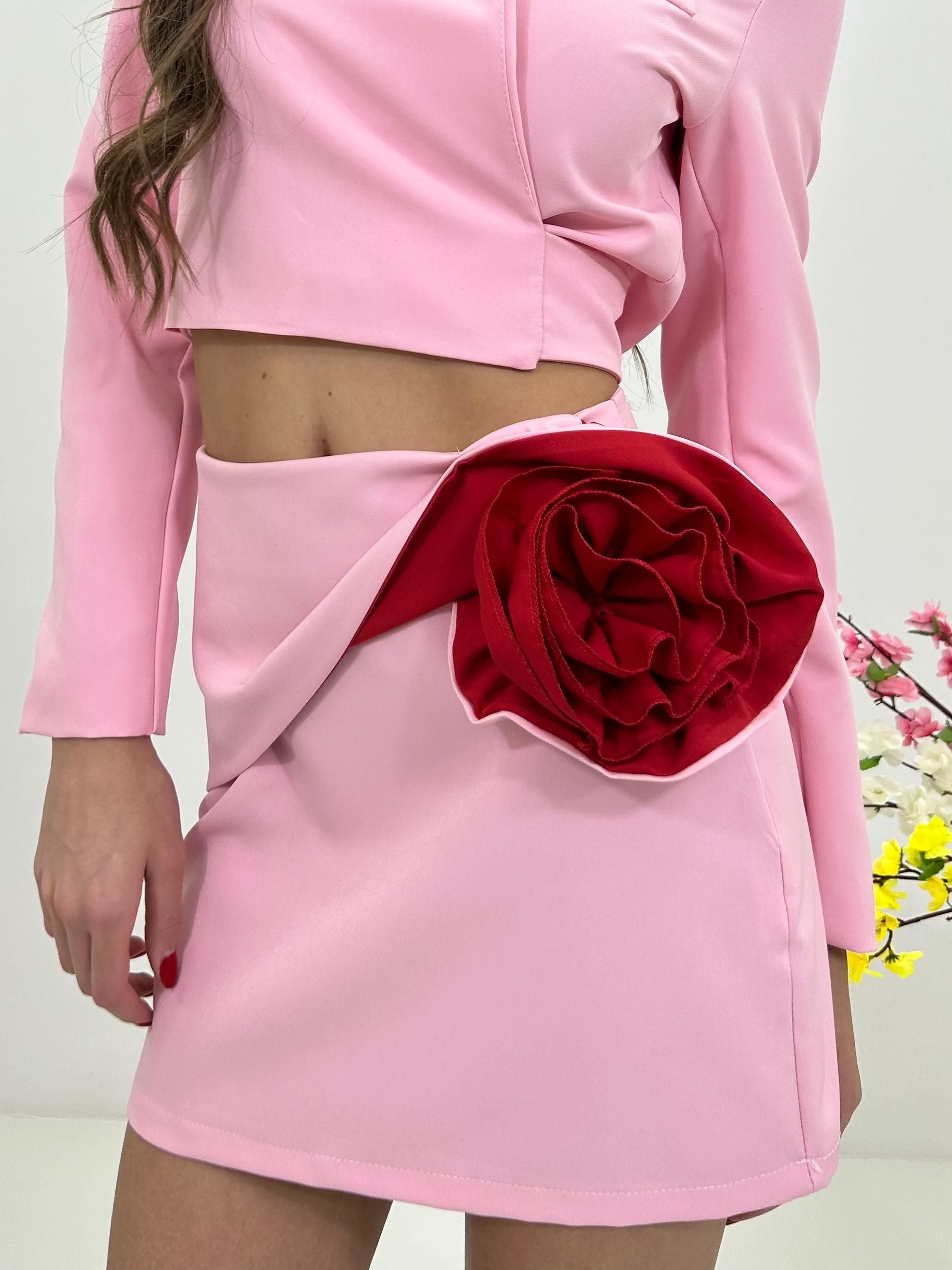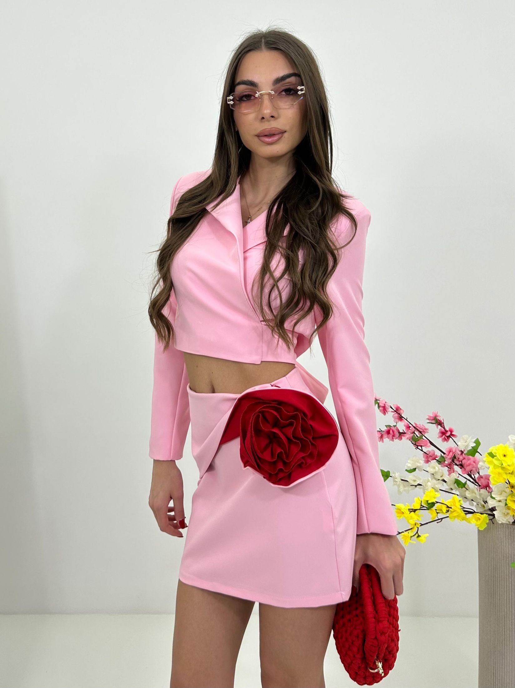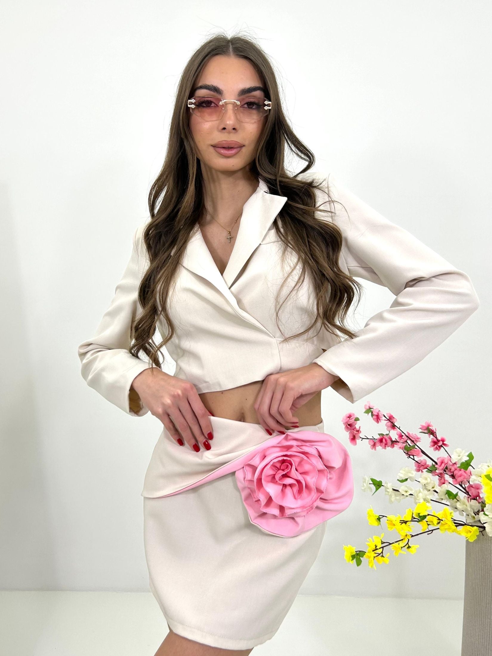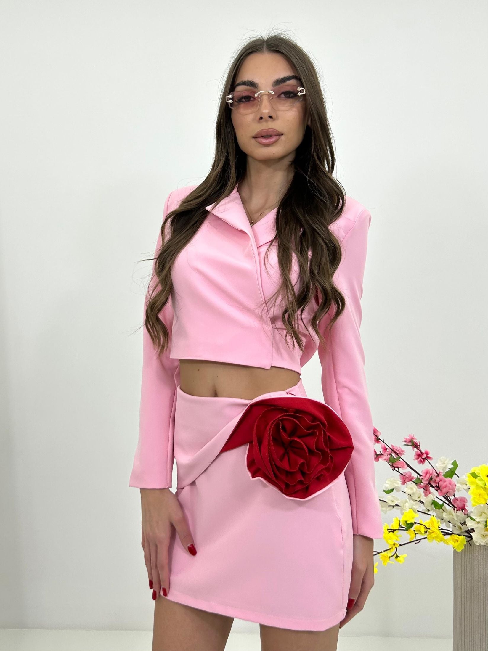 Completo composto da giacca crop con spalline e gonna con applicazione fiore e chiusura lampo