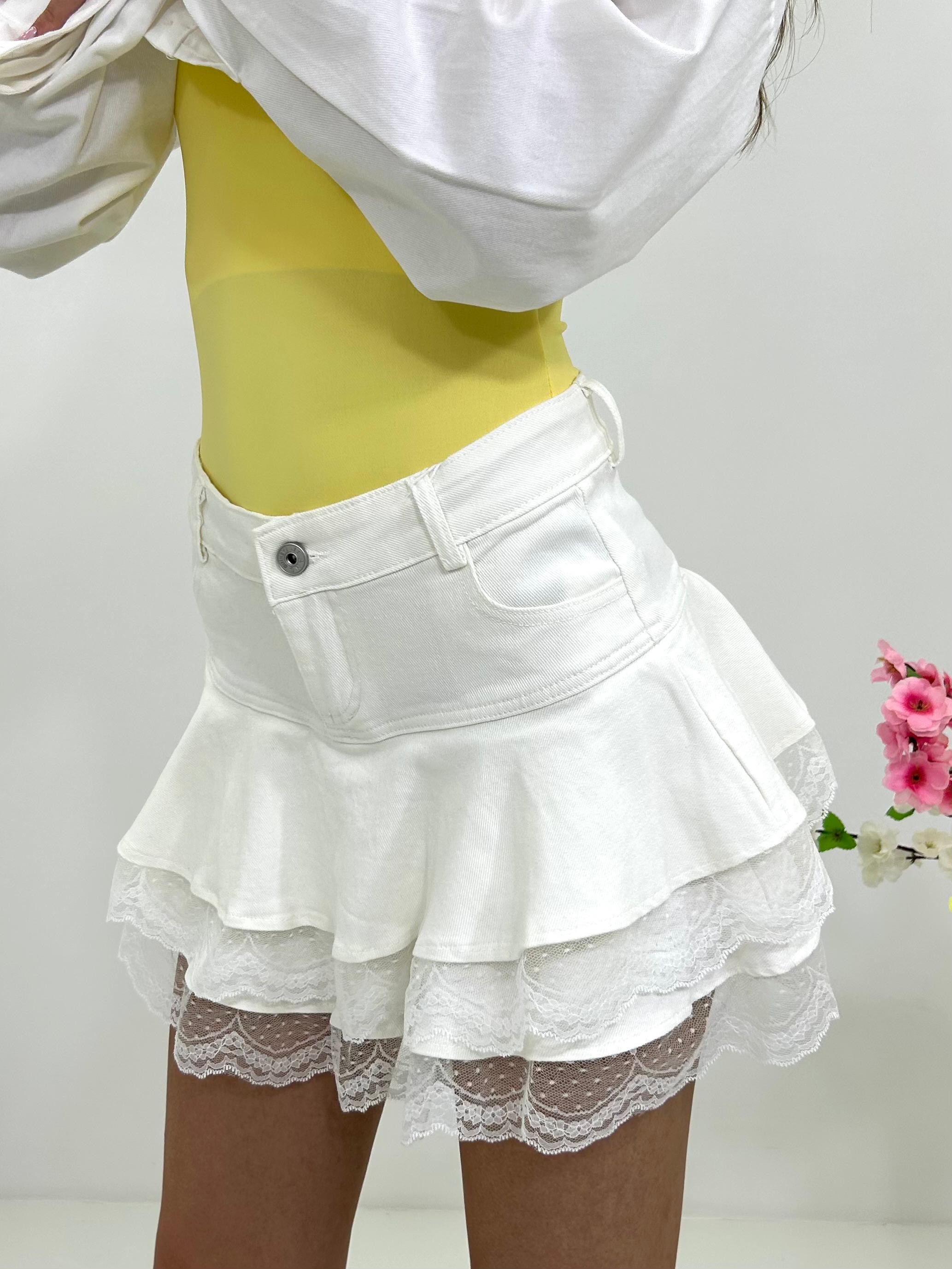 Shorts finta gonna con balze e pizzo, chiusura con zip e un bottone