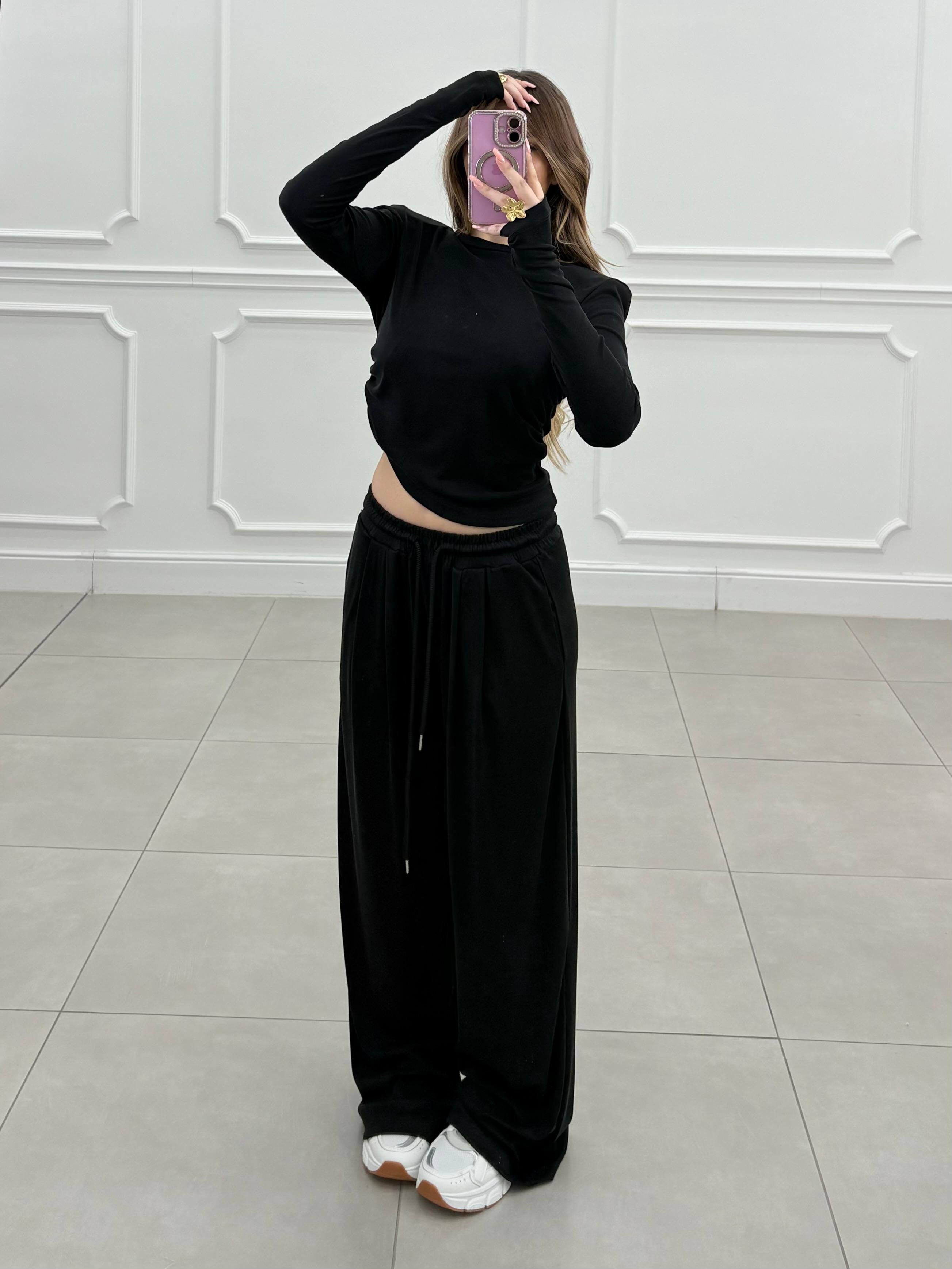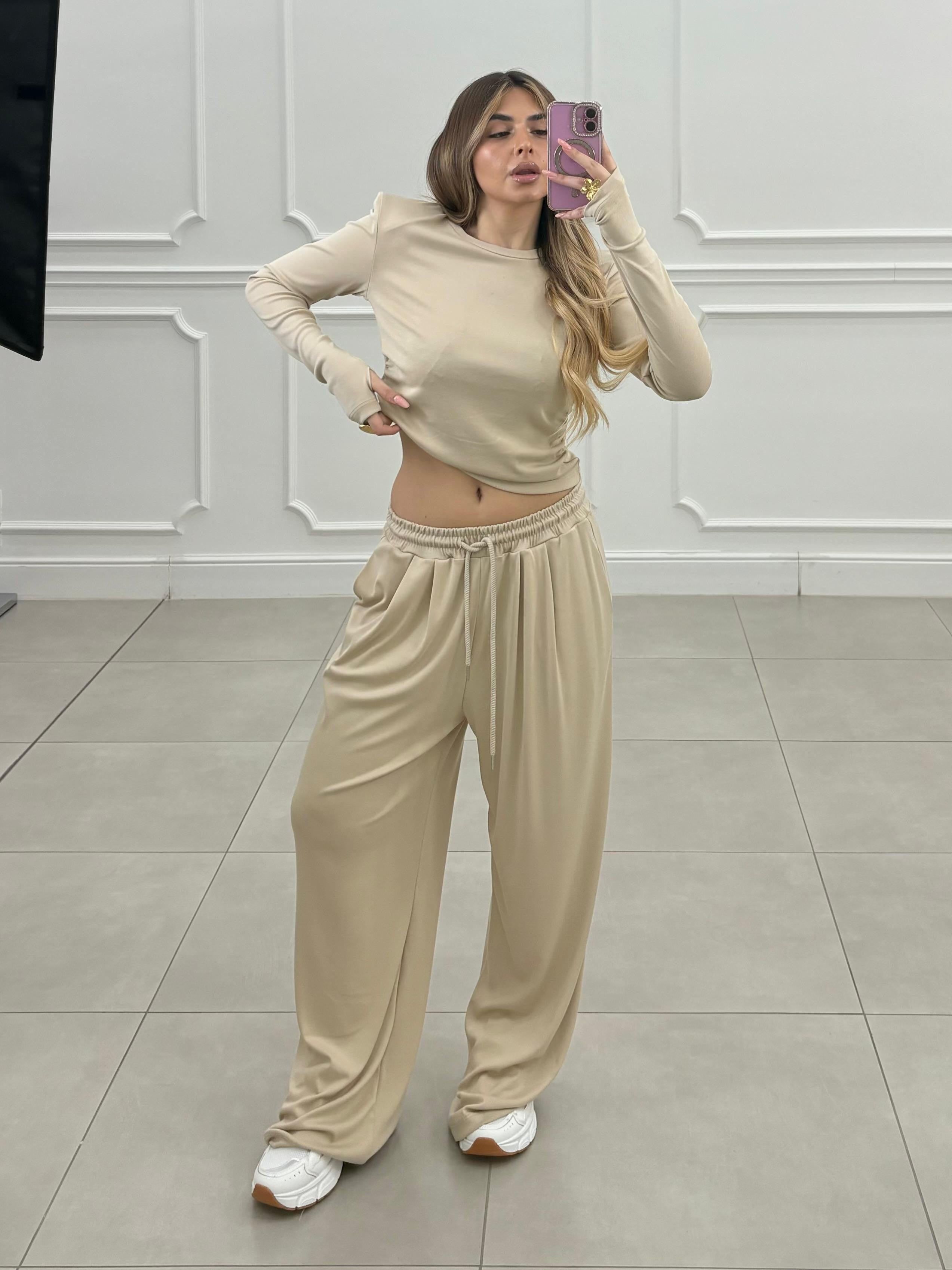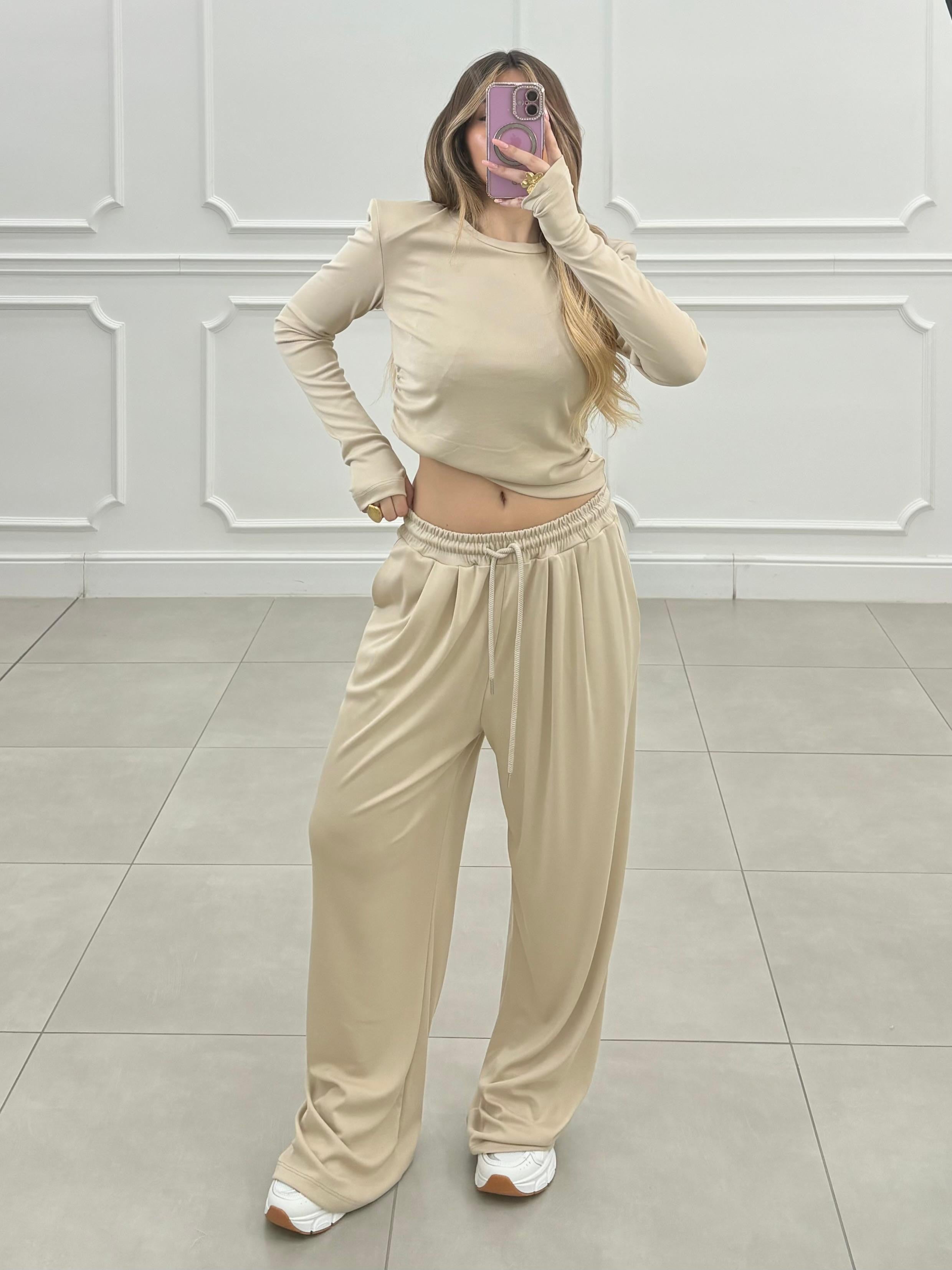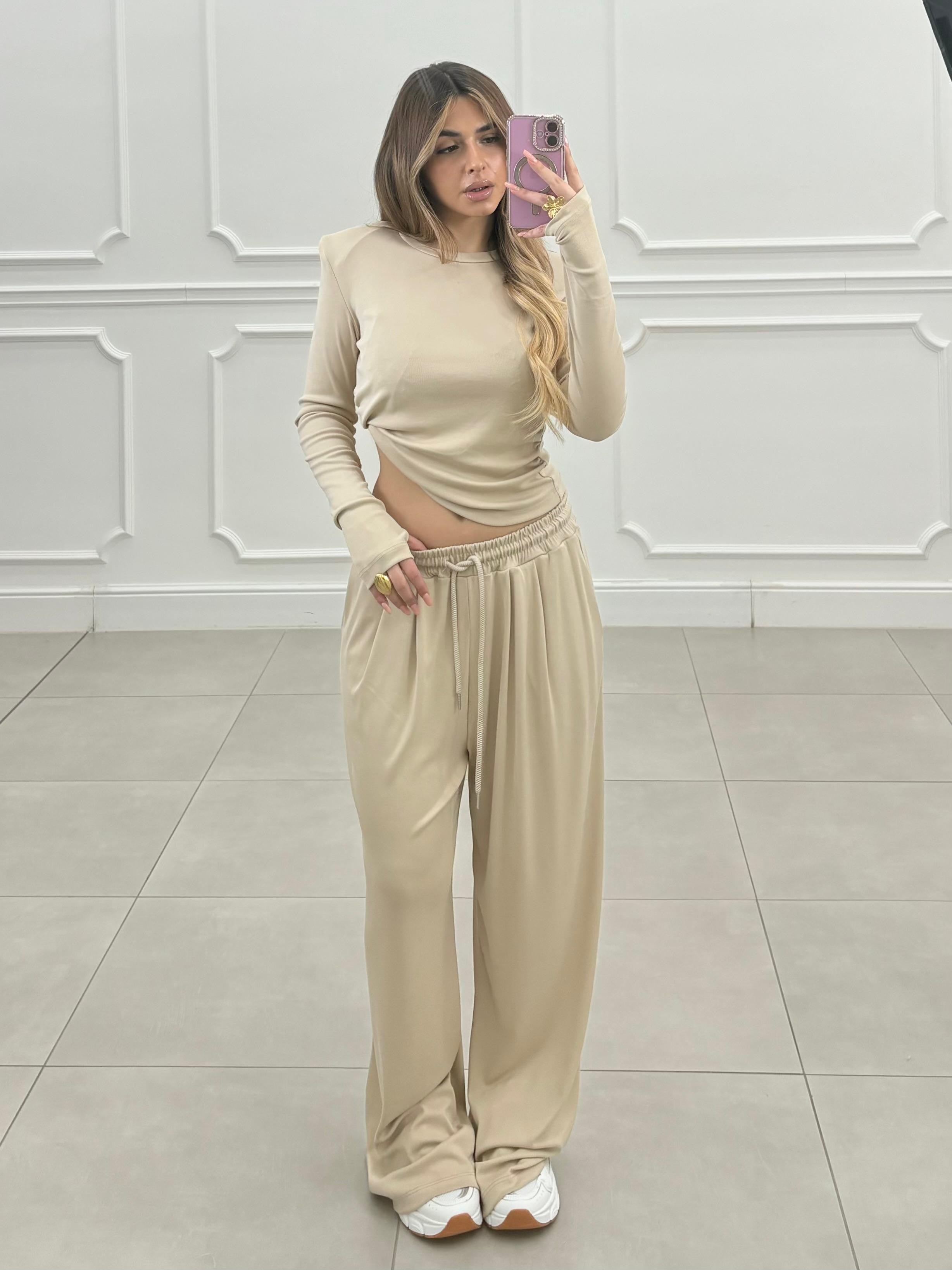 Completo dal fit morbido. Pantalone con elastico in vita, maglia con spalline e leggere arriciatura sul fianco