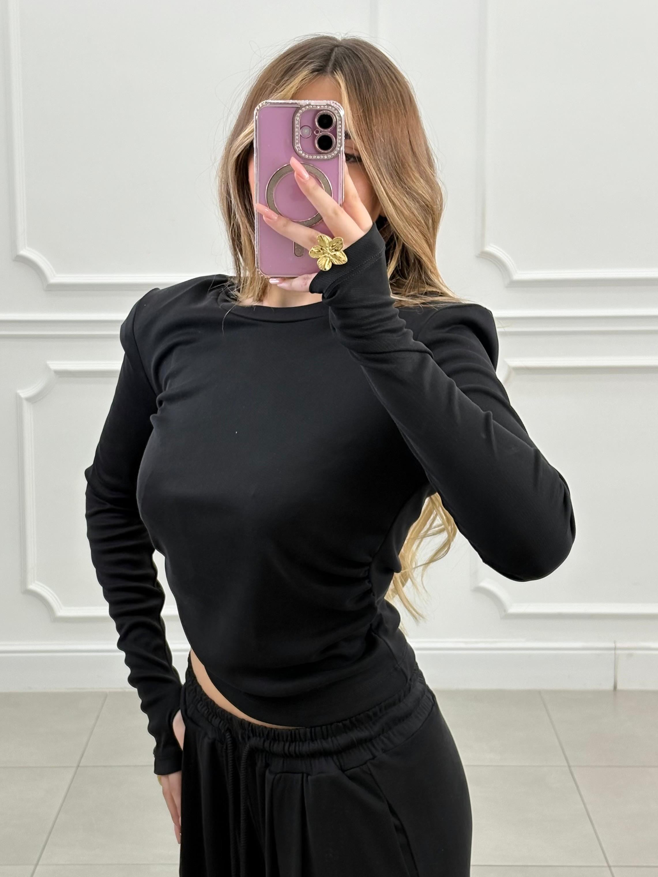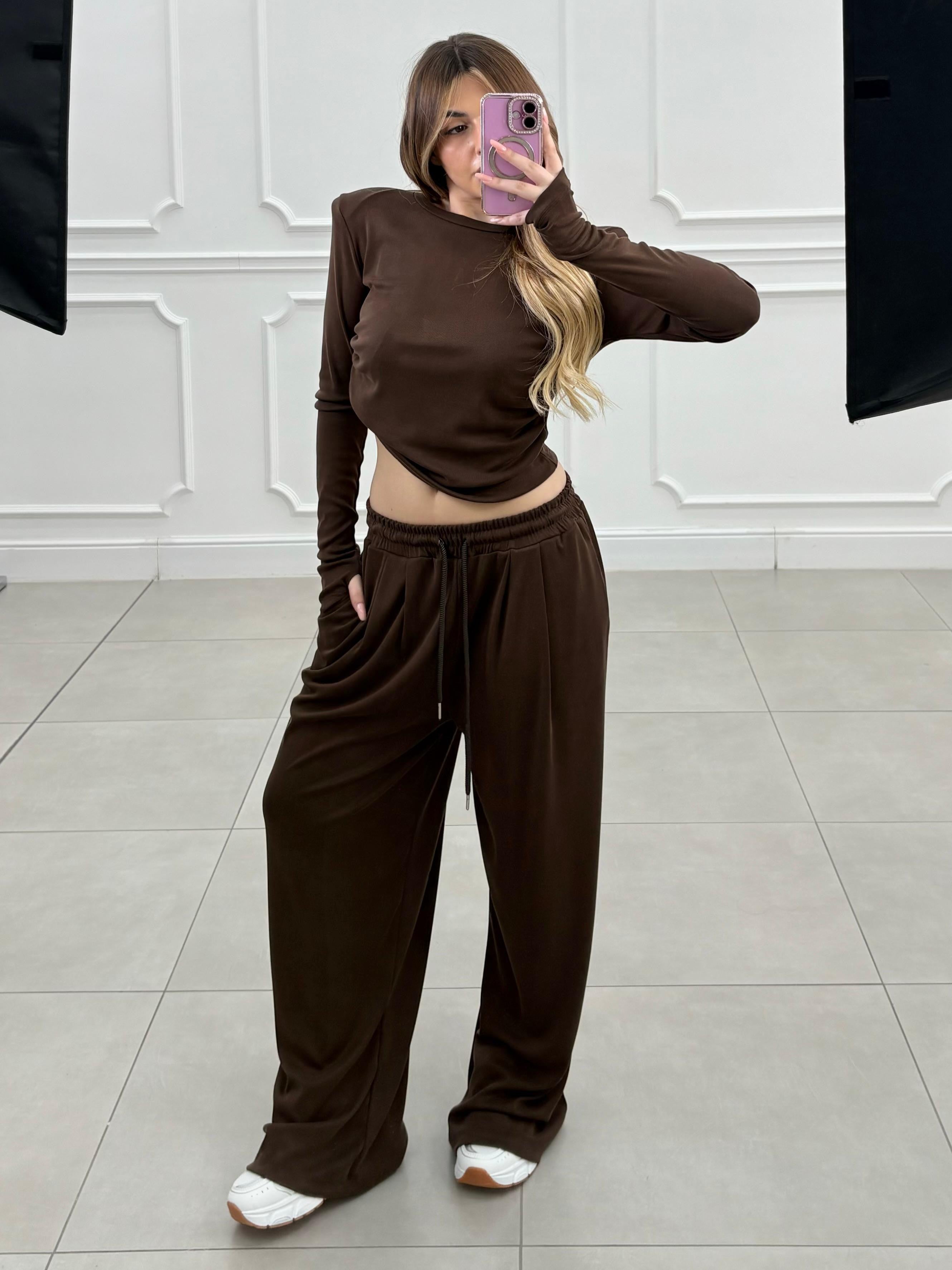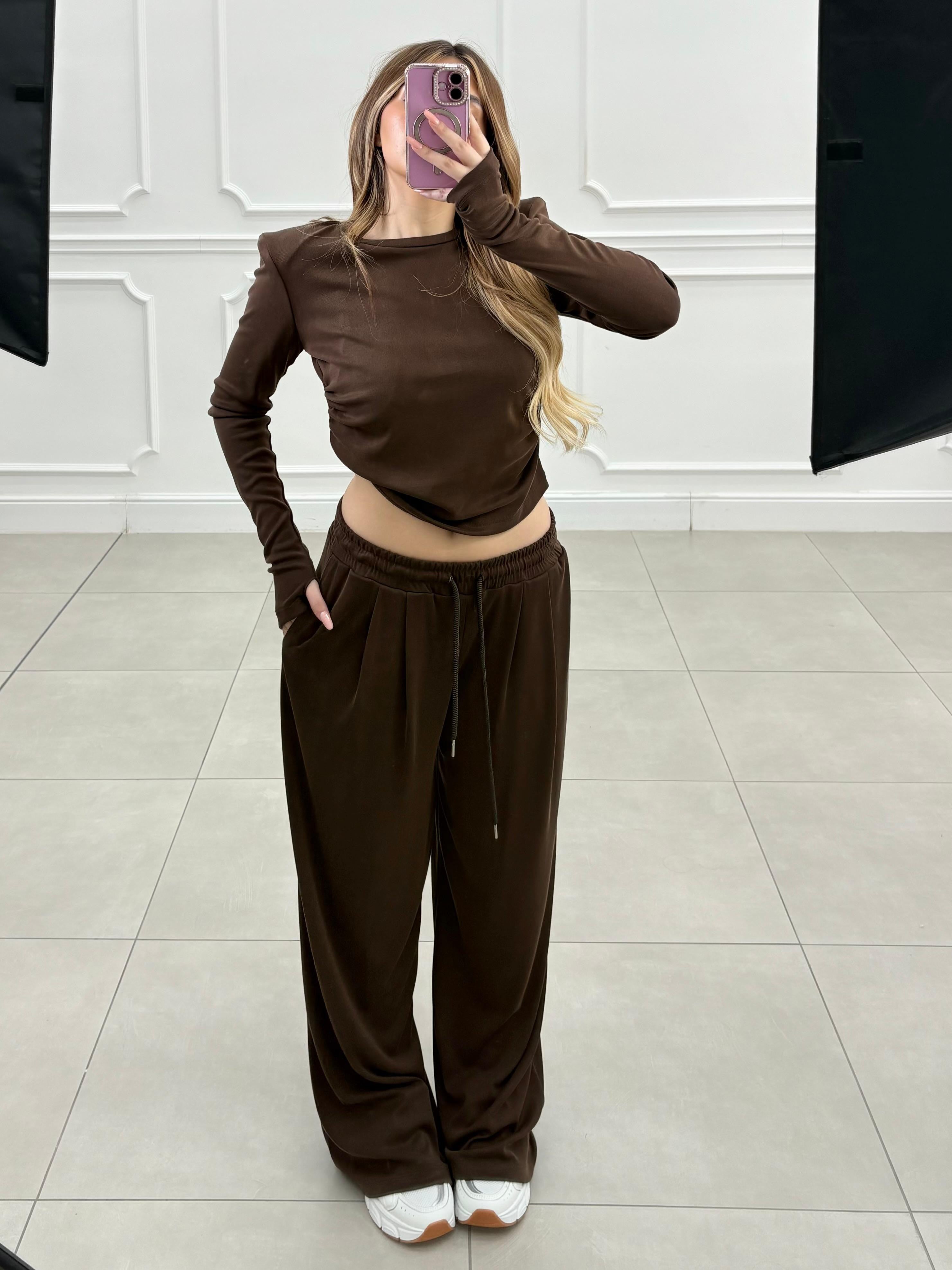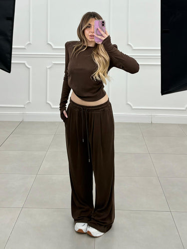 Completo dal fit morbido. Pantalone con elastico in vita, maglia con spalline e leggere arriciatura sul fianco
