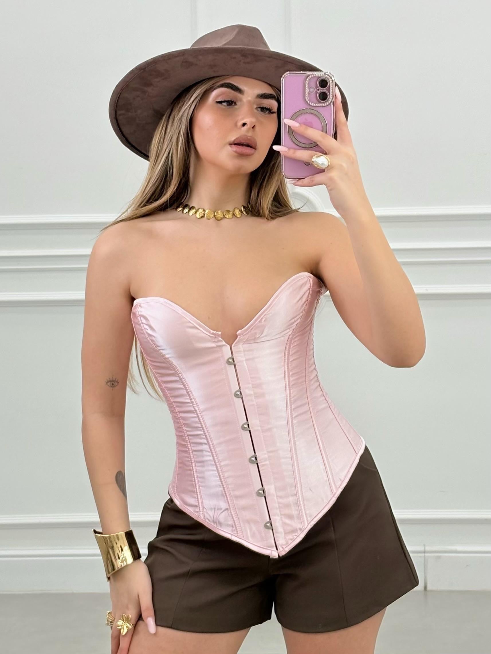 Corpetto raso con stringhe posteriori e clip anteriori.