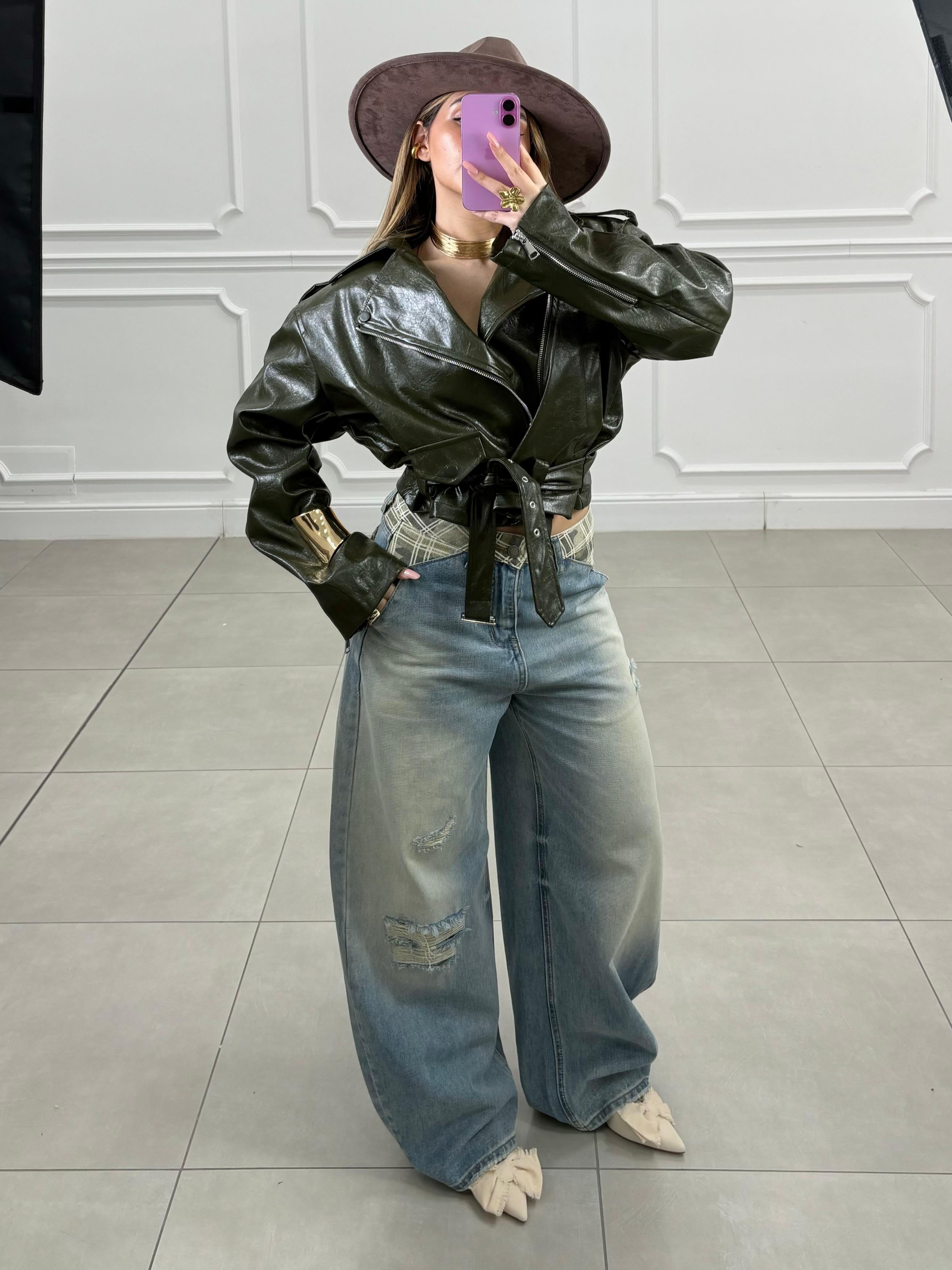 Jeans mood balloon con strappi bustino anteriore e tasche posteriori a quadri