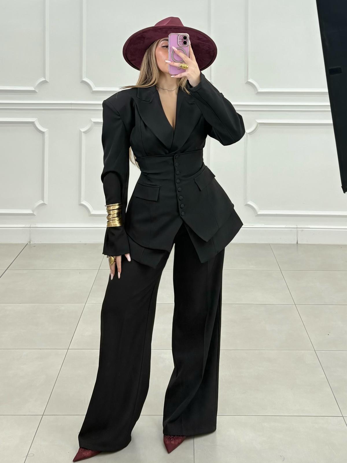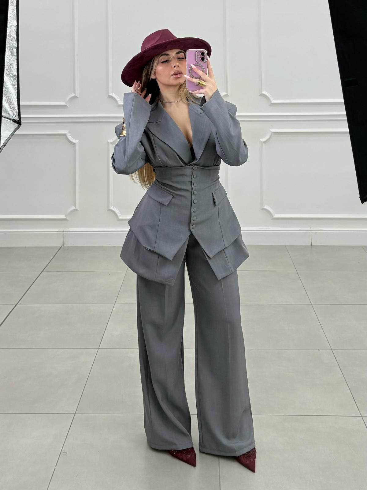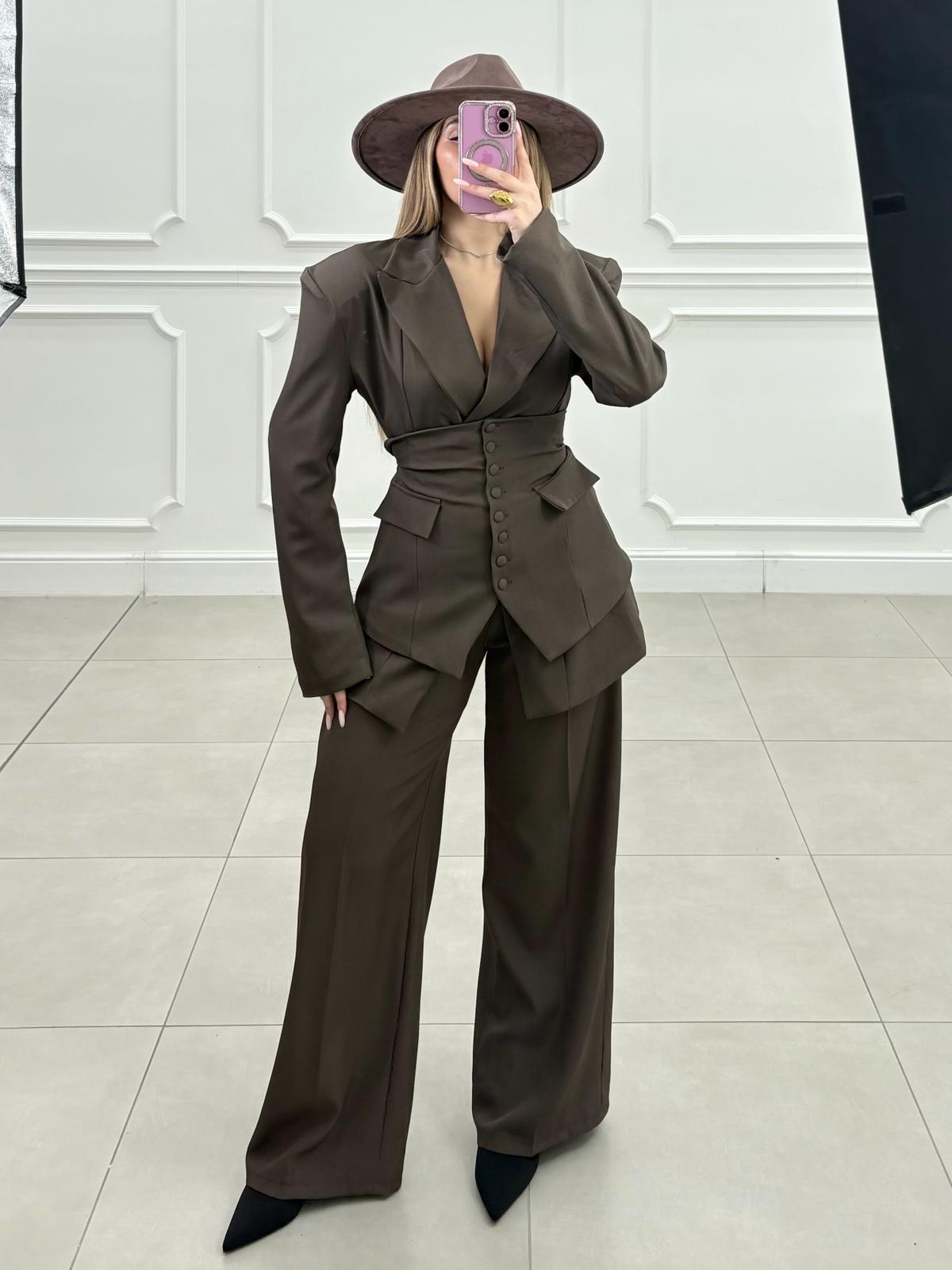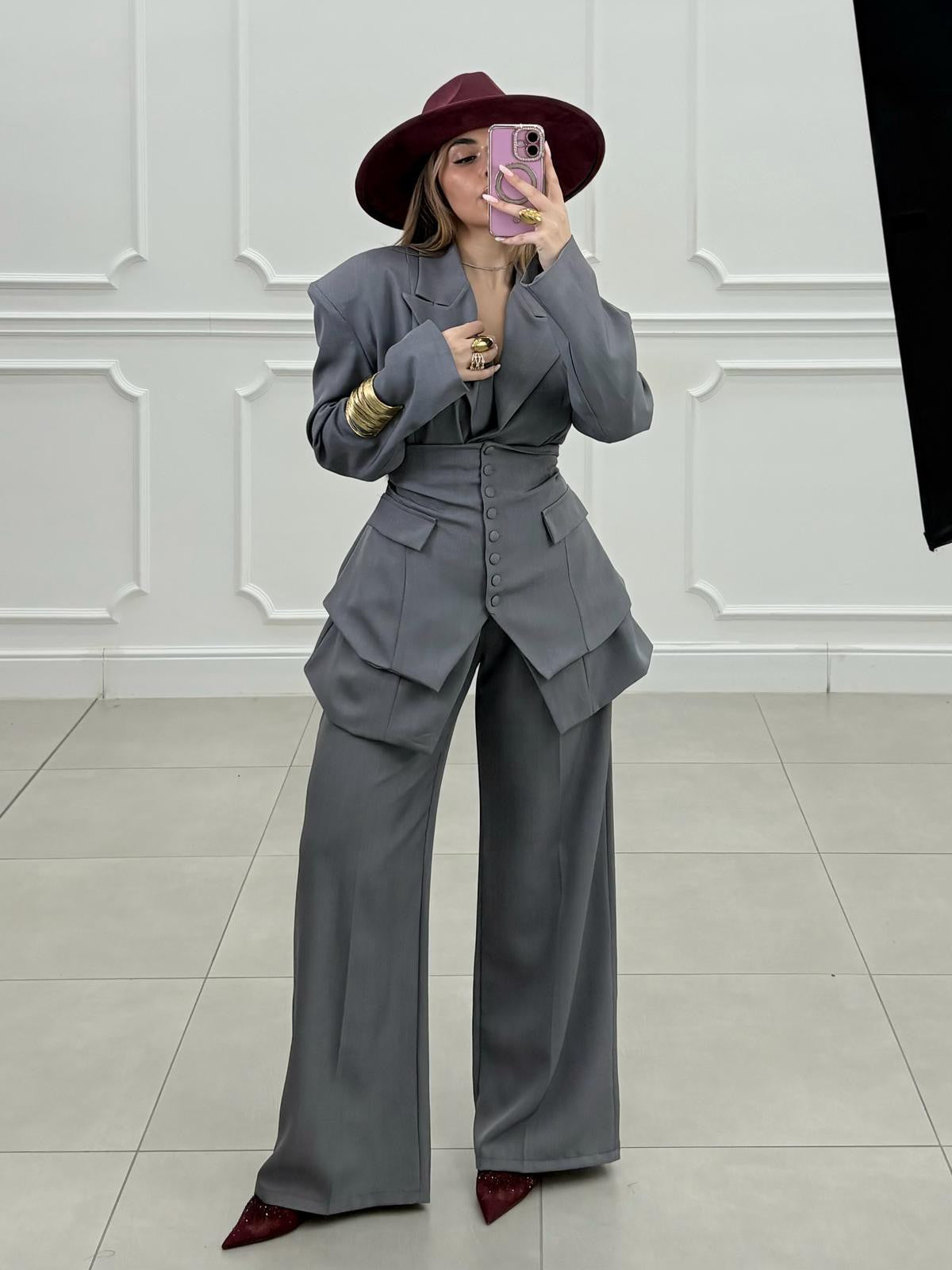 Tailleur composto da giacca pantalone e panciotto con fiocco posteriore