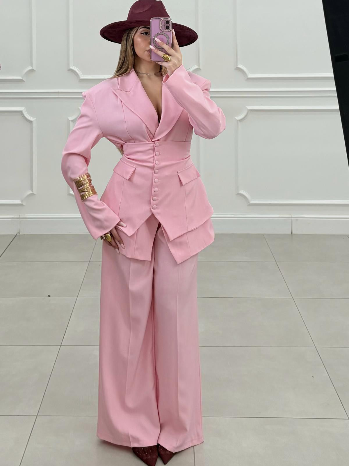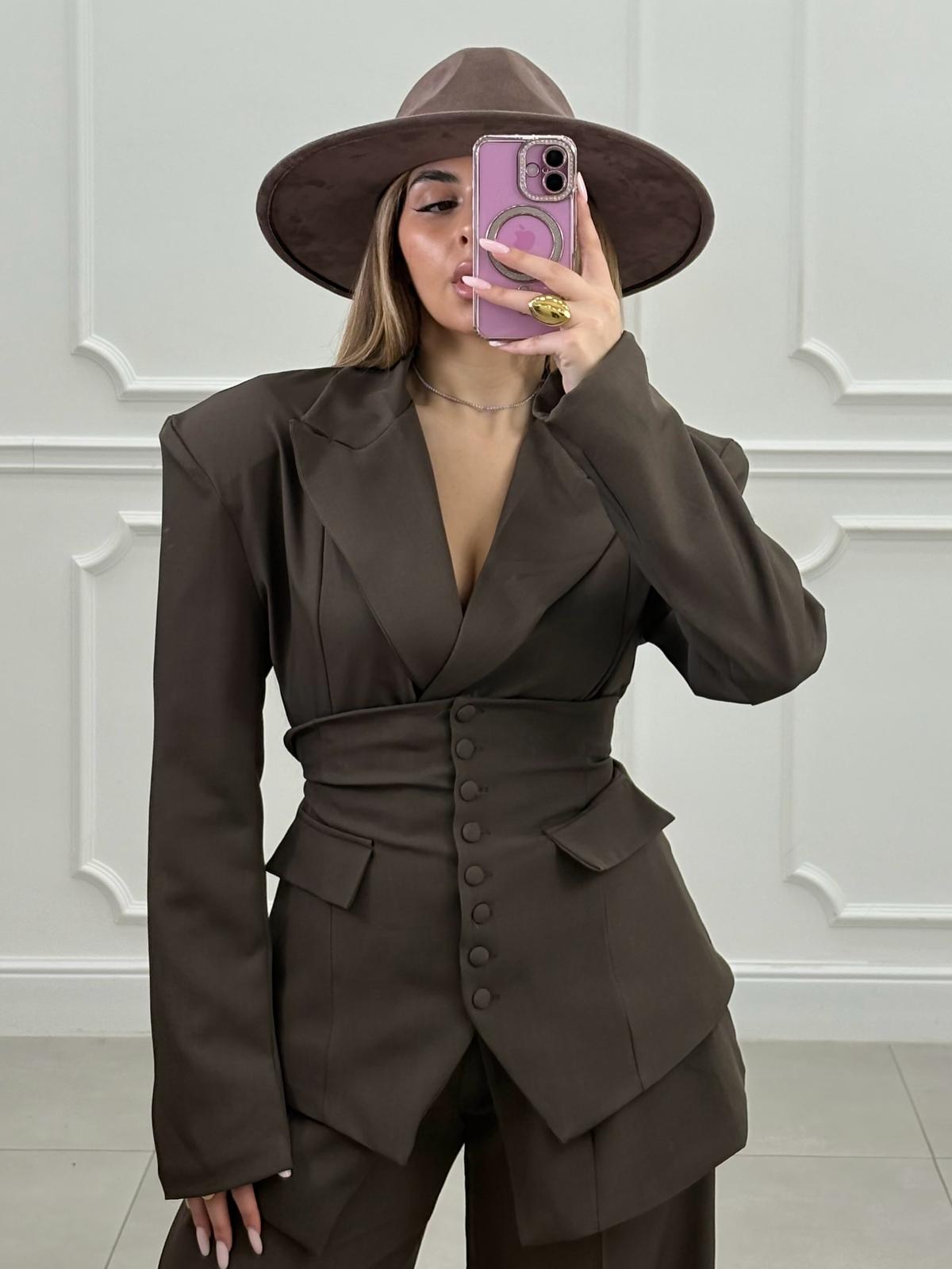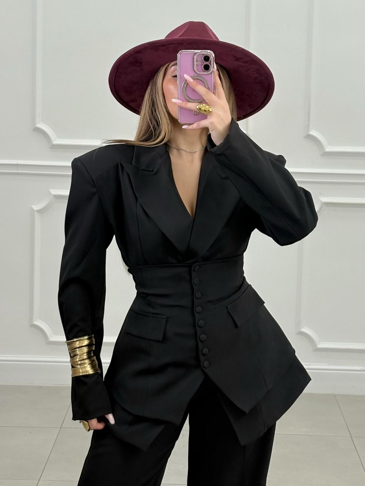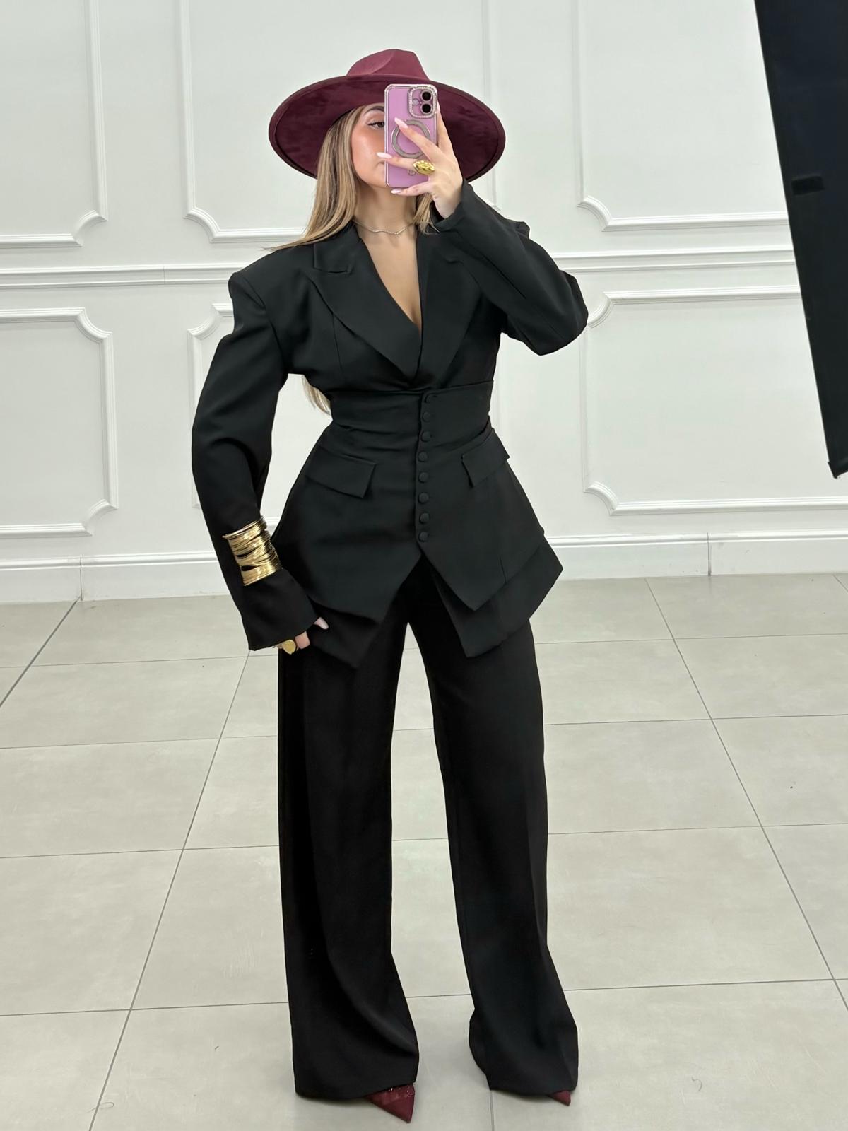 Tailleur composto da giacca pantalone e panciotto con fiocco posteriore